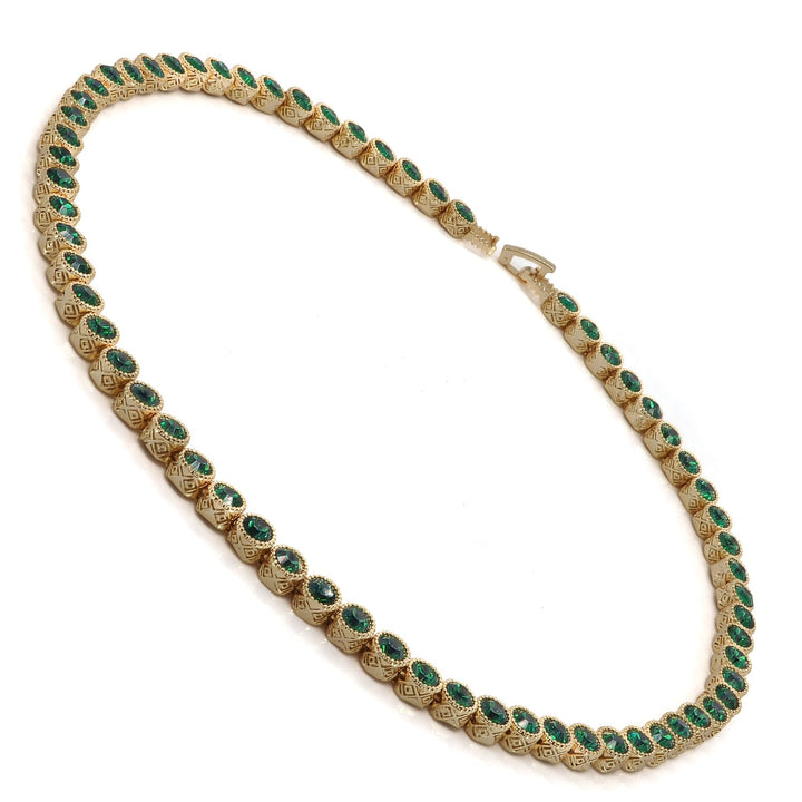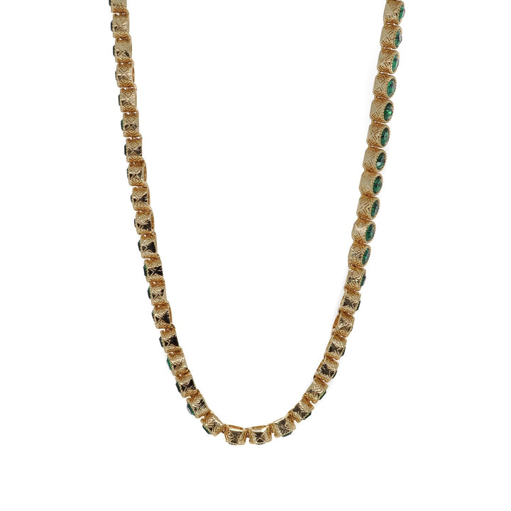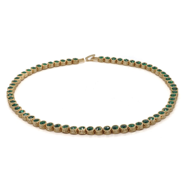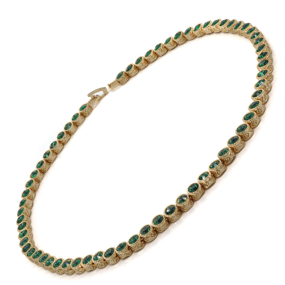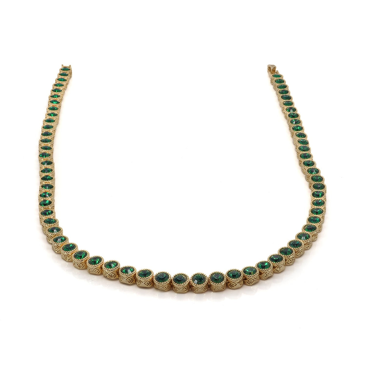 This choker necklace is crafted on a bronze base with gold plating and features natural emerald stones. The necklace is 16 inches long.