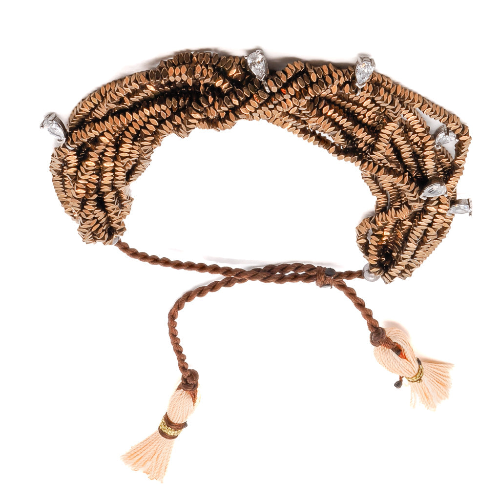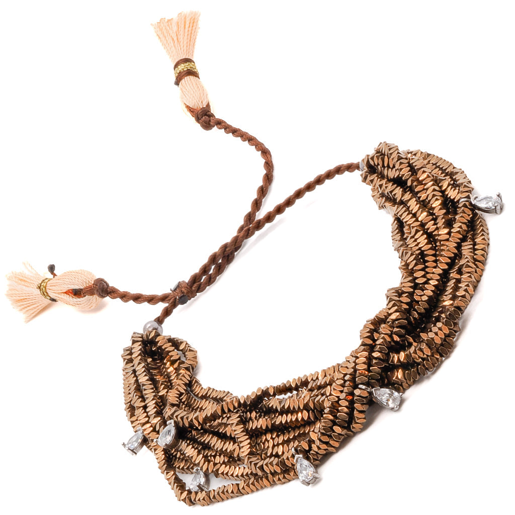 This adjustable bracelet is made with bronze-colored hematite stone beads, sterling silver Swarovski crystals, and cotton tassels.