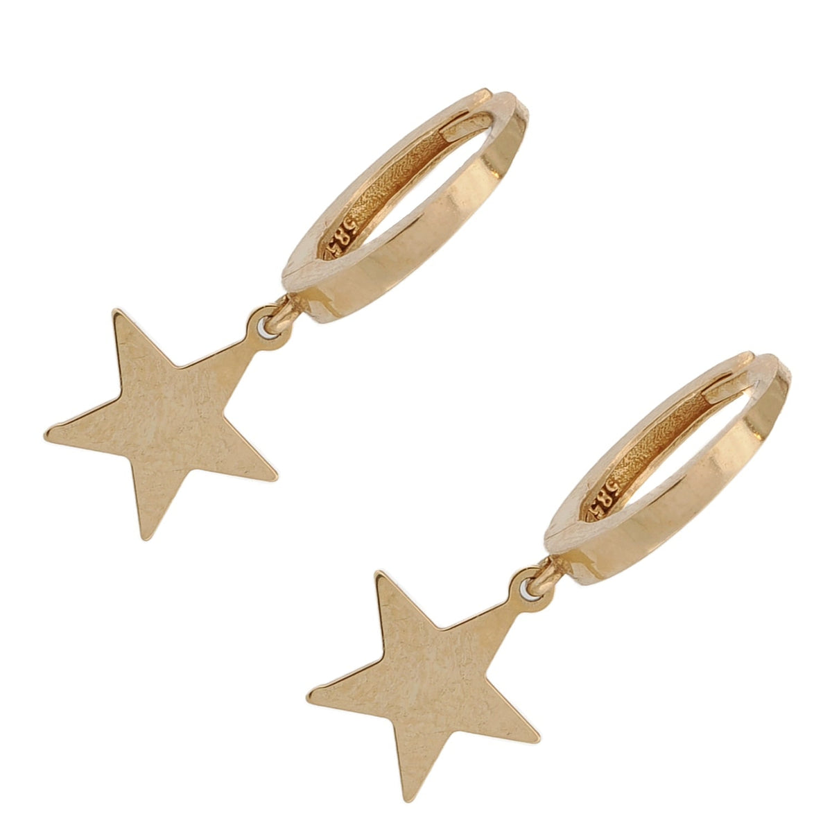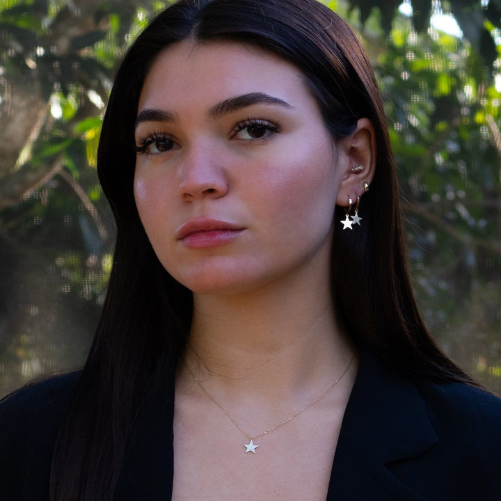 The Celestial Grace Solid Gold Star Hoop Earrings - Gold by Ebru Jewelry are elegant hoop earrings that add a touch of celestial charm. They feature sleek gold hoops adorned with delicate star charms, symbolizing guidance and hope. Crafted from 14k yellow solid gold, they are lightweight and perfect for everyday wear.