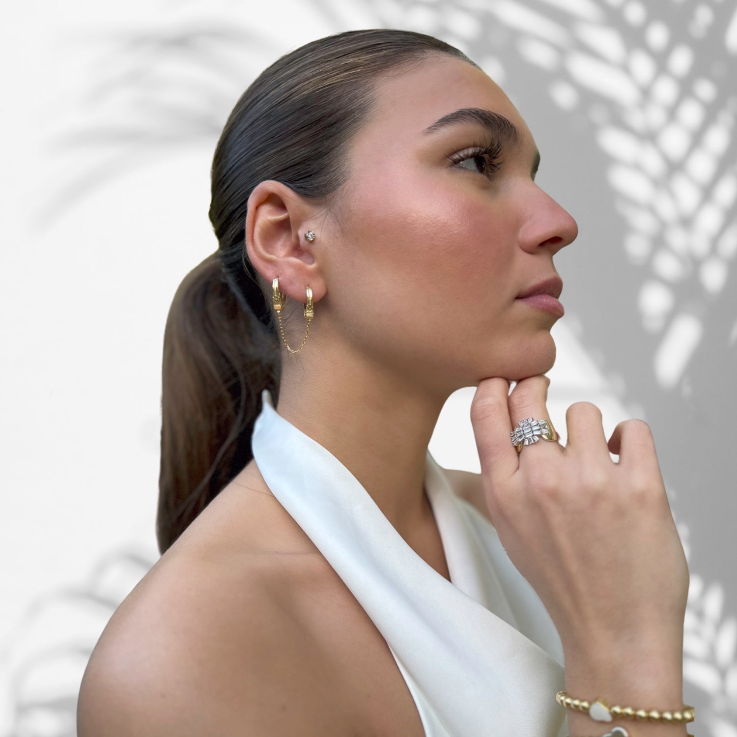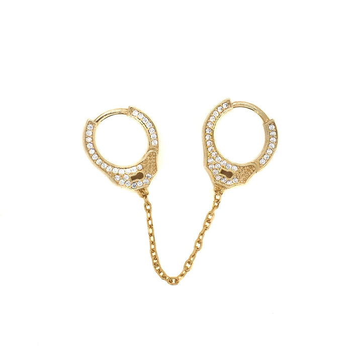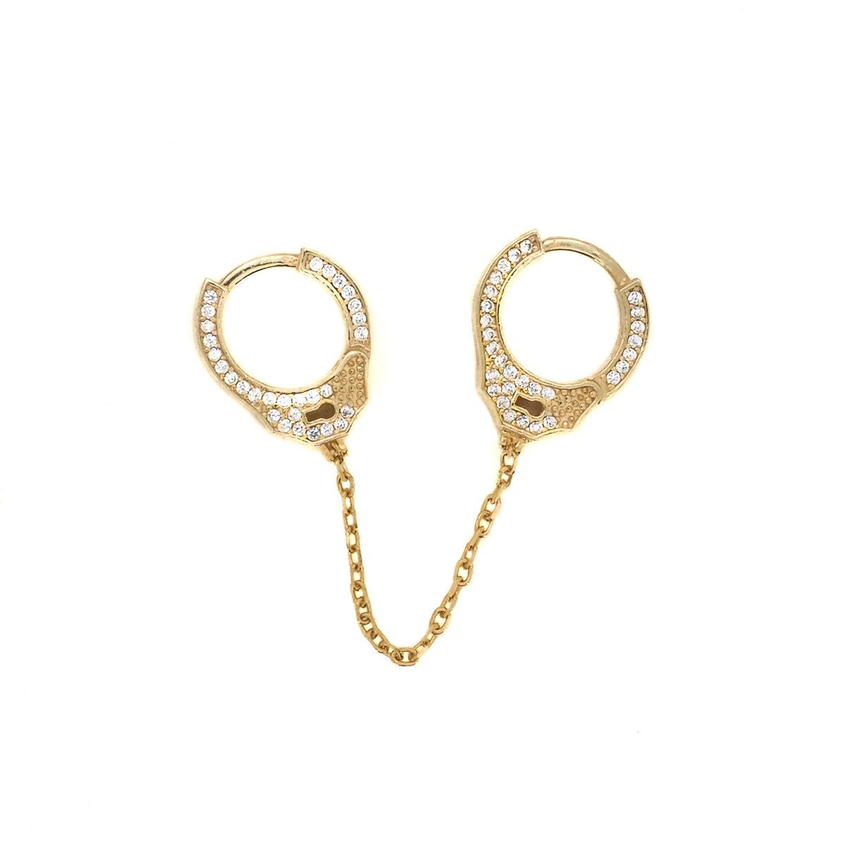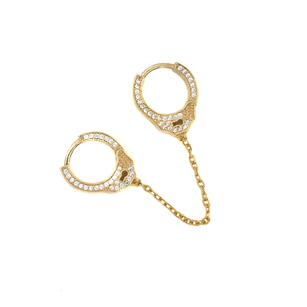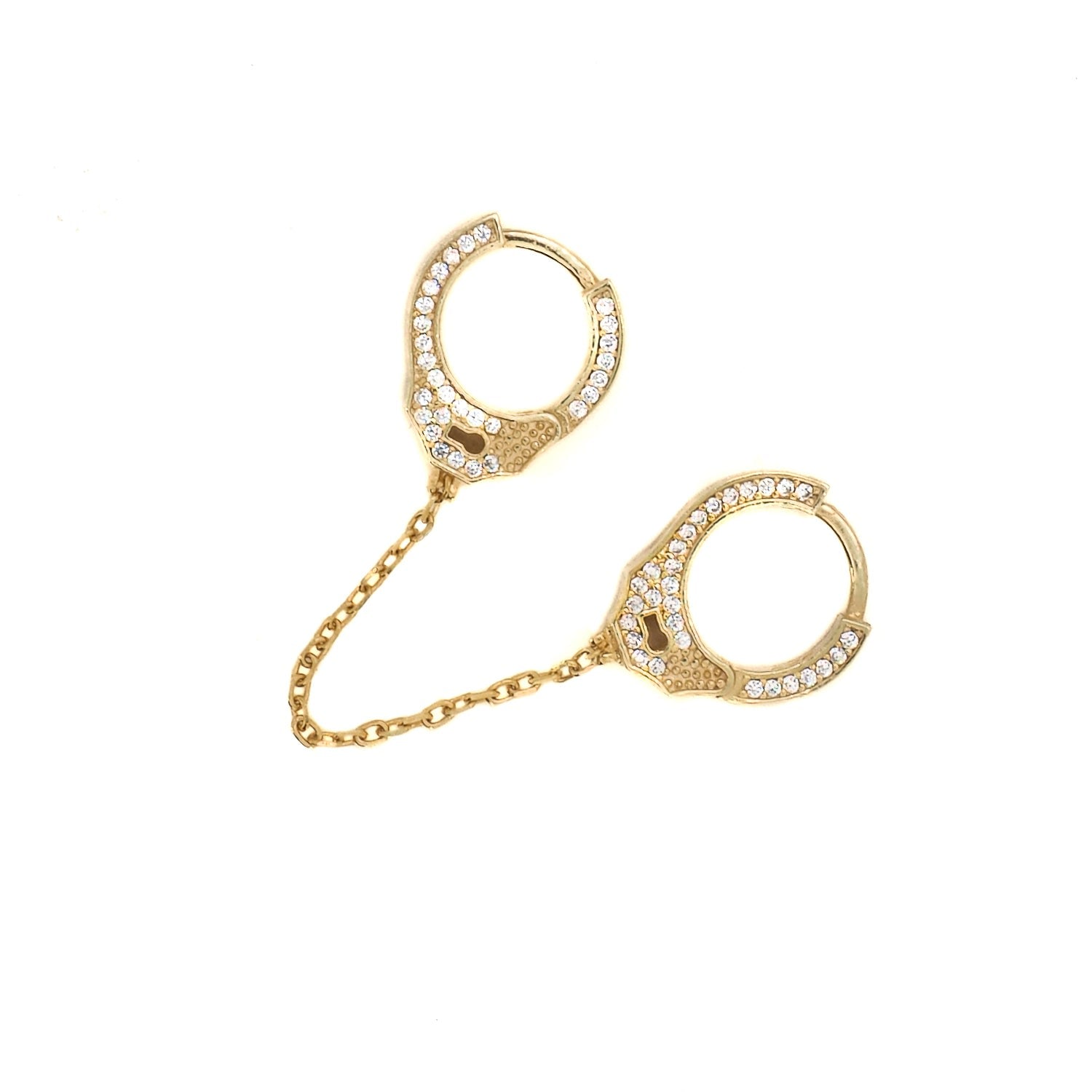 The Gold & Diamond Handcuff Design Earring by Ebru Jewelry is a bold and contemporary ear cuff. It is specifically designed for double-pierced ears and features a handcuff motif with a delicate chain connecting them. Adorned with pave cubic zirconia diamonds, it adds a touch of glamour and sophistication.
