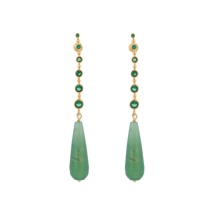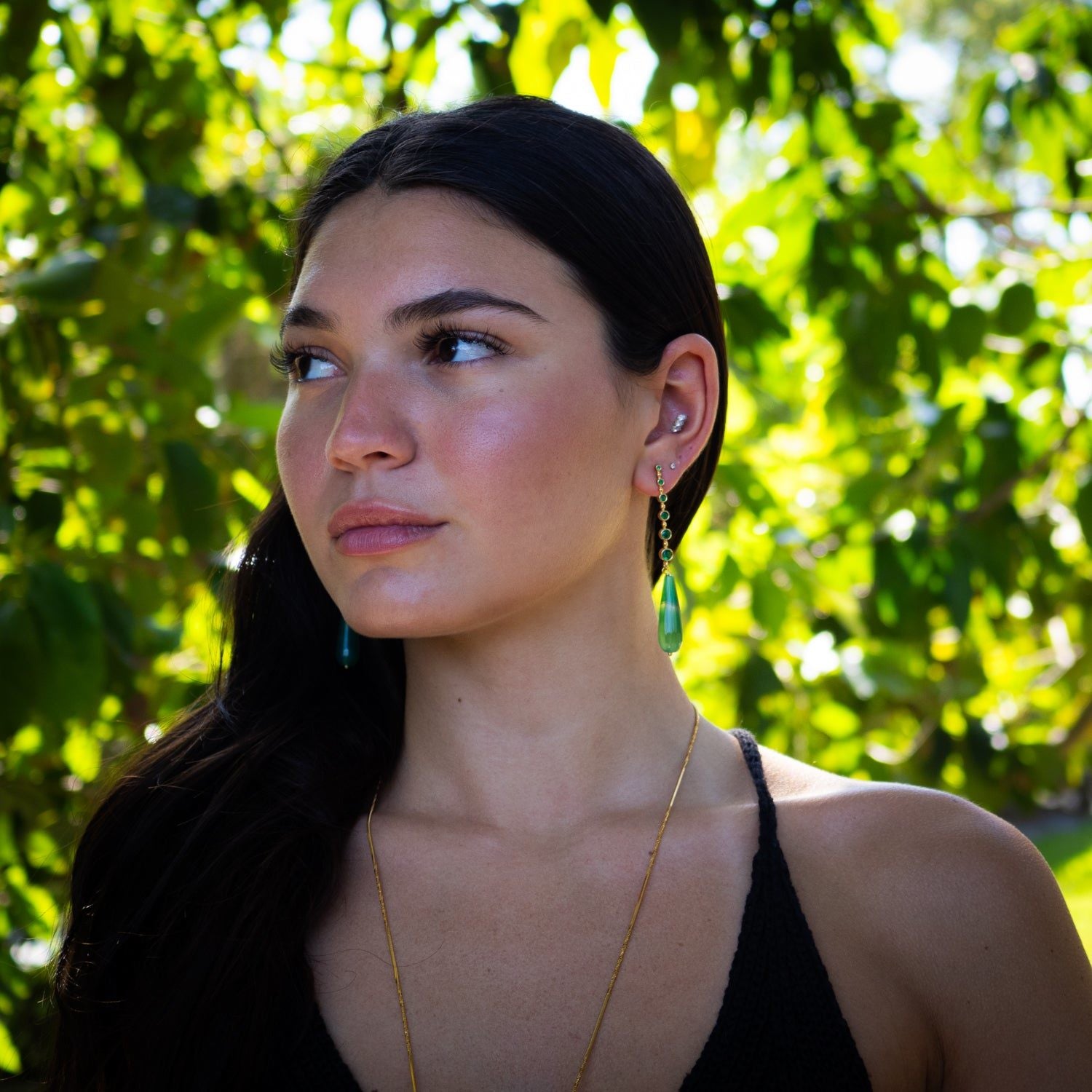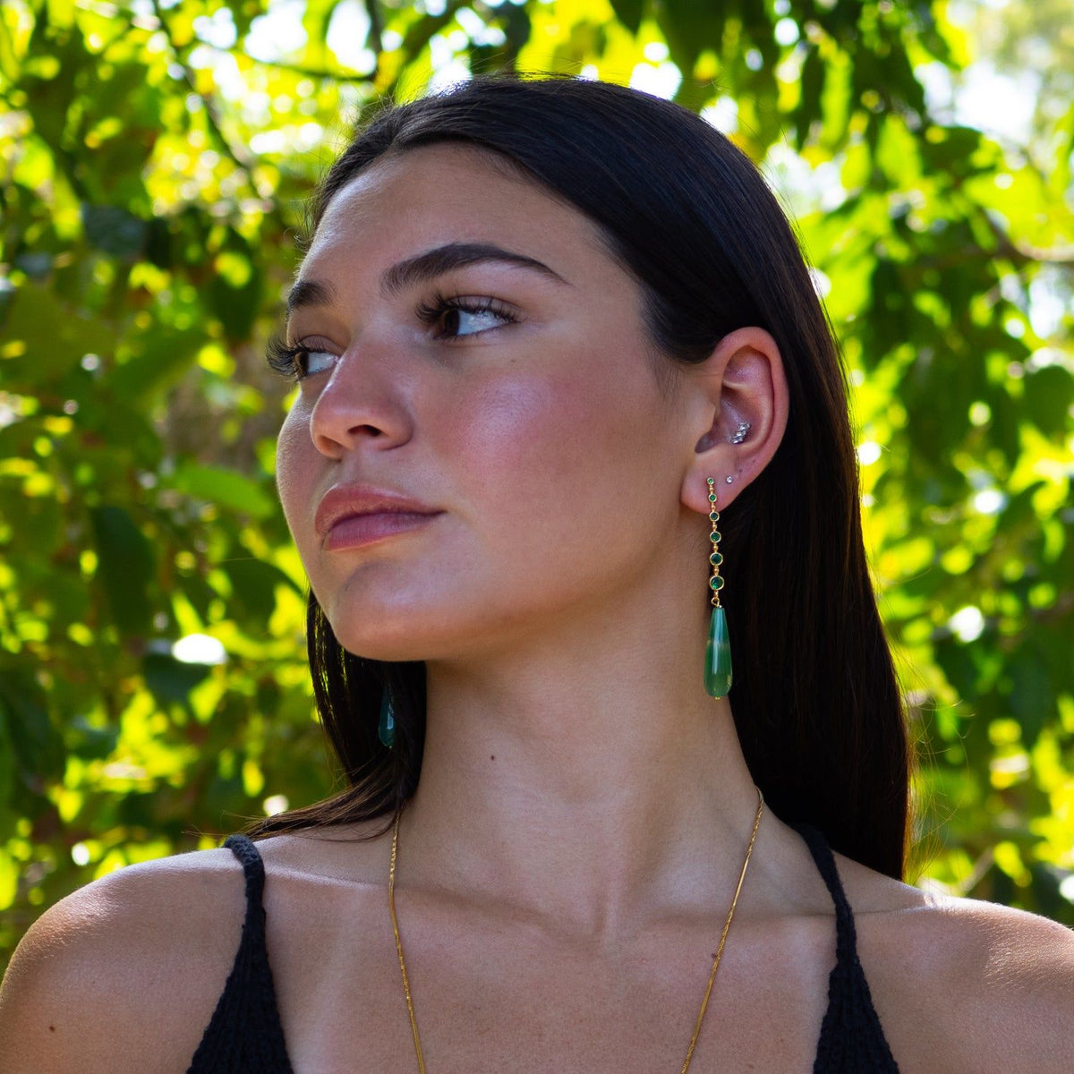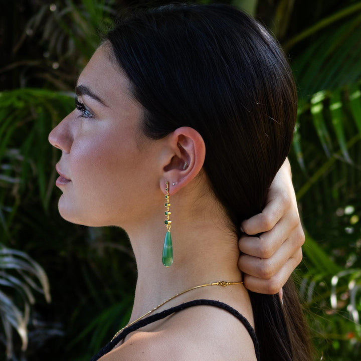 The Mystic Energy Jade Teardrop Earrings by Ebru Jewelry are elegant dangle earrings with a bohemian and spiritual charm. They feature natural green jade teardrop stones known for their healing properties, hanging from a row of sparkling green crystals. These earrings bring together harmony, intention, and timeless design.