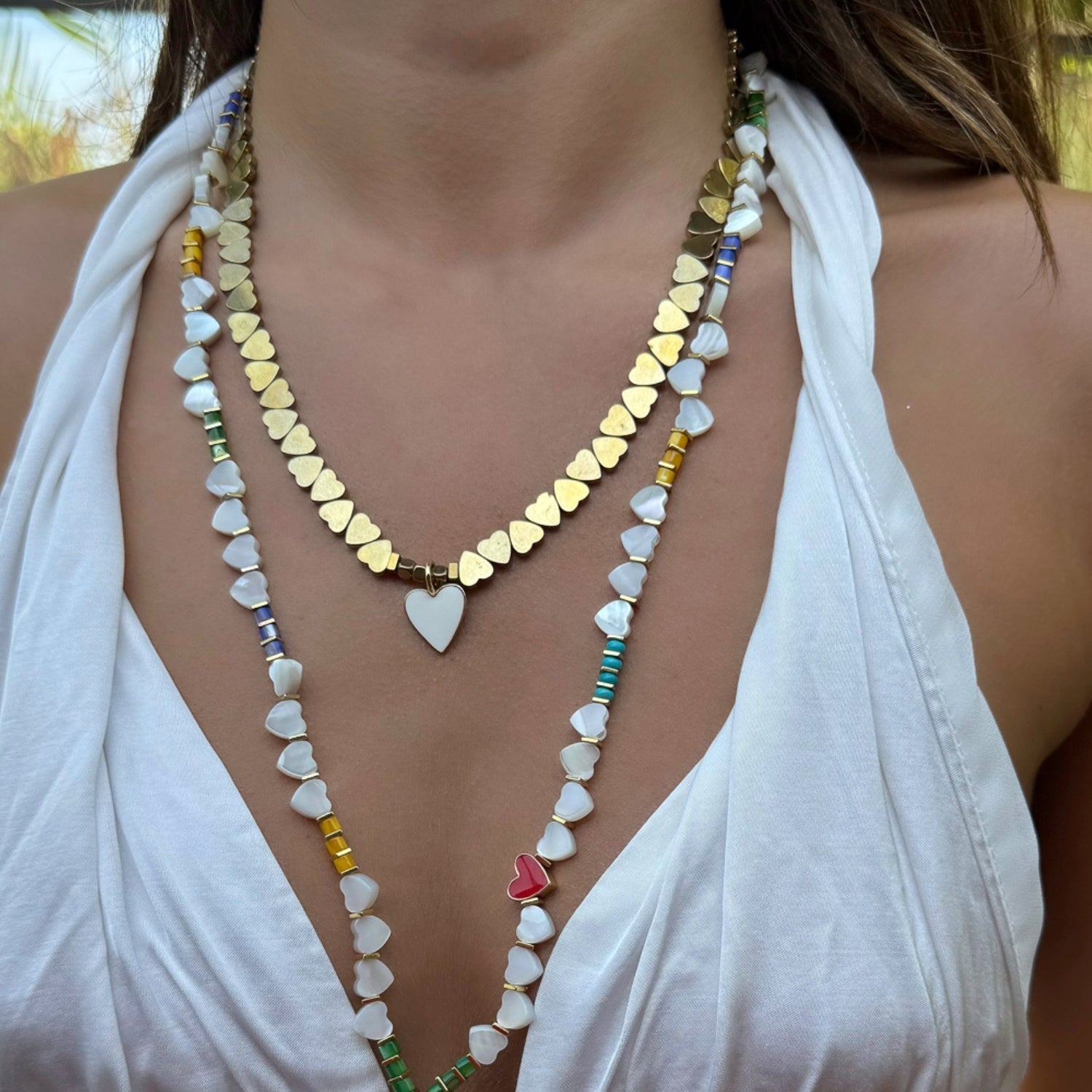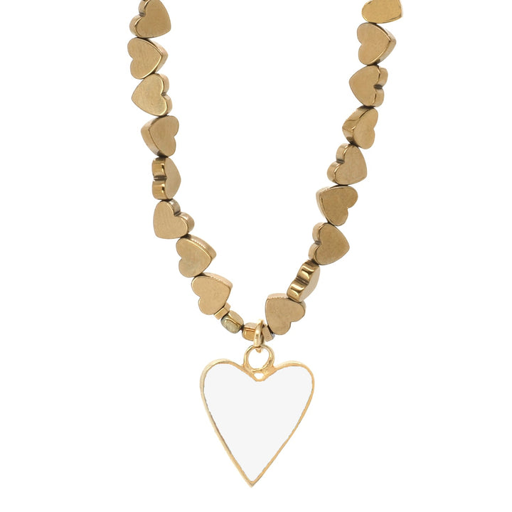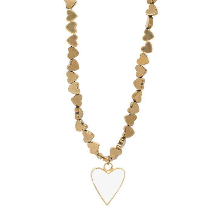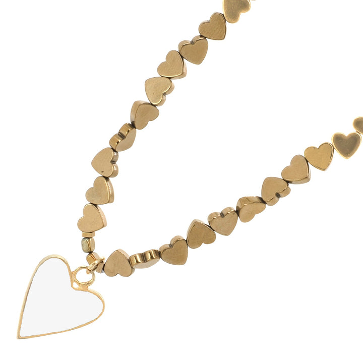 This necklace is handmade with gold-colored heart-shaped hematite stone beads, a gold-plated heart pendant with white enamel, and an 18k gold-plated heart extender.
