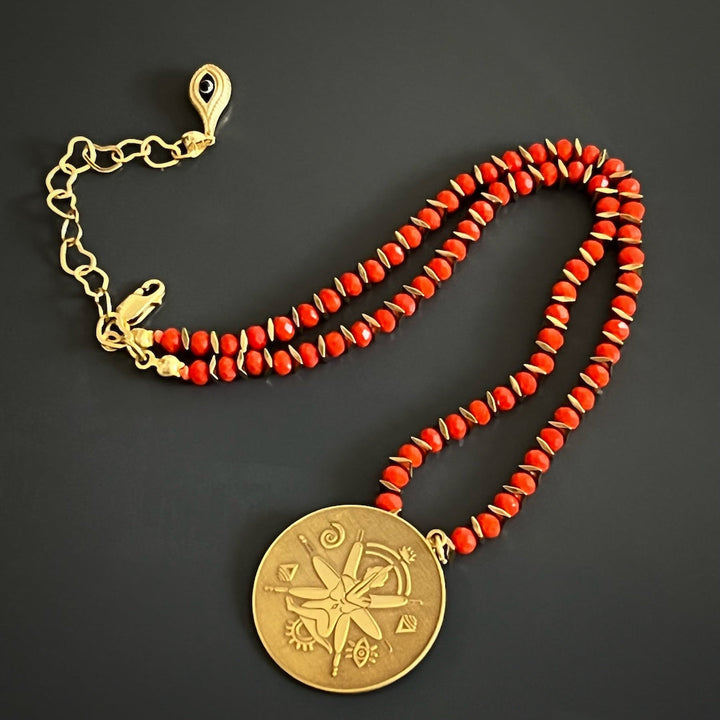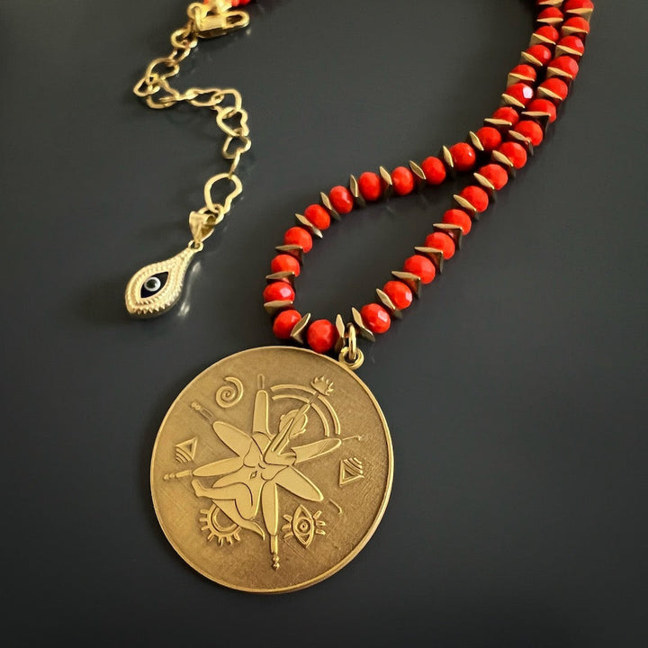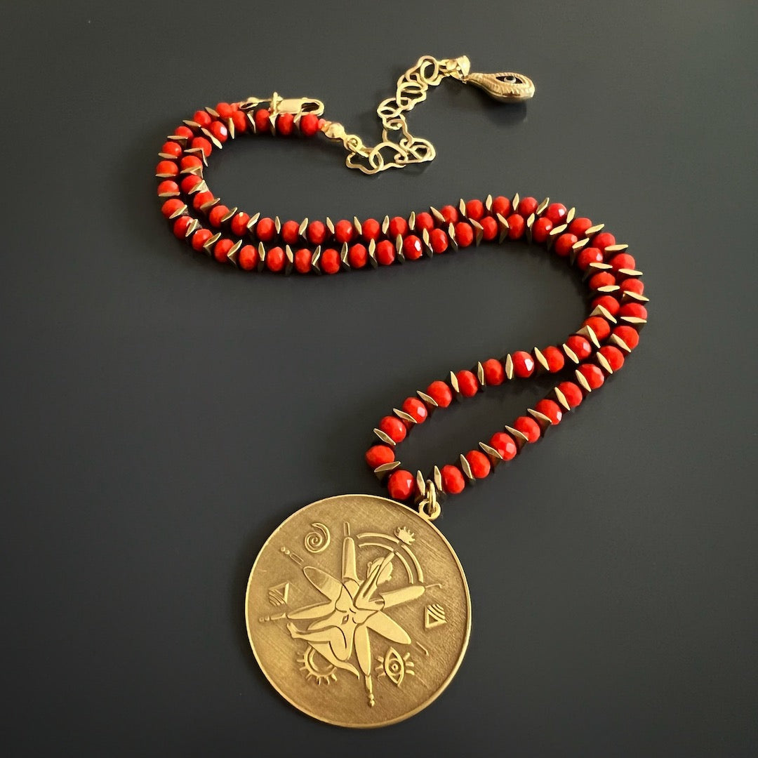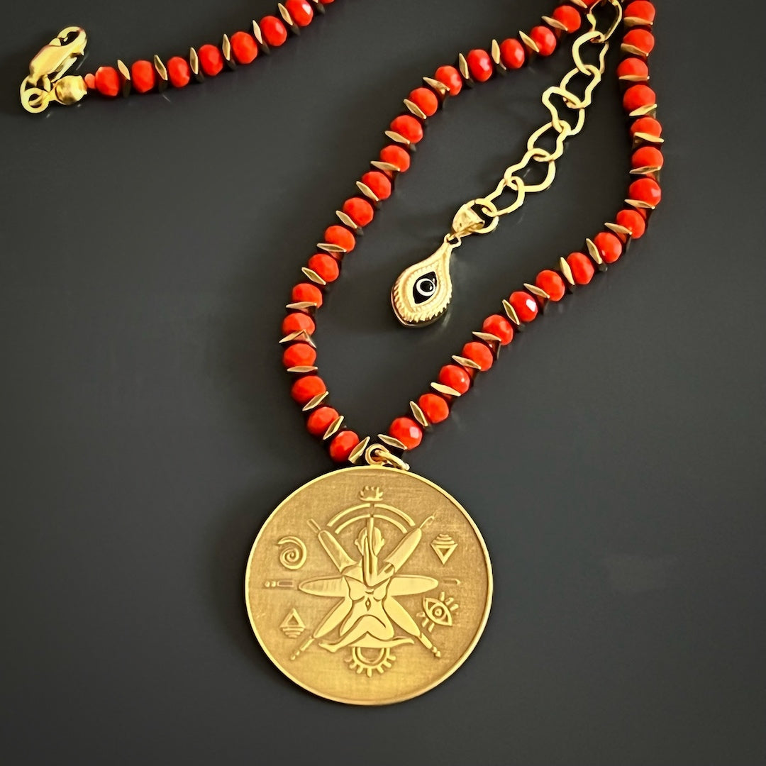 The Spiritual Journey Red & Gold Beaded Choker Necklace by Ebru Jewelry is a handmade choker necklace full of symbols to protect you and bring good luck. It features a sterling silver and 18k gold vermeil pendant, red crystal beads, and hematite stone spacers. This powerful piece is designed to invite good energy.