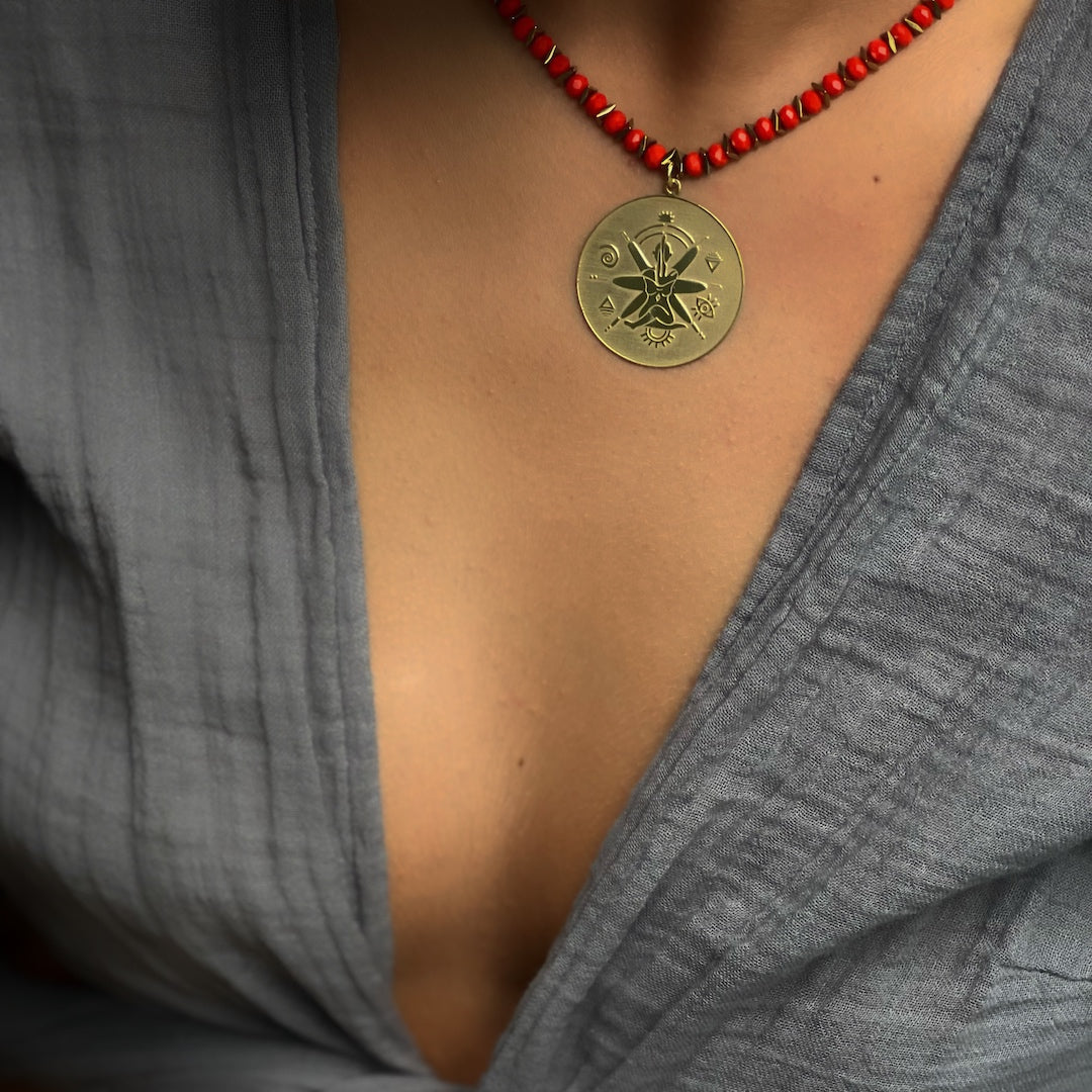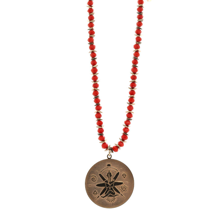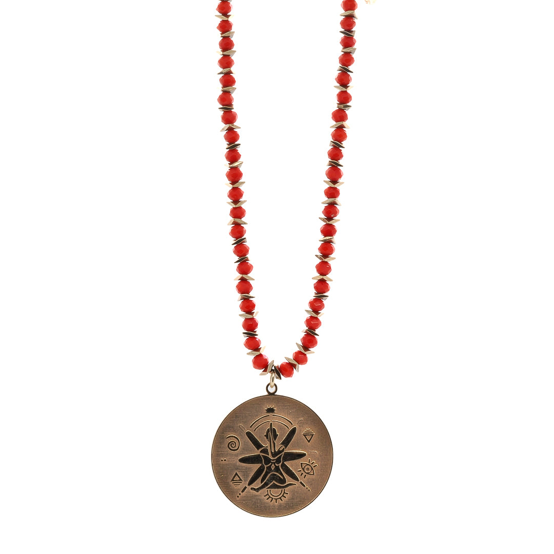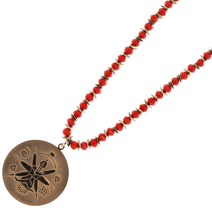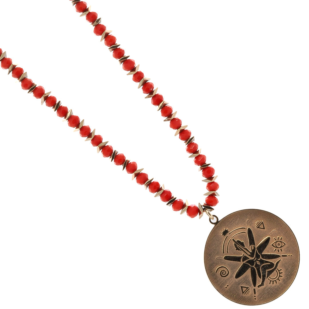 The Spiritual Journey Red & Gold Beaded Choker Necklace by Ebru Jewelry is a handmade choker necklace full of symbols to protect you and bring good luck. It features a sterling silver and 18k gold vermeil pendant, red crystal beads, and hematite stone spacers. This powerful piece is designed to invite good energy.