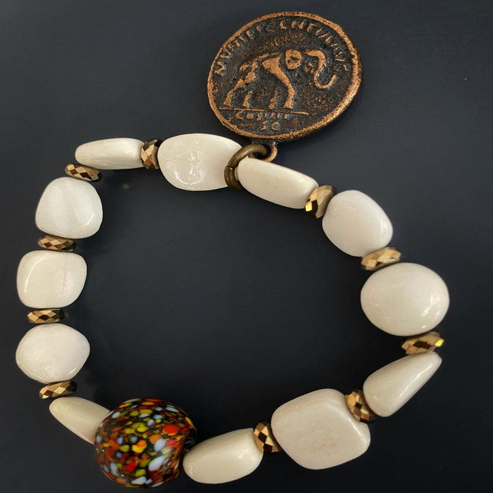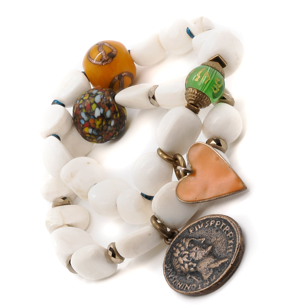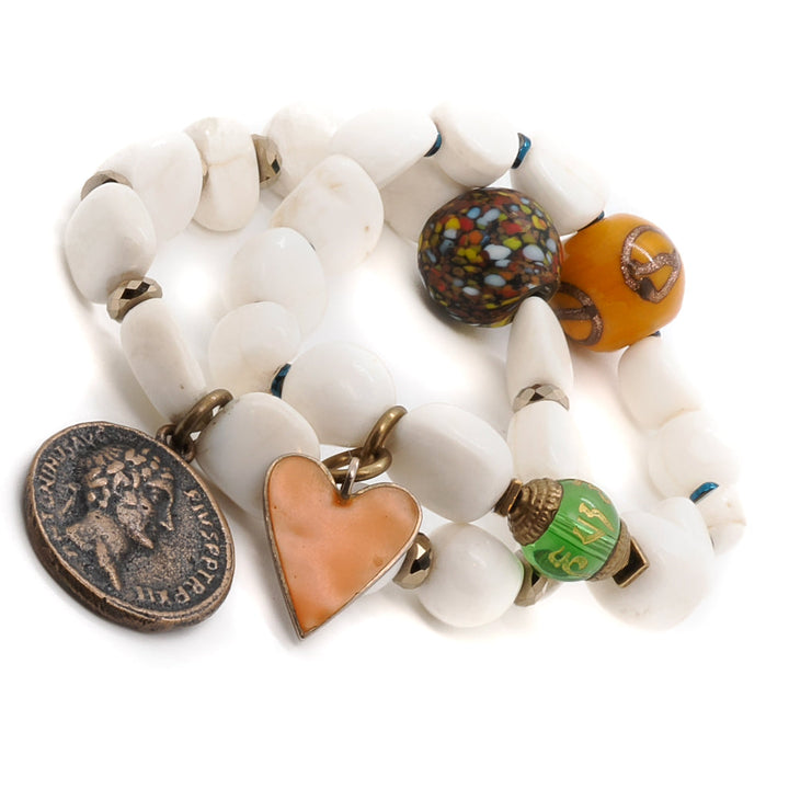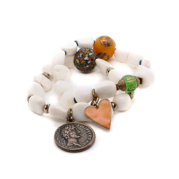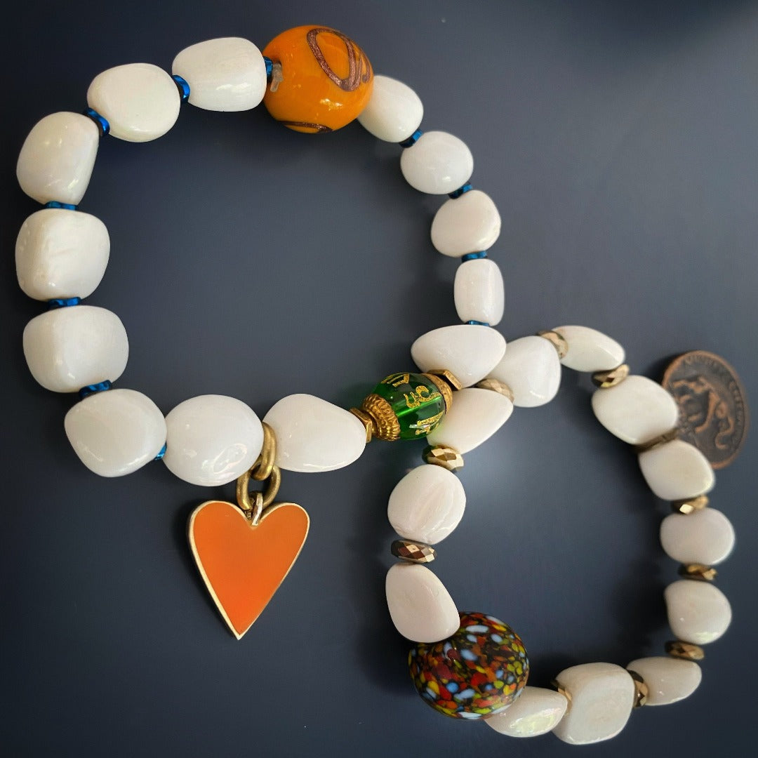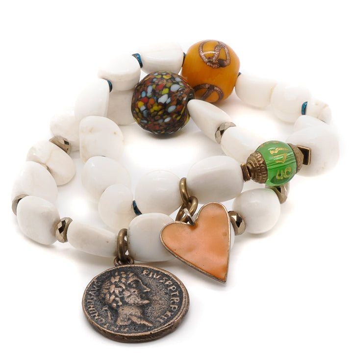 This set includes two bracelets. One has Tibetan White Stone beads, a yellow and gold Nepal bead, a mantra bead, blue hematite spacers, and a silver gold-plated heart charm. The second has Tibetan White Stone beads, gold-faced hematite spacers, a colorful Nepal bead, and a bronze elephant charm. Both are size 6.5 inches.