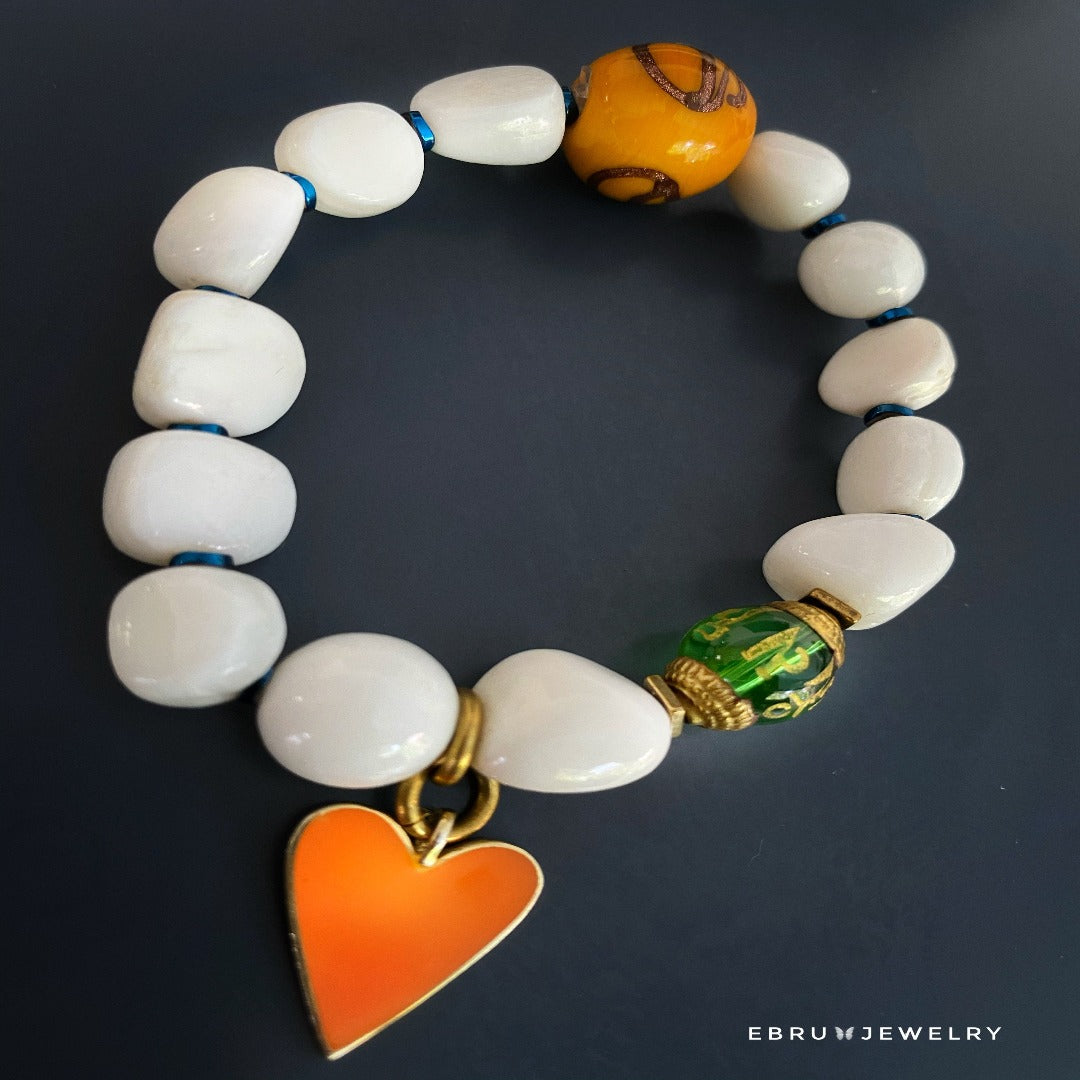 The White Beaded Yellow Heart Zen Bracelet Set by Ebru Jewelry is a unique and spiritual accessory. This set includes two handmade bracelets, one with Tibetan White Stone Beads and a yellow heart charm, and the other with a bronze elephant charm. The set promotes peace and is a beautiful way to express your spirituality.