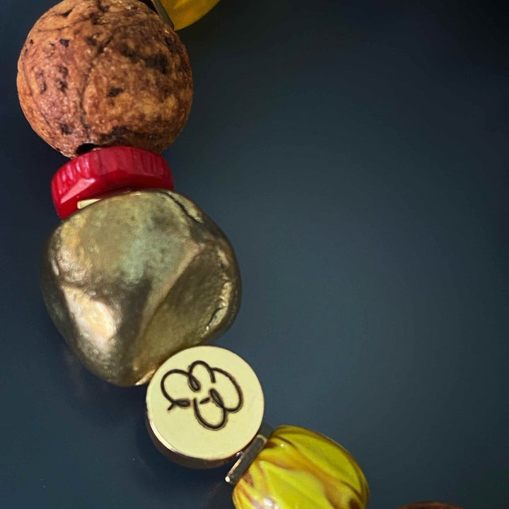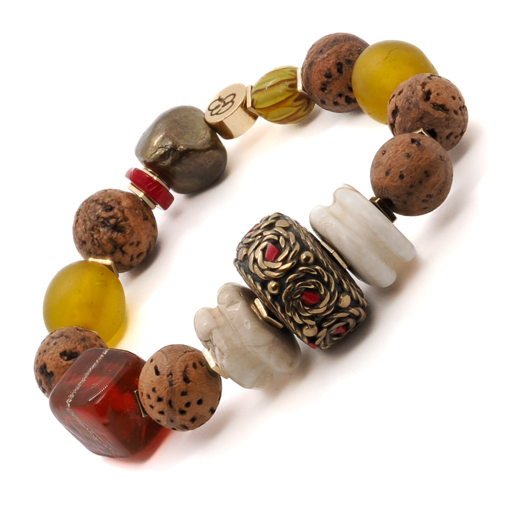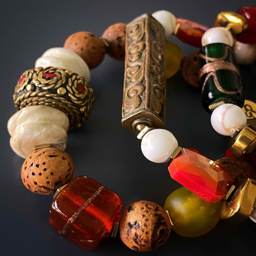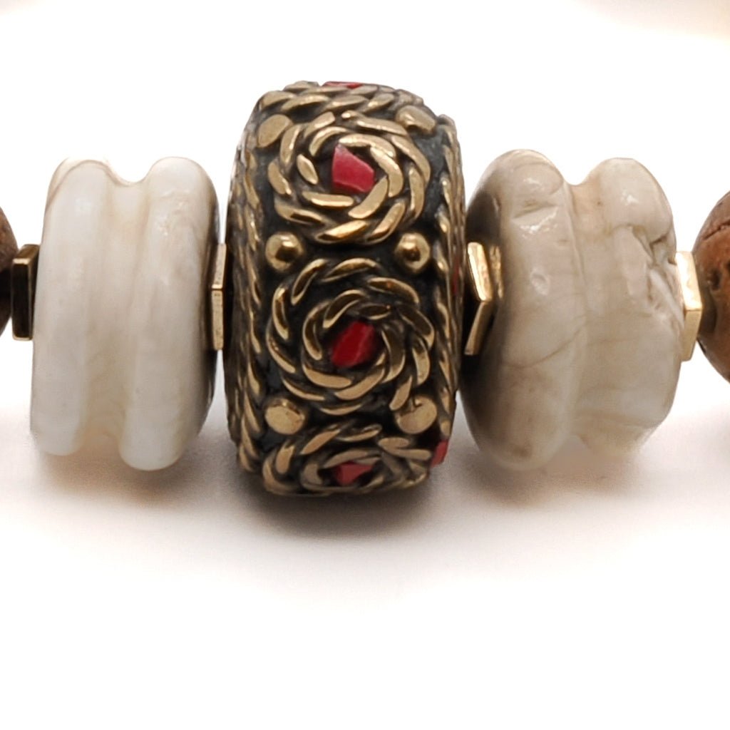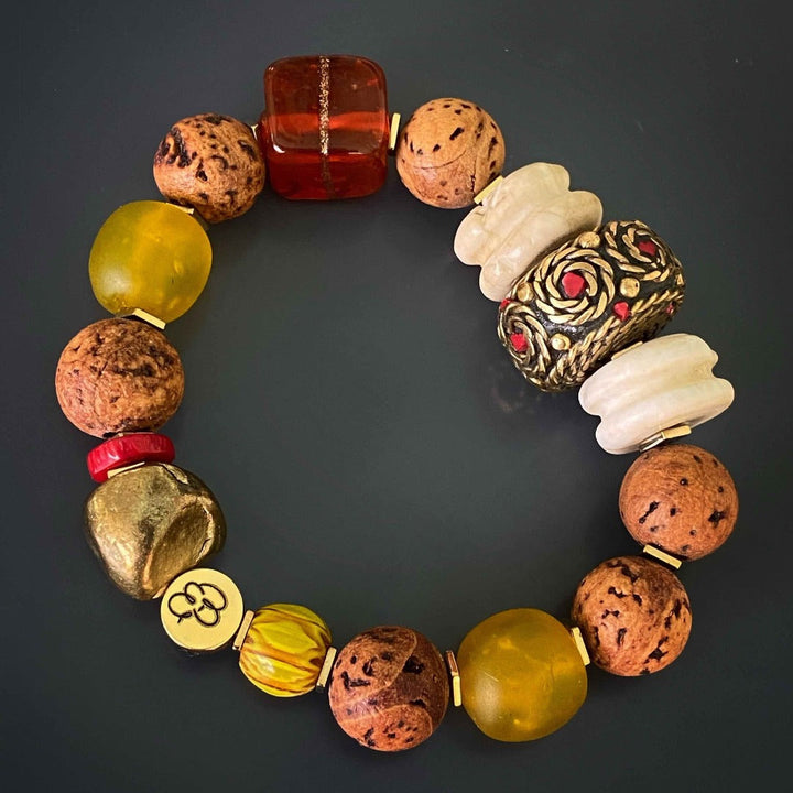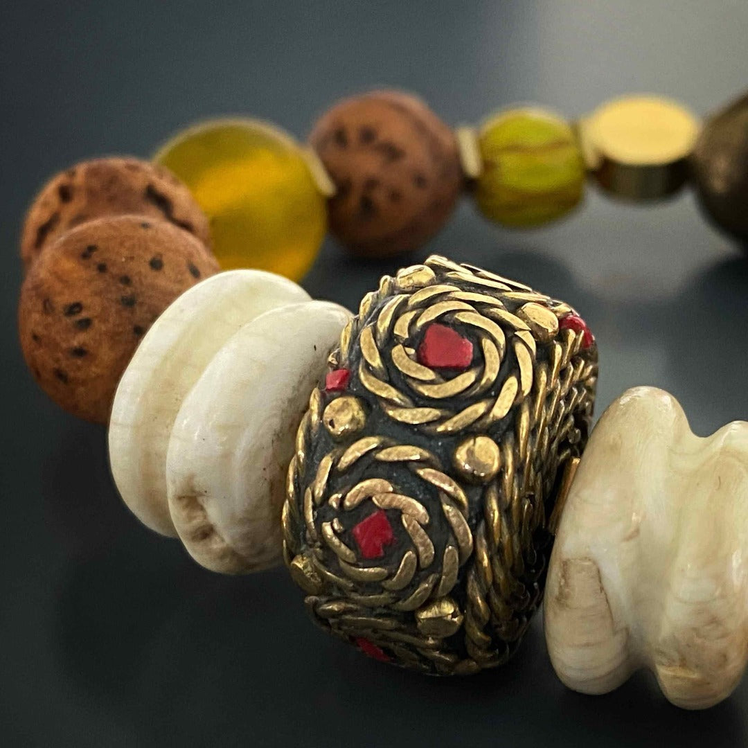 This handmade bracelet features 10mm natural Nepal seed beads, 12mm Tibetan bone beads, 10mm green-yellow glass African beads, and a large Tibetan handmade brass bead with red coral. It is 6.5 inches in size.