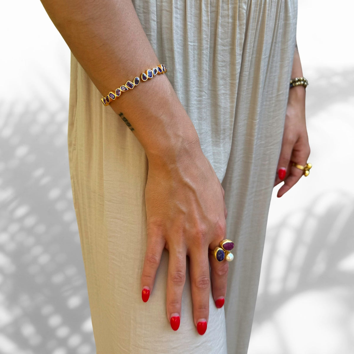 This bangle is crafted from high-quality brass and plated with 24k gold. It features amethyst stones. The bracelet size is 7.