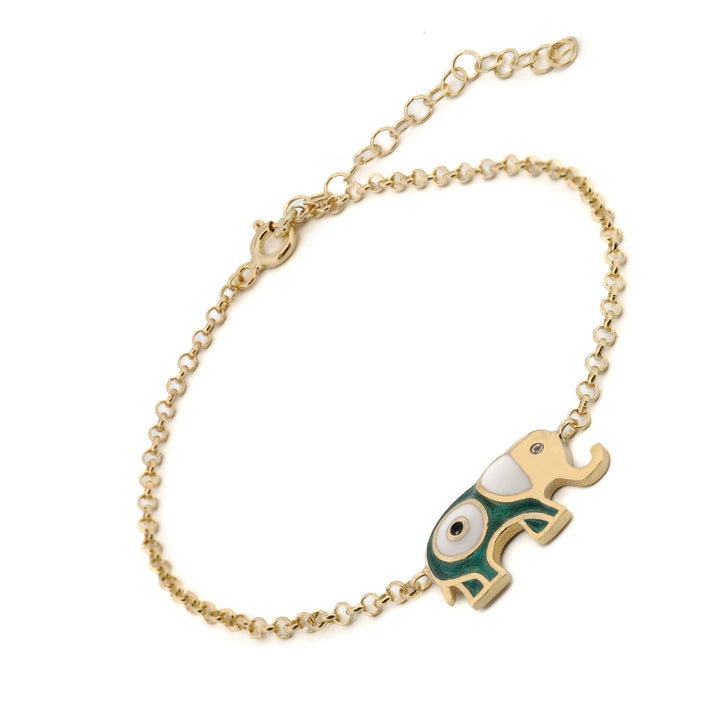 Wishful Elephant & Evil Eye Green Enamel Gold Chain Bracelet - Green