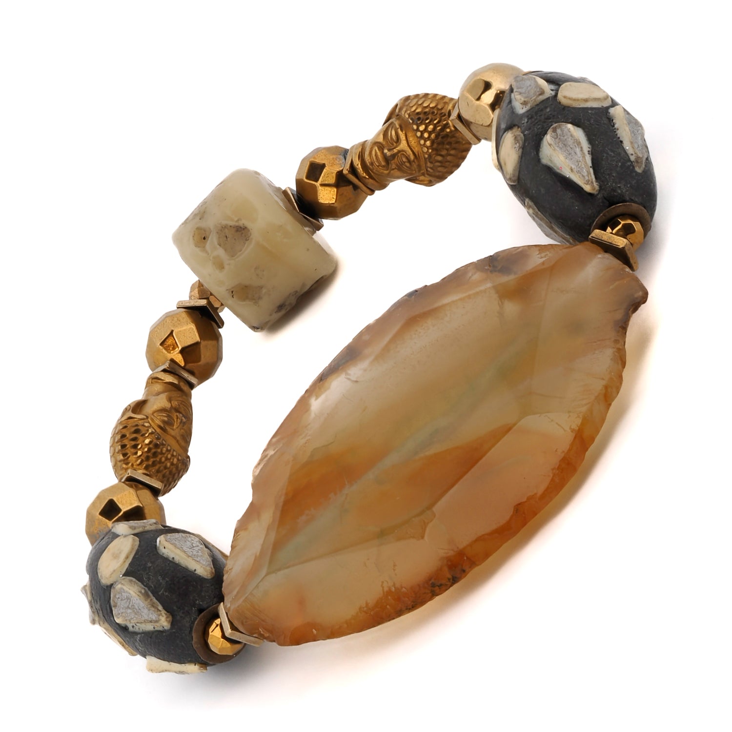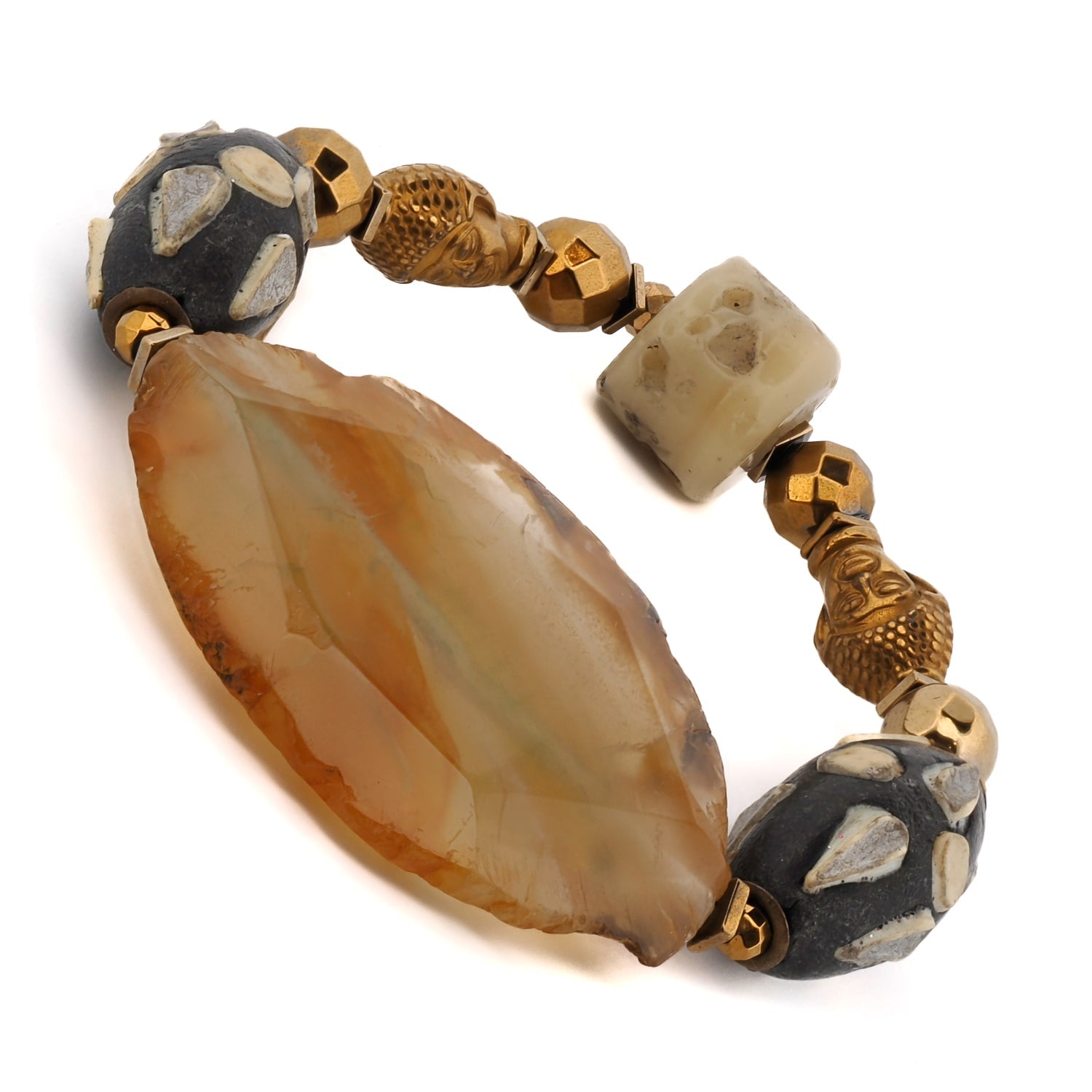 This beaded bracelet is made of agate stones, gold hematite stones, and gold hematite Buddha beads. It also features Nepal large beads and measures 6.5" in size.