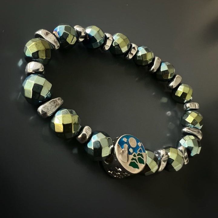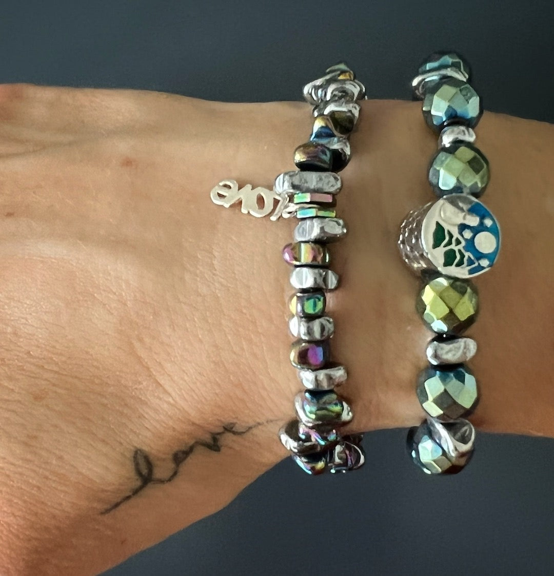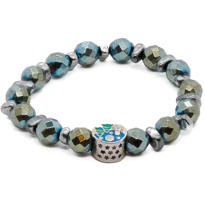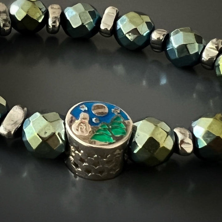 This bracelet is handmade with 8mm faceted green hematite stone beads, silver hematite nugget beads, and a 925 sterling silver star bead. The bracelet size is 6.5 inches.