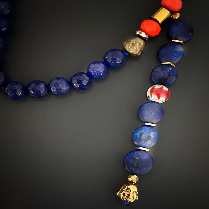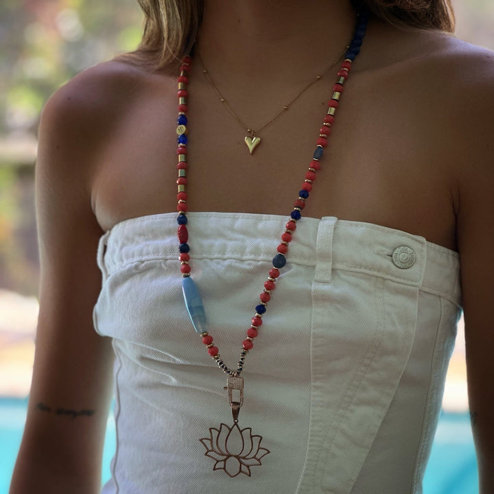 This Lotus Flower Mandala Beaded Necklace by Ebru Jewelry is a vibrant and spiritually significant accessory designed to support you on your journey toward enlightenment. The lotus flower pendant symbolizes rising above life's challenges, a core tenet of Buddhist philosophy. This handmade piece incorporates Lapis Lazuli, known for its protective qualities, and Blue Agate, a stone of tranquility and peace, making it a powerful and calming addition to any collection.