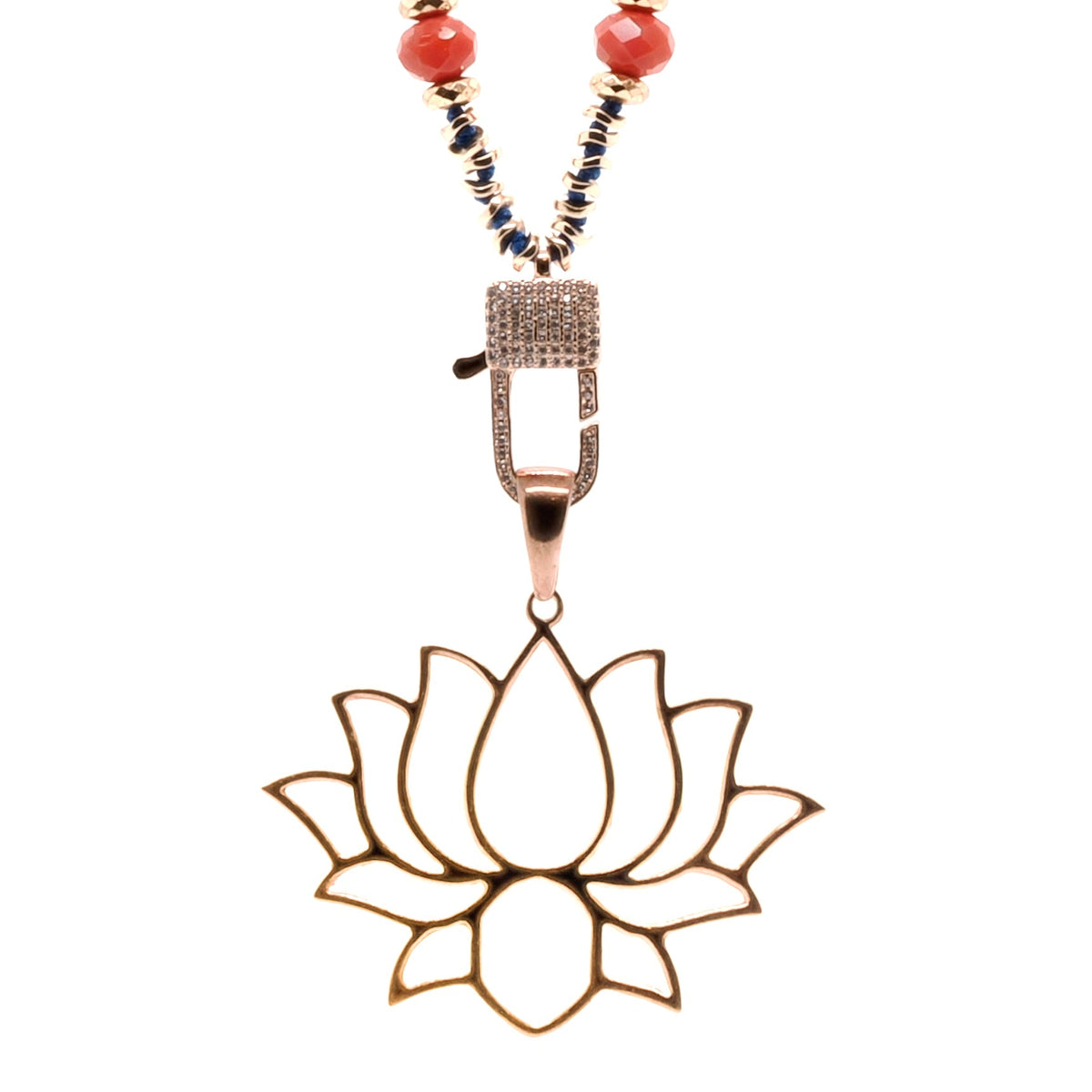 Made with 8mm Matte Blue Lapis Lazuli Beads and 6mm Orange faceted crystal beads, this necklace features a 925 sterling silver on 18K rose gold-plated lobster clasp and a 1-inch, 925 sterling silver on 18K rose gold-plated large lotus flower pendant. The total necklace length is 35 inches.
