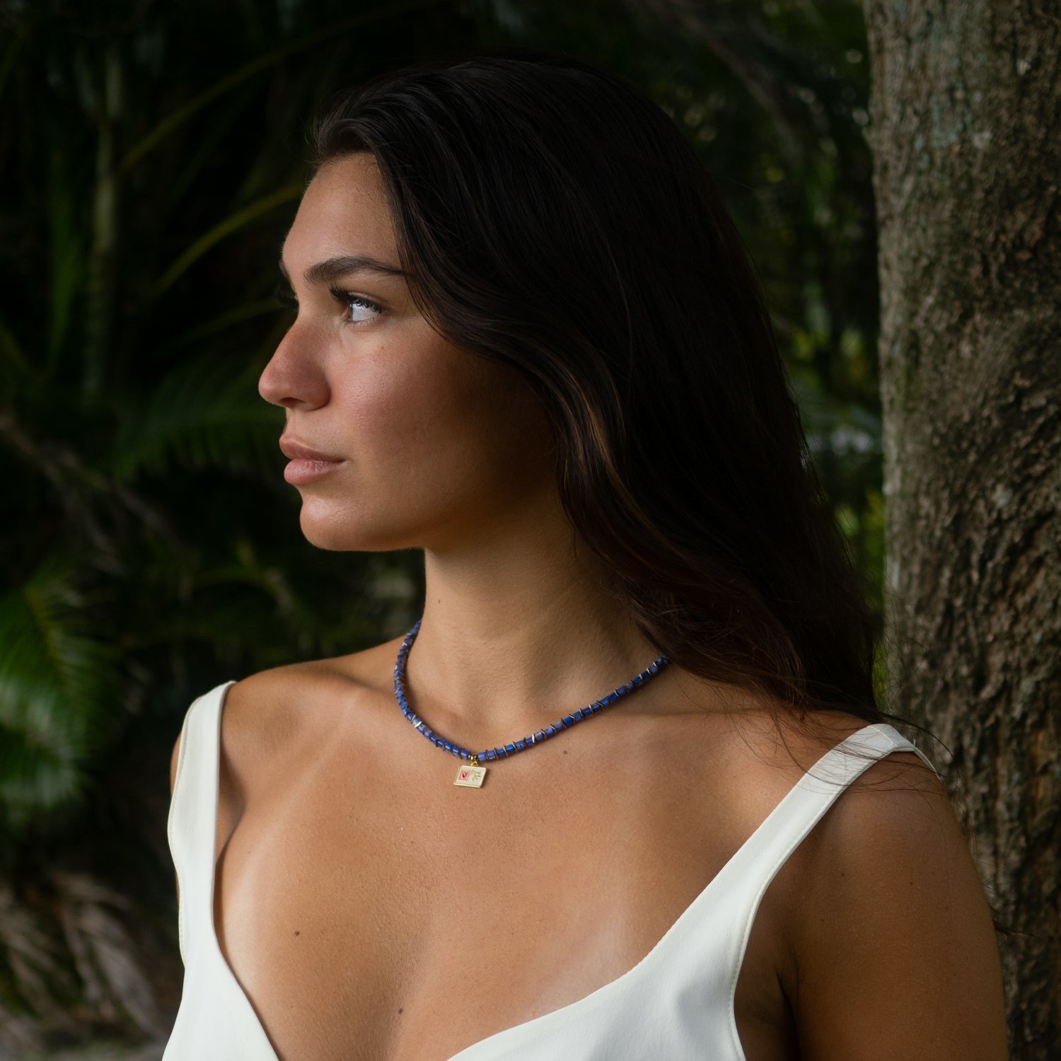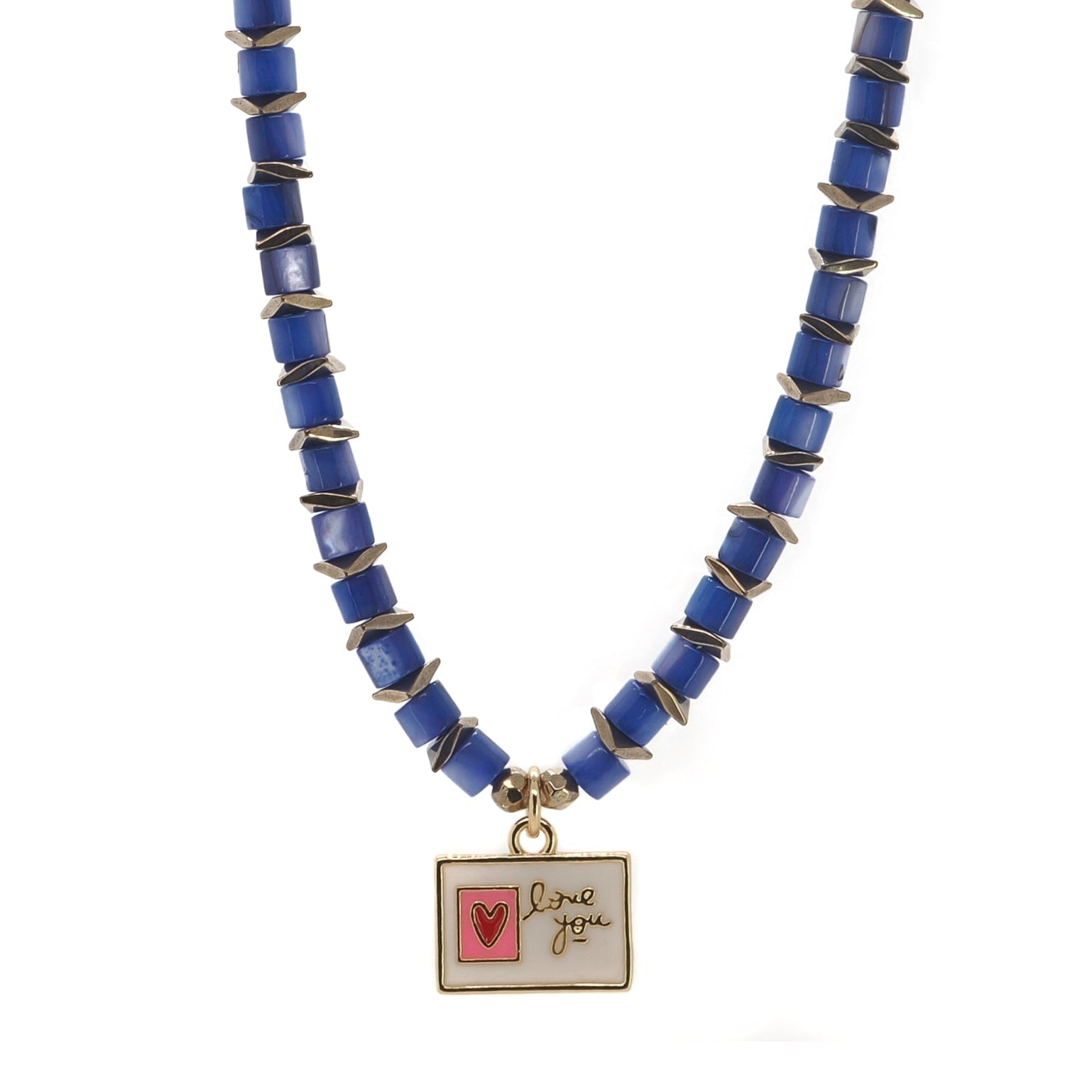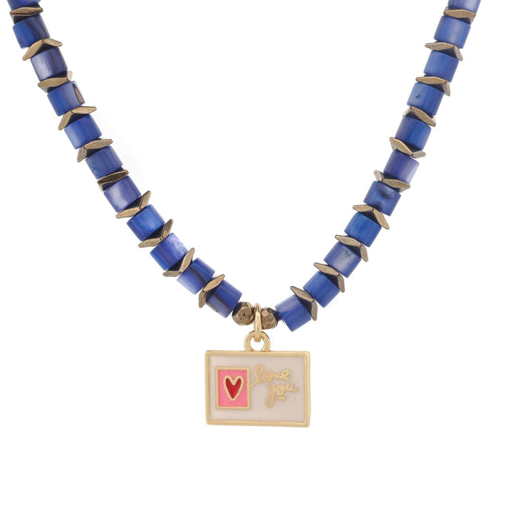 This Love You Enamel Heart Pendant Blue Choker Necklace by Ebru Jewelry is a dainty and modern piece designed to spread affection. It features a unique mix of vibrant purple-blue seed beads and gold hematite spacers, creating a stylish look. At its center, a rectangular pendant with a sweet pink and white enamel heart and the words "Love You" acts as a timeless reminder of connection, making it perfect for layering or wearing on its own.