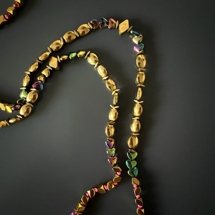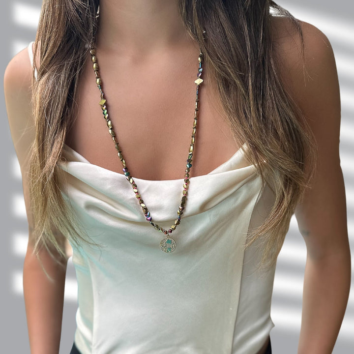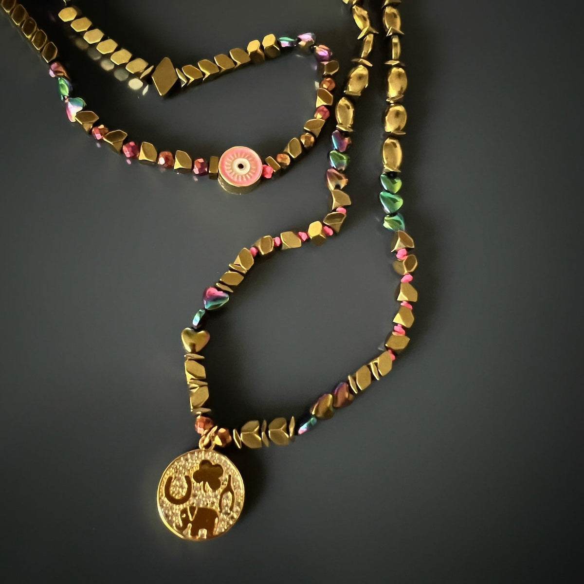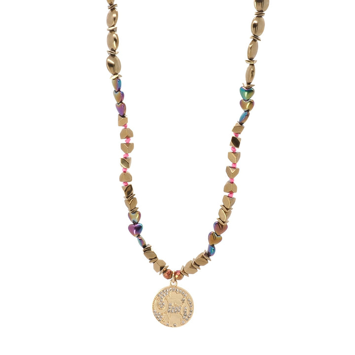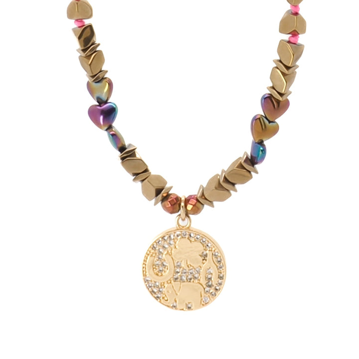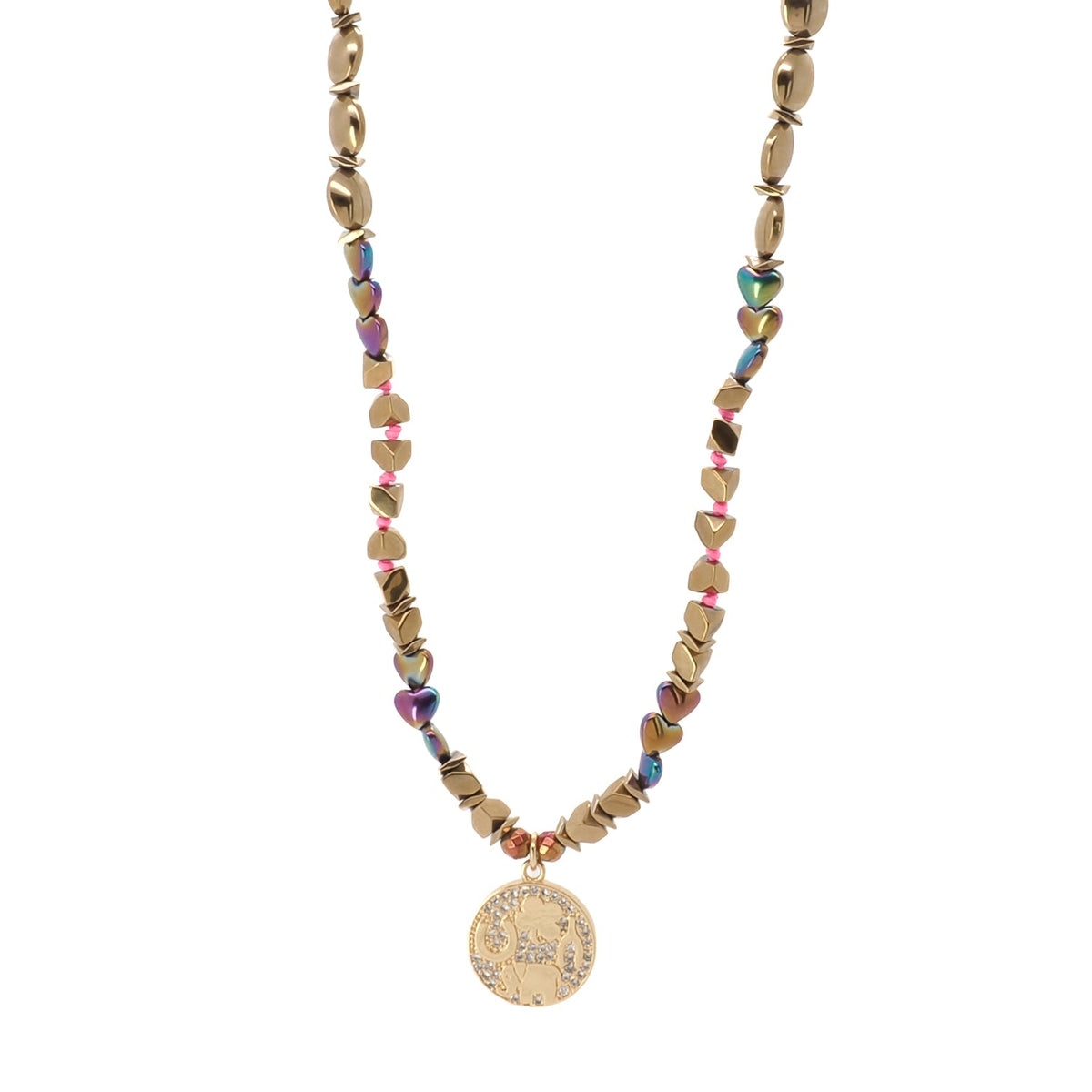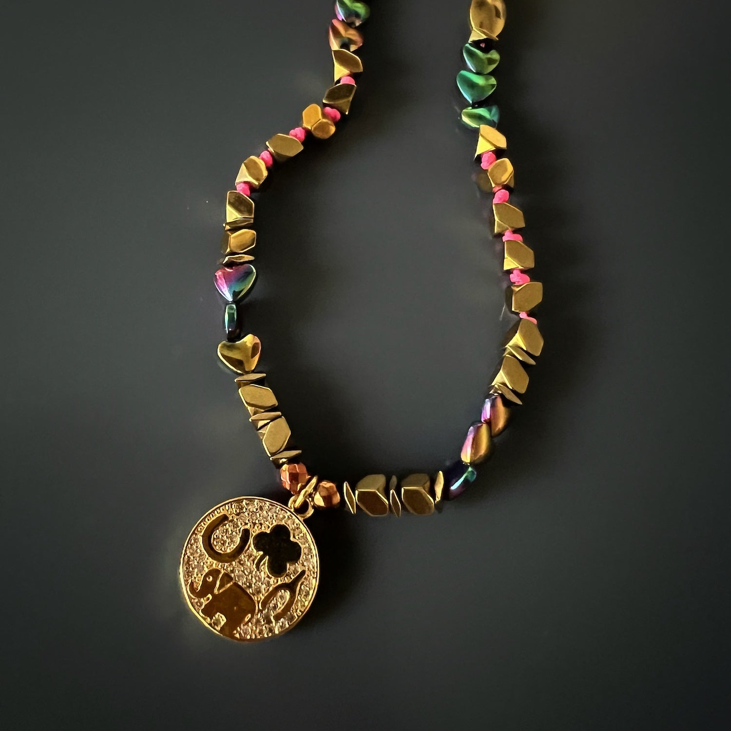 The Good Luck Symbol Design Pendant Hematite Beaded Necklace by Ebru Jewelry is a unique and eye-catching piece. The necklace is crafted with golden-colored hematite beads and multicolored heart-shaped beads, creating a playful and cheerful look. The centerpiece is a gold-plated pendant that showcases four popular symbols of luck: an elephant, a four-leaf clover, a horseshoe, and an ankh.