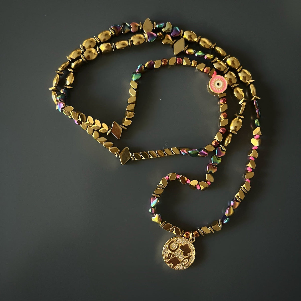 This beaded necklace is made with gold-colored hematite and multicolored heart-shaped beads. It features an 18-karat gold-plated pendant with zircon stones and an 18-karat gold-plated pink enamel evil eye bead. The necklace is 30 inches long.