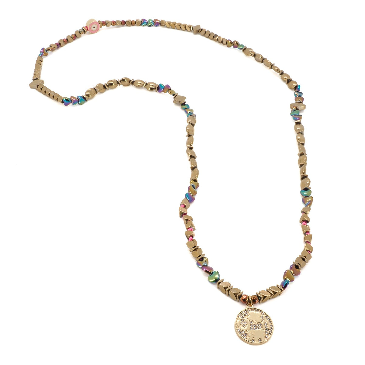 Good Luck Symbol Design Pendant Hematite Beaded Necklace - Gold