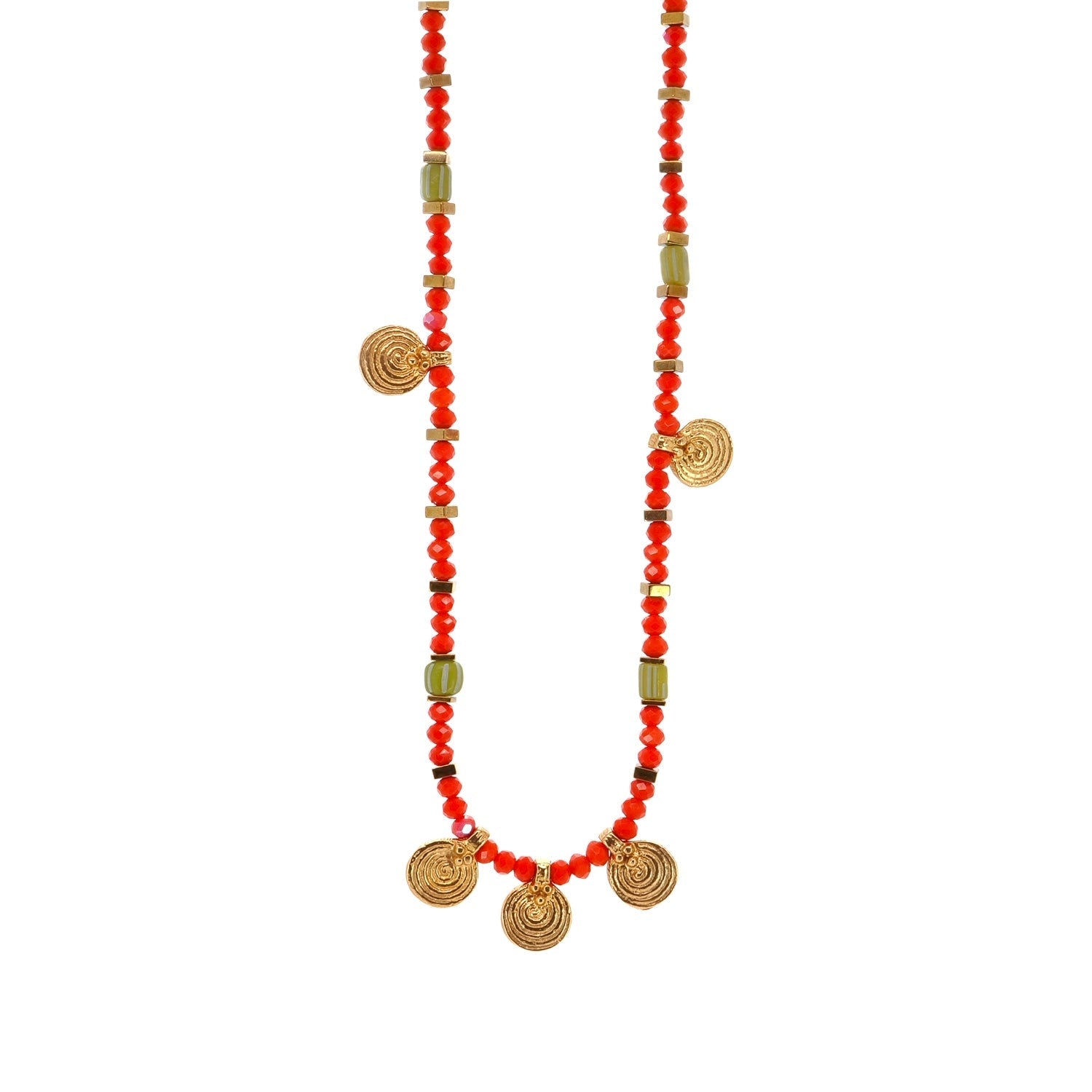 This necklace features 18-karat gold-plated spiral charms, orange crystal beads, green African beads, and gold hematite spacers. It is 16 inches long with a 1.5-inch extender.