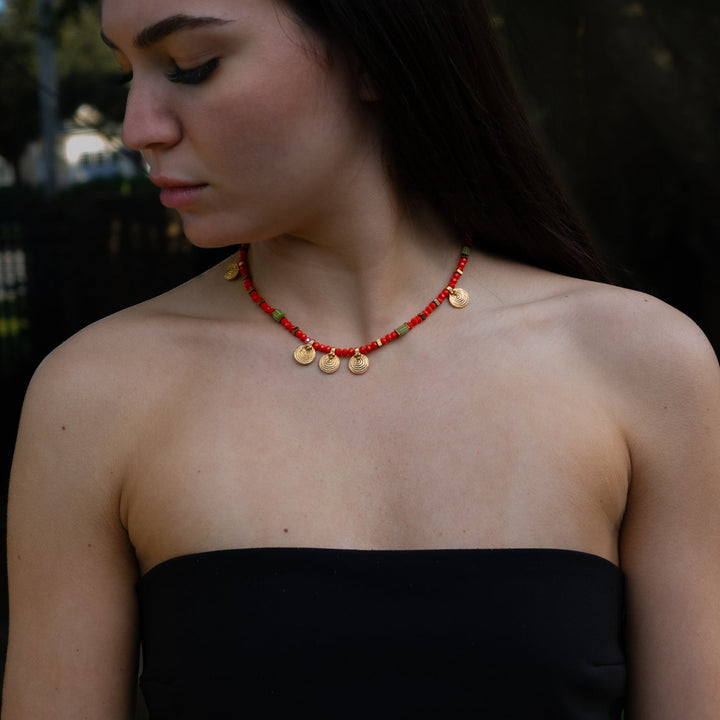 This Vibrant Energy Gold Spiral Charm Choker Necklace by Ebru Jewelry is a bold and colorful piece designed to energize your day. At its heart, five gold-plated spiral charms symbolize harmony and vitality. The necklace is strung with lively orange crystal beads and interspersed with green African beads, creating a dynamic and striking contrast. This choker is perfect for a trendy layered look or as a singular statement piece that radiates positive energy.