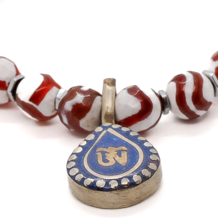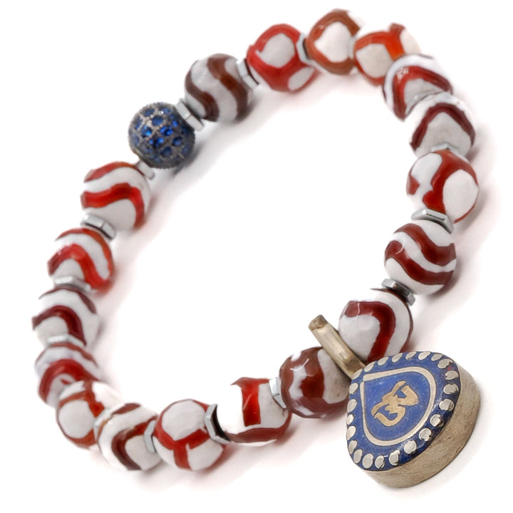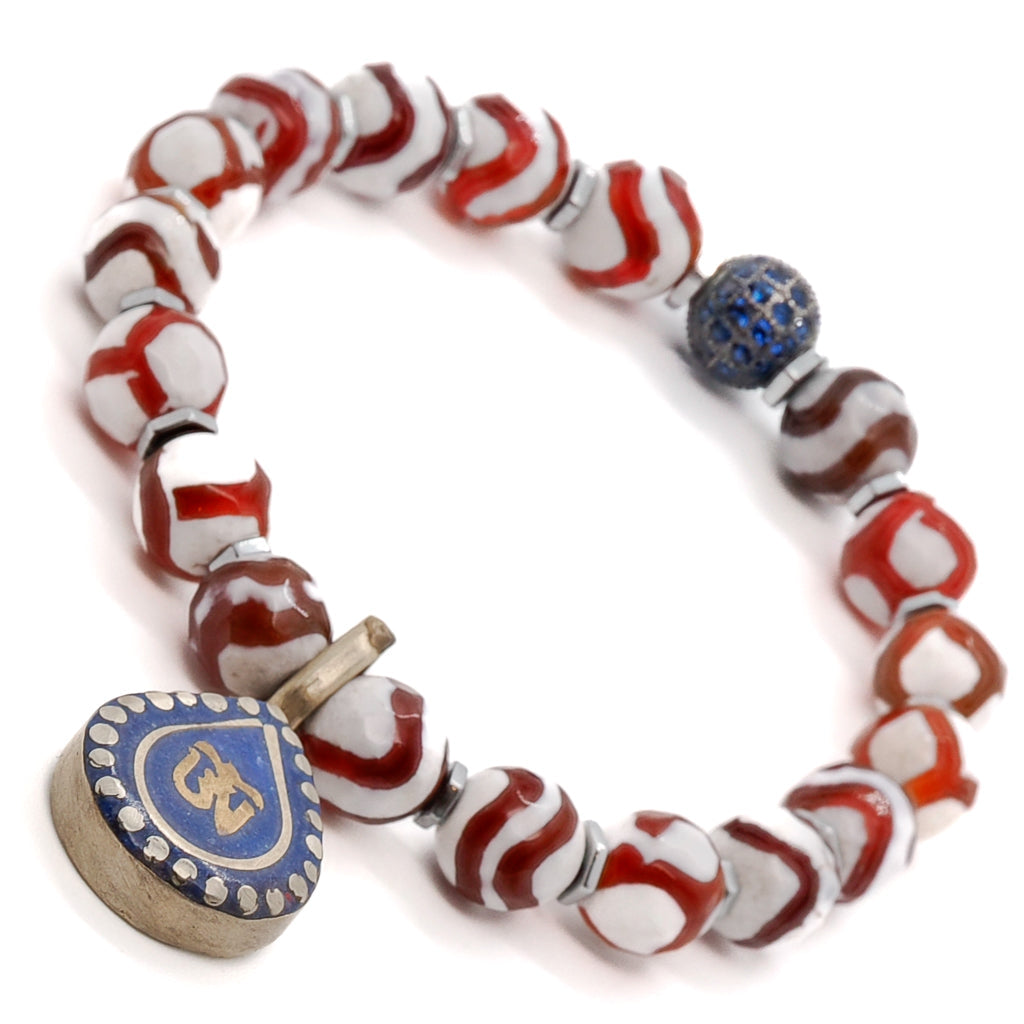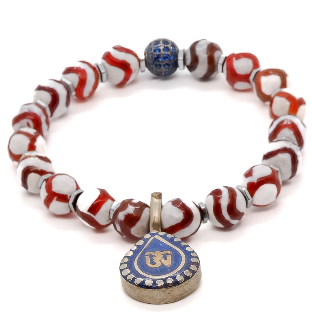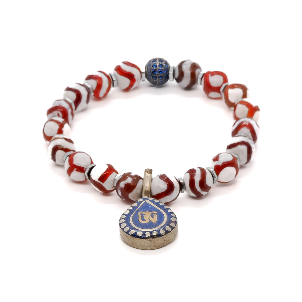 This beaded bracelet is handmade with 8mm striped Nepal Agate beads, silver hematite stone spacers, a handmade Ethnic Om Mantra charm with Lapis Lazuli inlay, and a blue zircon accent bead. The bracelet size is 6.5 inches.
