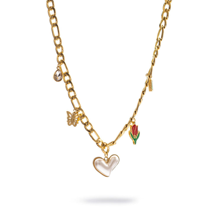 The Love In Bloom Charm Necklace by Ebru Jewelry is a playful and joyful piece. Crafted from water-resistant, tarnish-free gold-plated stainless steel, this choker-style necklace features a luminous heart, a vibrant tulip, a delicate butterfly, and a sparkling crystal charm. Each charm symbolizes beauty, transformation, and happiness, making this necklace a perfect accessory to add a touch of elegance and whimsy to your style.