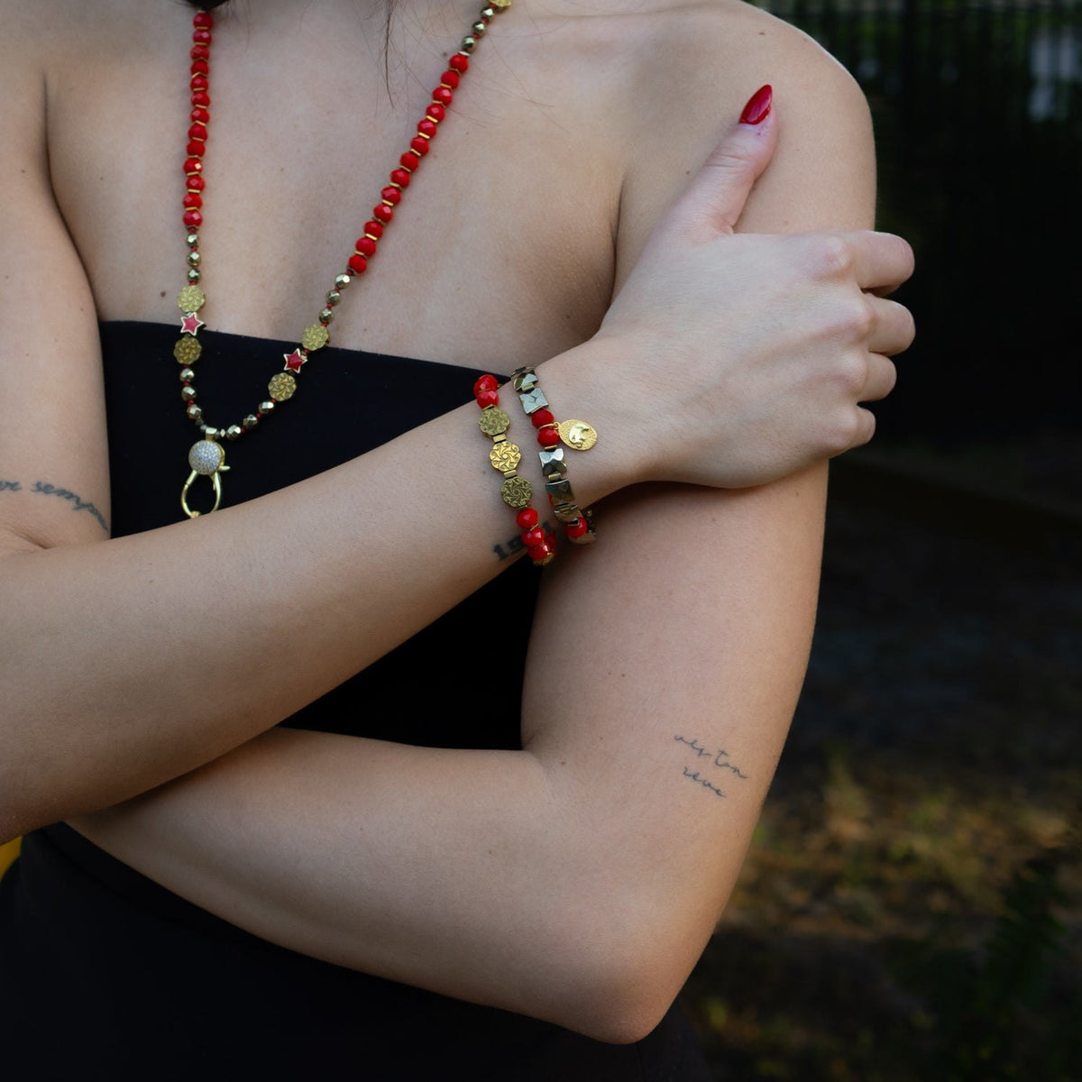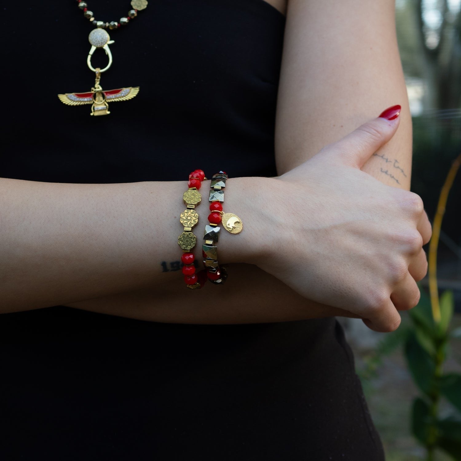 This charm bracelet set is handcrafted with gold hematite stones and red crystal beads. One bracelet features an 18-karat gold-plated sterling silver elephant charm with a diamond-colored Swarovski bead. The second bracelet has gold hematite flower beads and a black Swarovski crystal accent. The bracelet size is 6.5 inches.