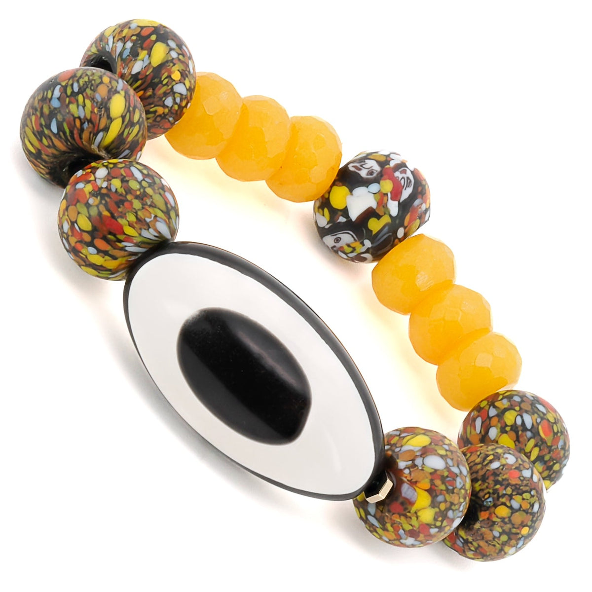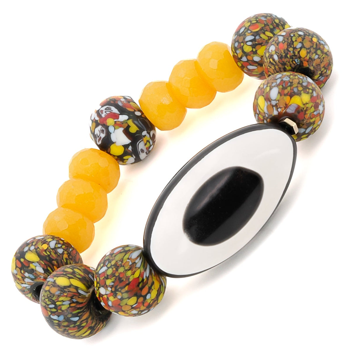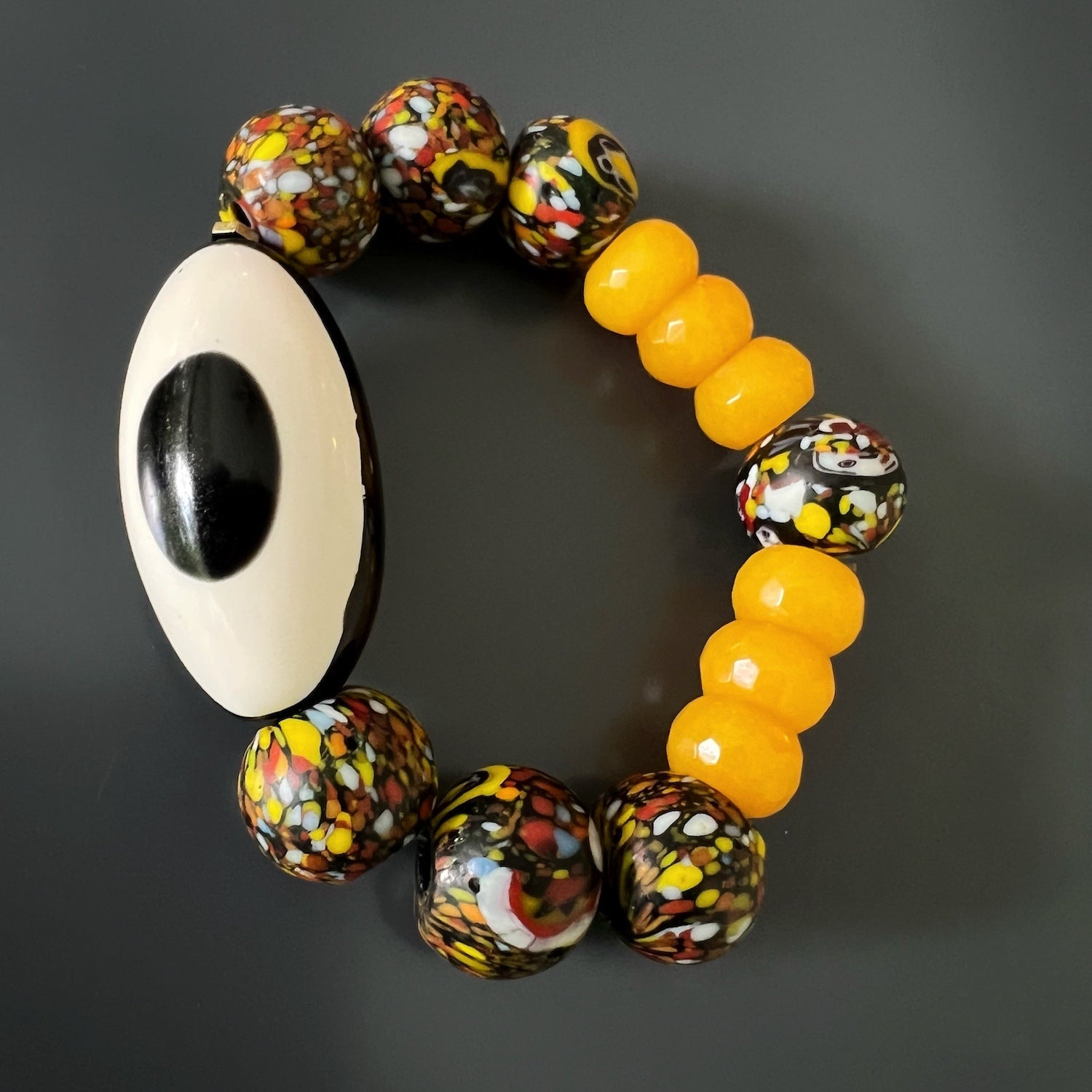 This handmade beaded bracelet is made with chunky 15mm African beads, 11mm yellow jade beads, and a black and white Nepal Eye bead. The bracelet size is 6.5 inches.