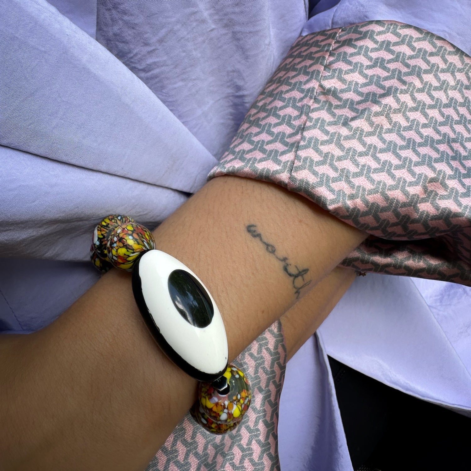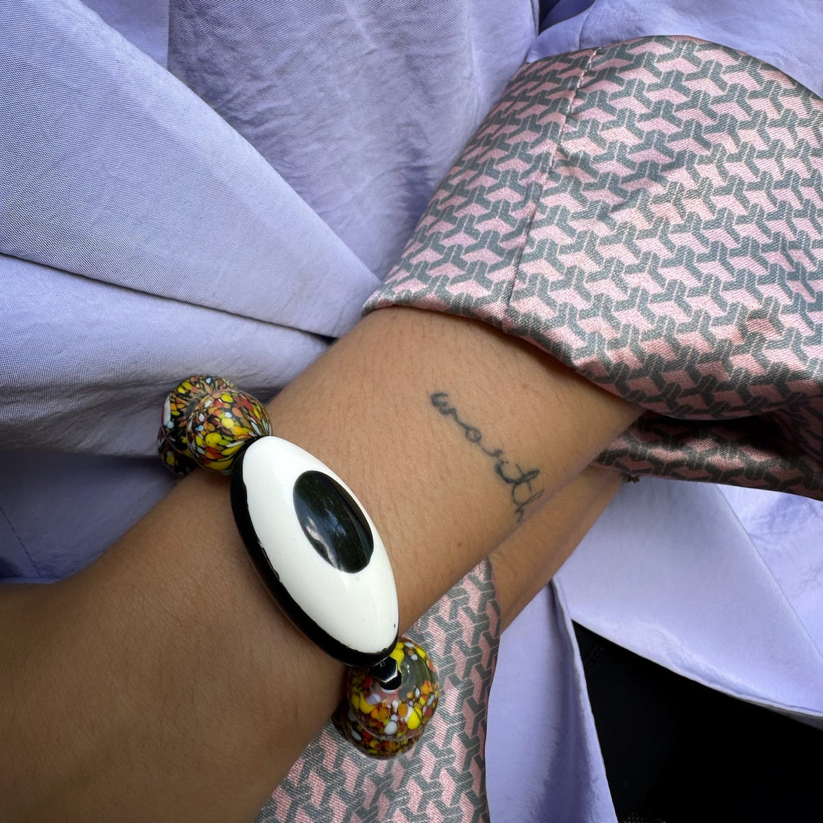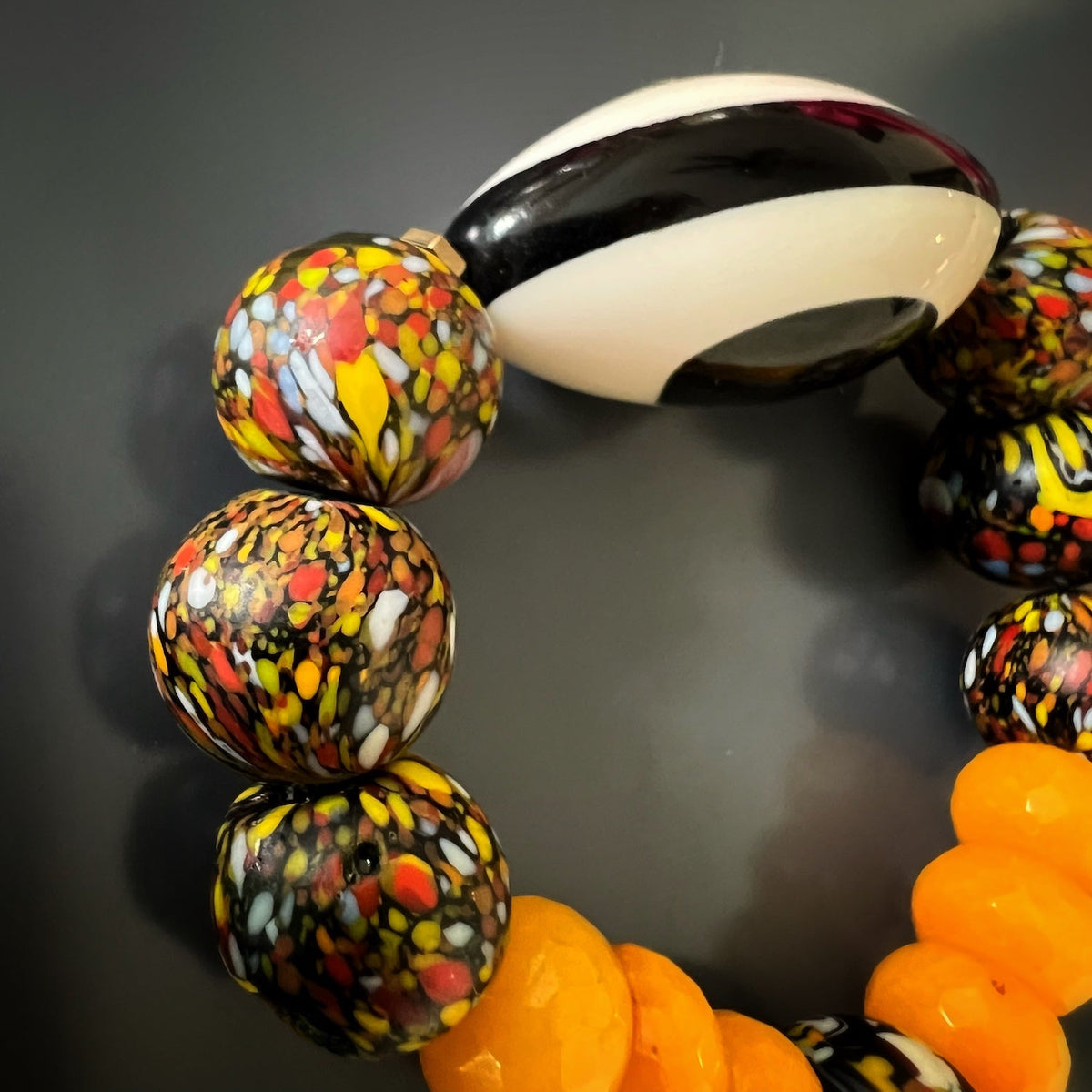 This handmade beaded bracelet is made with chunky 15mm African beads, 11mm yellow jade beads, and a black and white Nepal Eye bead. The bracelet size is 6.5 inches.