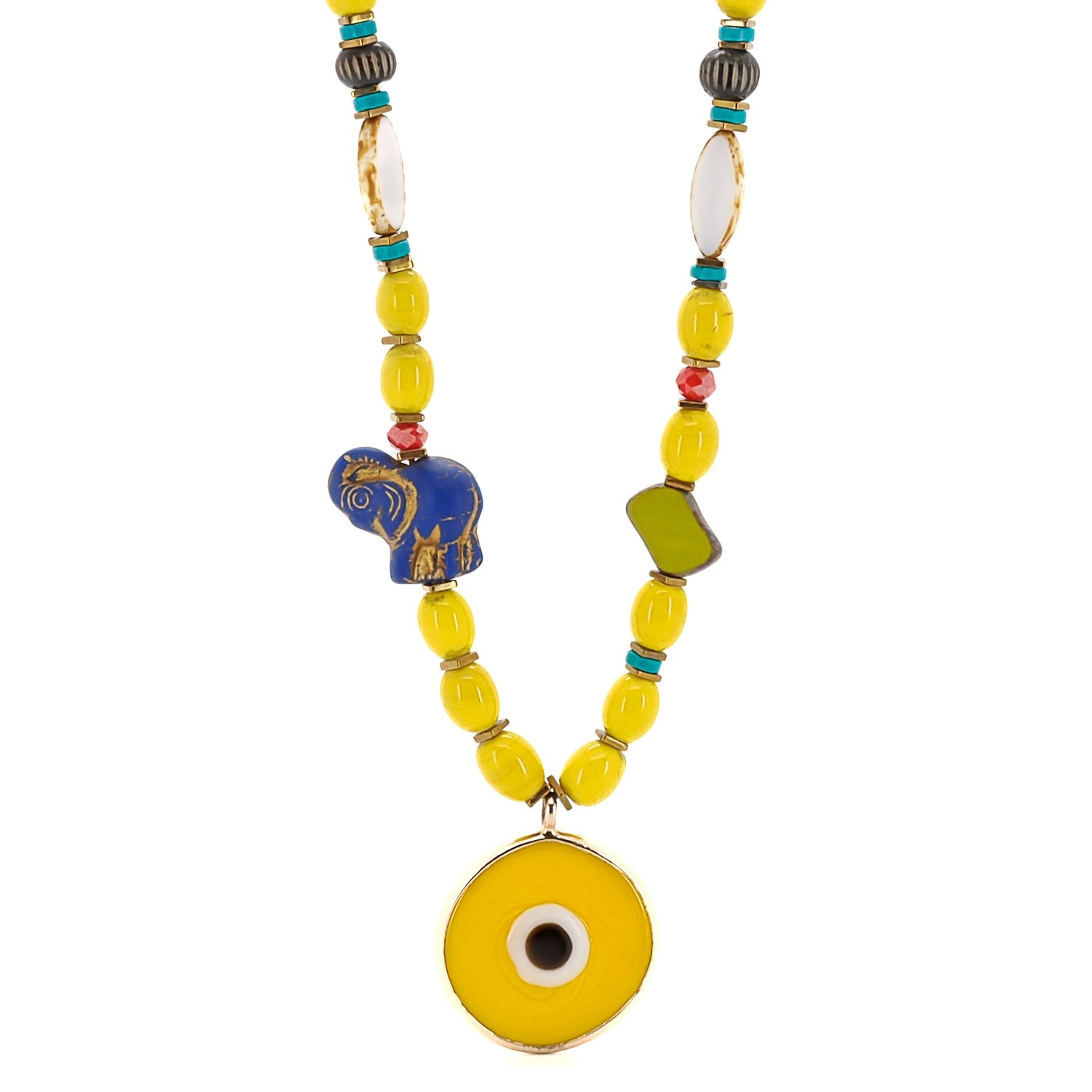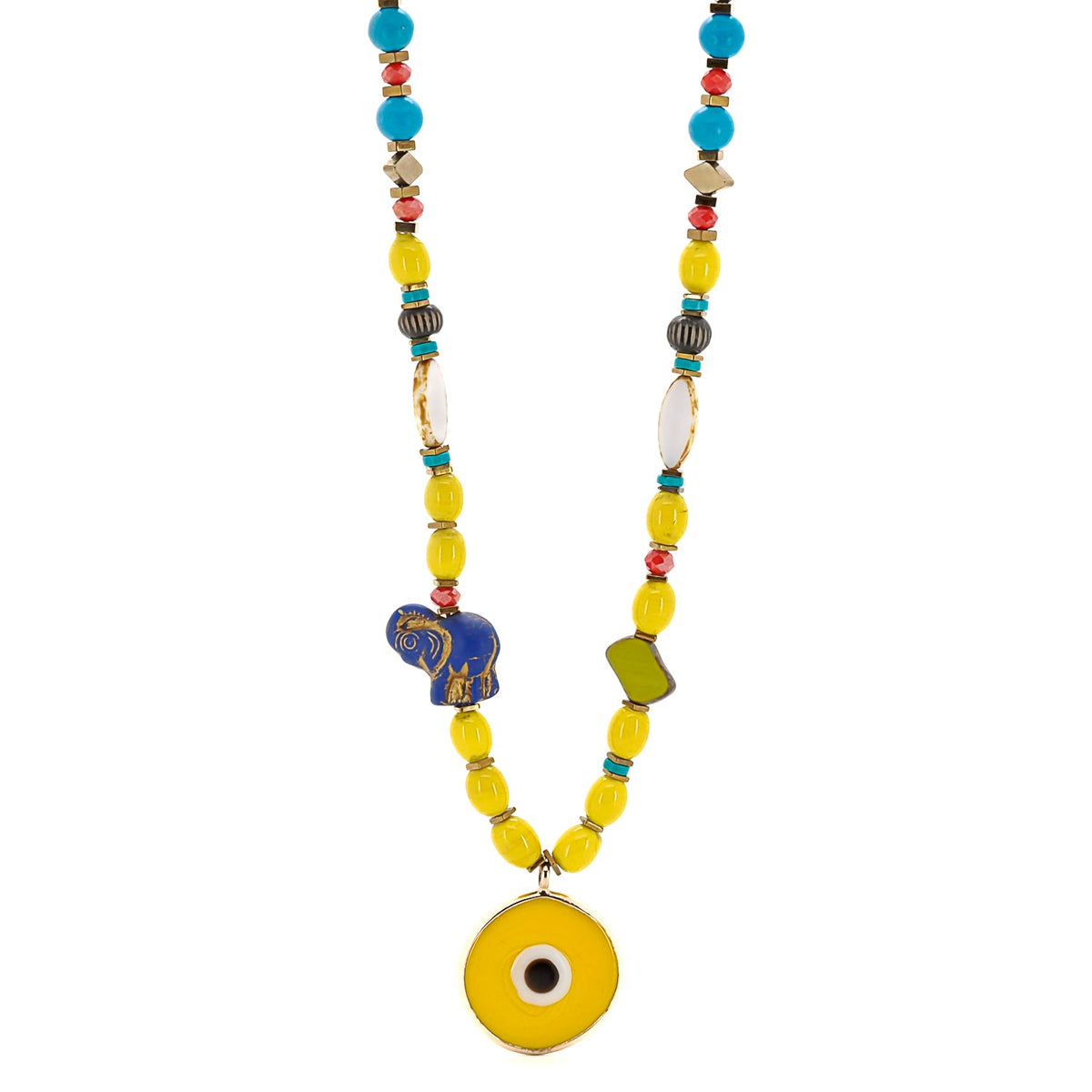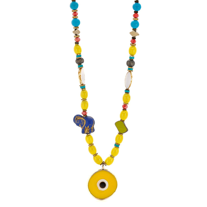 African Beads Lucky Elephant Yellow Evil Eye Colorful Beaded Necklace - Yellow
