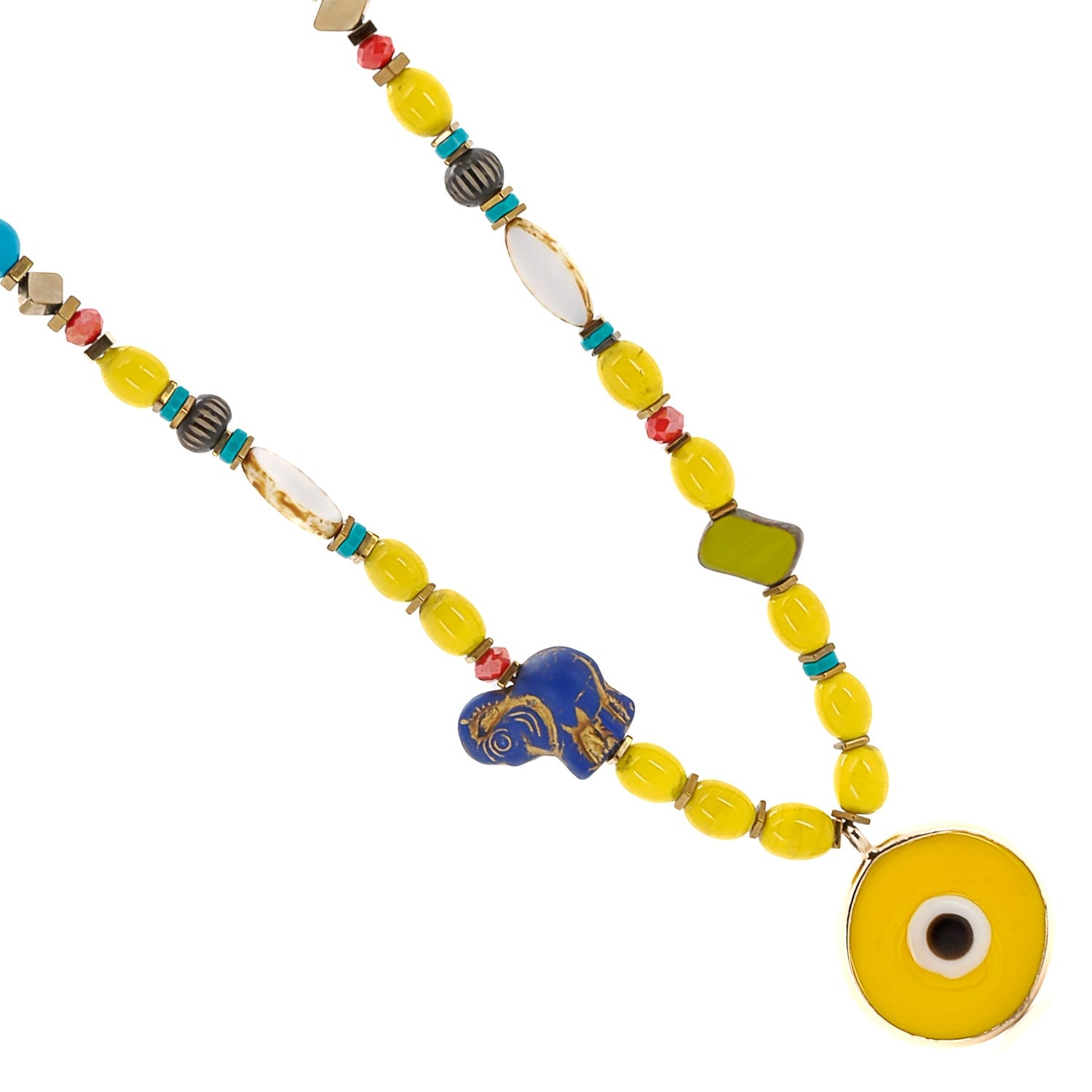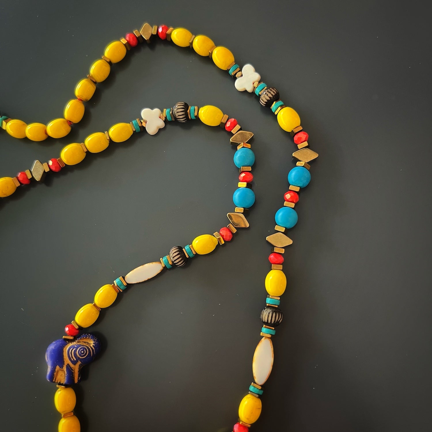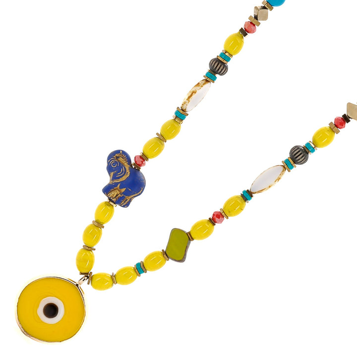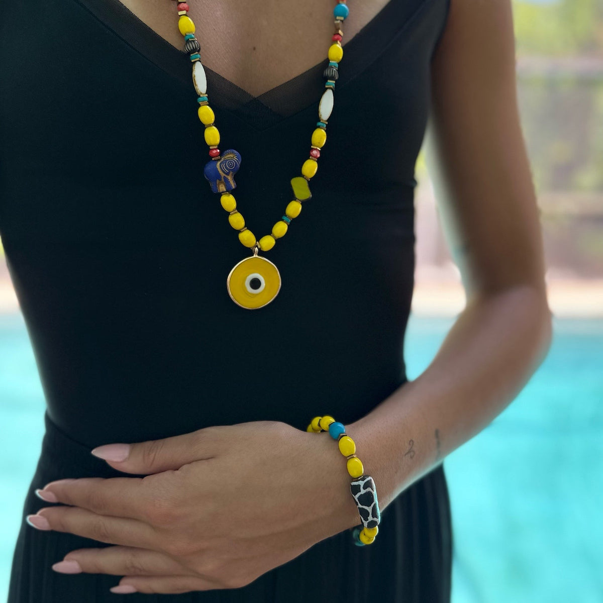 African Beads Lucky Elephant Yellow Evil Eye Colorful Beaded Necklace - Yellow