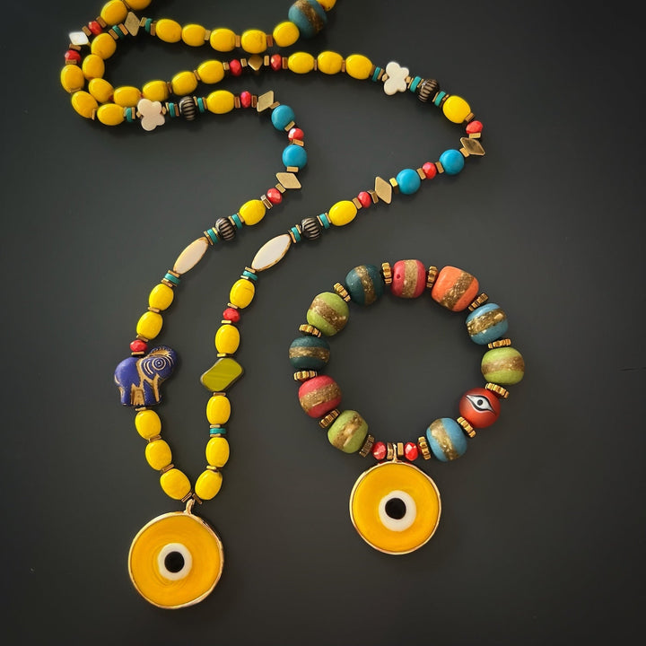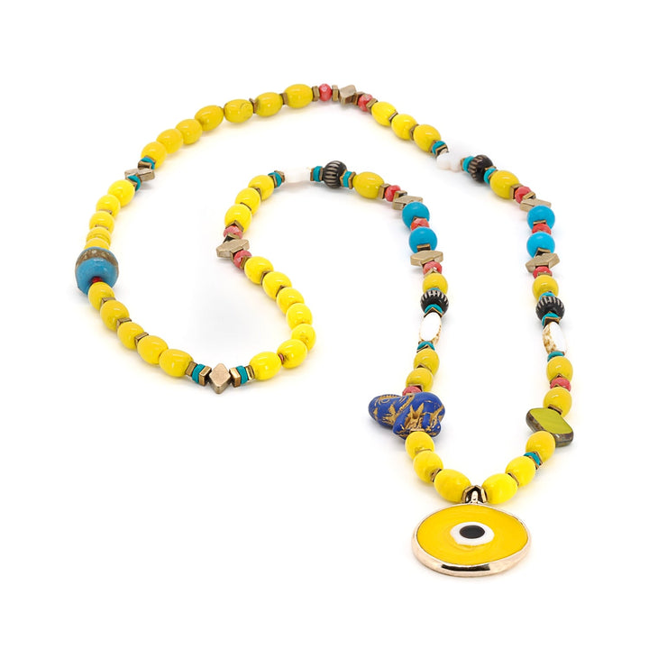 This beaded necklace is made with African handmade beads and an 18-karat gold-plated and yellow glass Evil Eye pendant. It also includes an African handmade elephant bead. The necklace length is 34 inches.