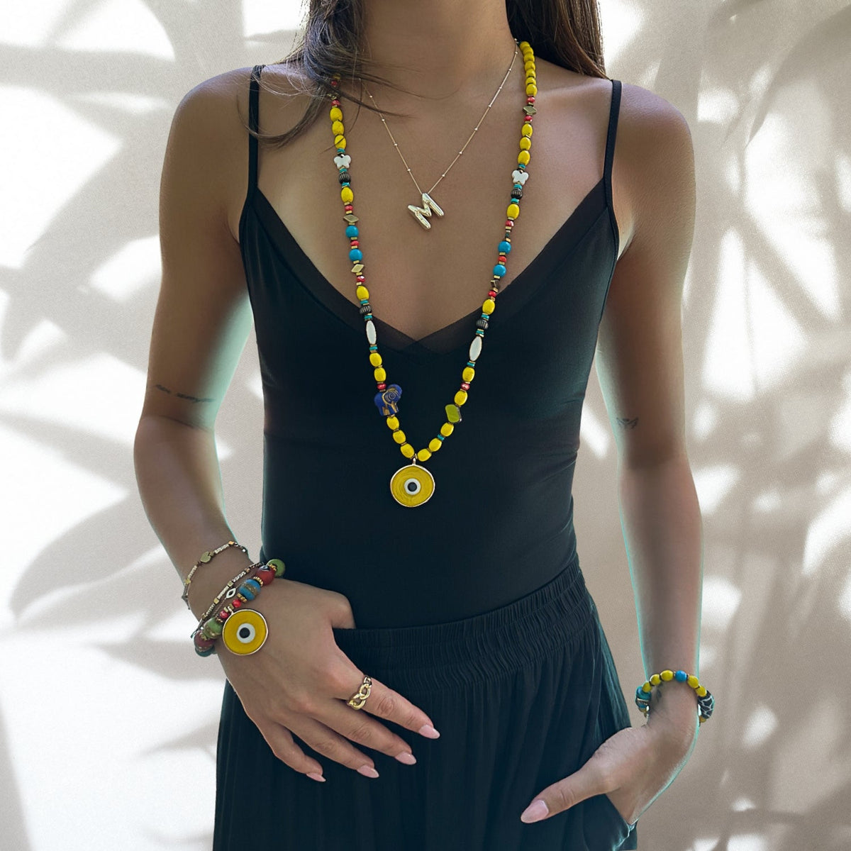 The African Beads Lucky Elephant Yellow Evil Eye Colorful Beaded Necklace by Ebru Jewelry is a powerful and colorful accessory. It features handmade African beads, a pearl butterfly, and an 18-karat gold-plated yellow Evil Eye pendant. The centerpiece is an elephant bead, symbolizing strength, wisdom, and good luck. The necklace is a constant reminder to embrace life and stay grounded.