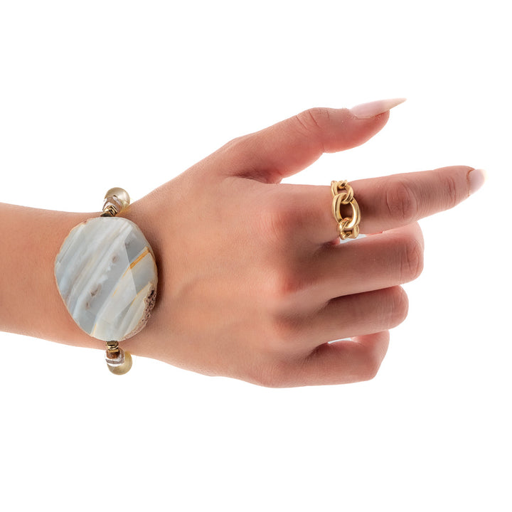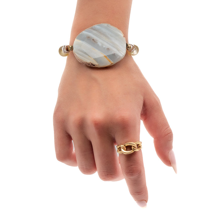 This beaded bracelet is handmade with a natural raw 1.7-inch Agate stone. It also includes 10mm cat eye stone beads, Nepal eye beads, and gold-colored hematite spacers. It has a 925 sterling silver logo bead and is 6.5 inches long.