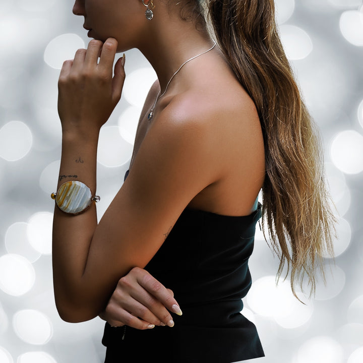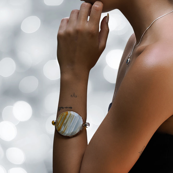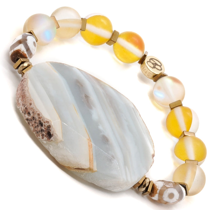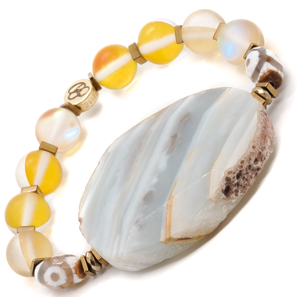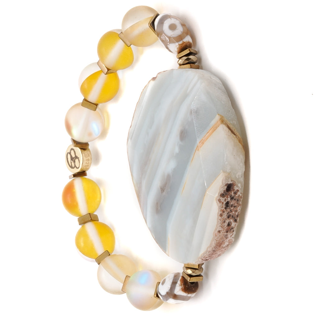 The Yellow Chunky Agate Bracelet by Ebru Jewelry is a stunning and elegant piece. The centerpiece is a large, natural raw Agate stone, surrounded by shimmering cat eye stone beads and elegant Nepal eye beads. This handmade bracelet is both bold and beautiful. It is strung on a high-quality stretchy jewelry cord for comfort and ease of wear.