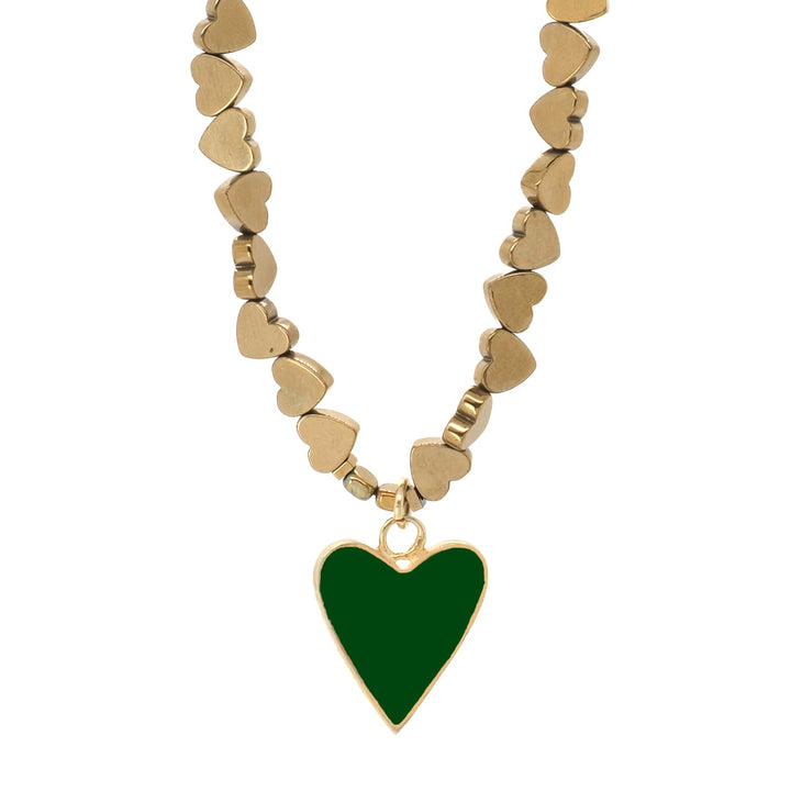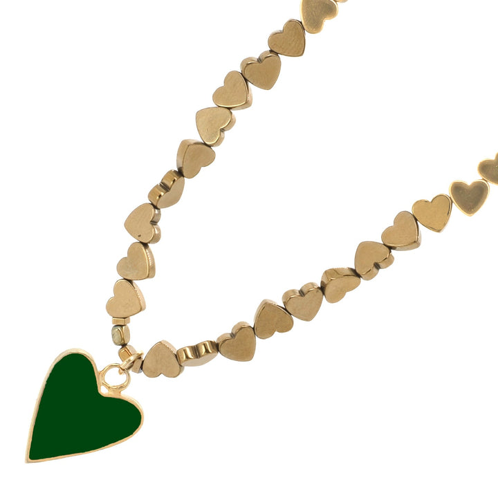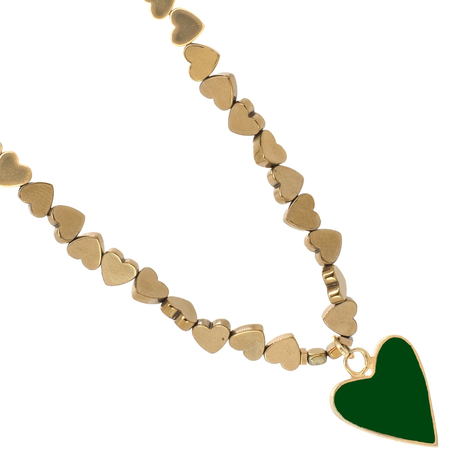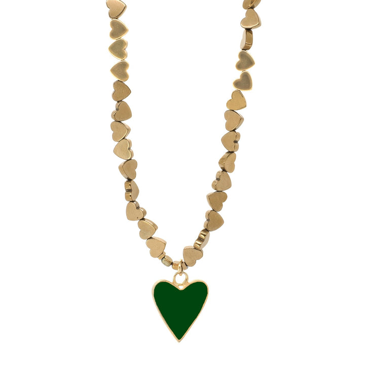 This beaded necklace is handmade with gold-colored heart-shaped hematite stone beads. It features a gold-plated heart pendant with green enamel and an 18-karat gold-plated heart extender. The necklace is 20 inches with a 0.7-inch pendant extender.