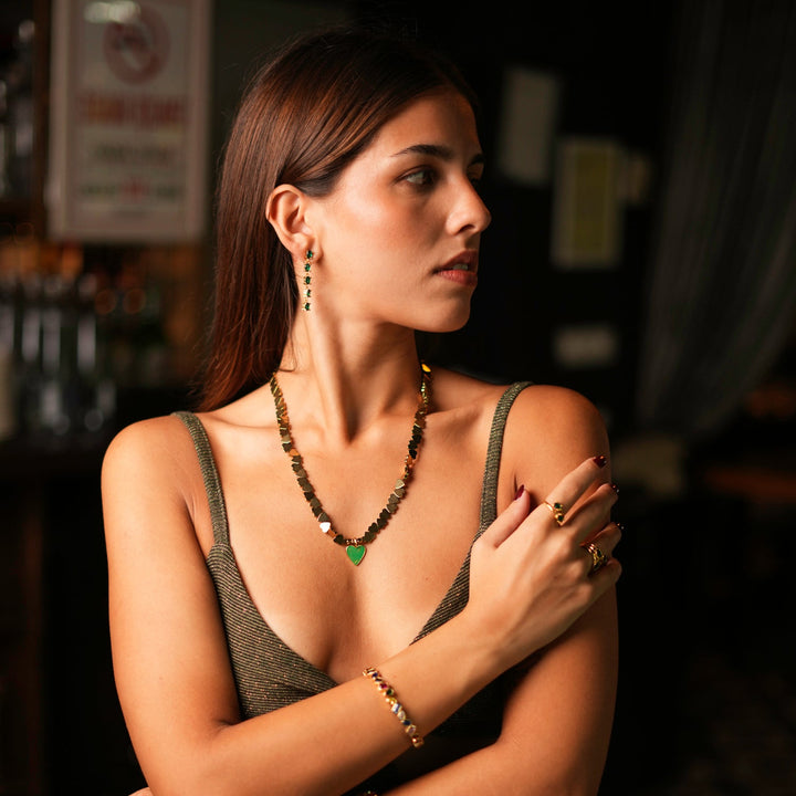 The Green Heart Pendant Gold Hematite Stone Heart Shape Chain Necklace by Ebru Jewelry is a statement piece with a grounding energy. The necklace is made with high-quality gold-colored hematite beads, which provide a unique metallic look and help you stay centered. It features a gold-plated heart pendant with green enamel, symbolizing love, and is finished with an 18-karat gold-plated heart extender.