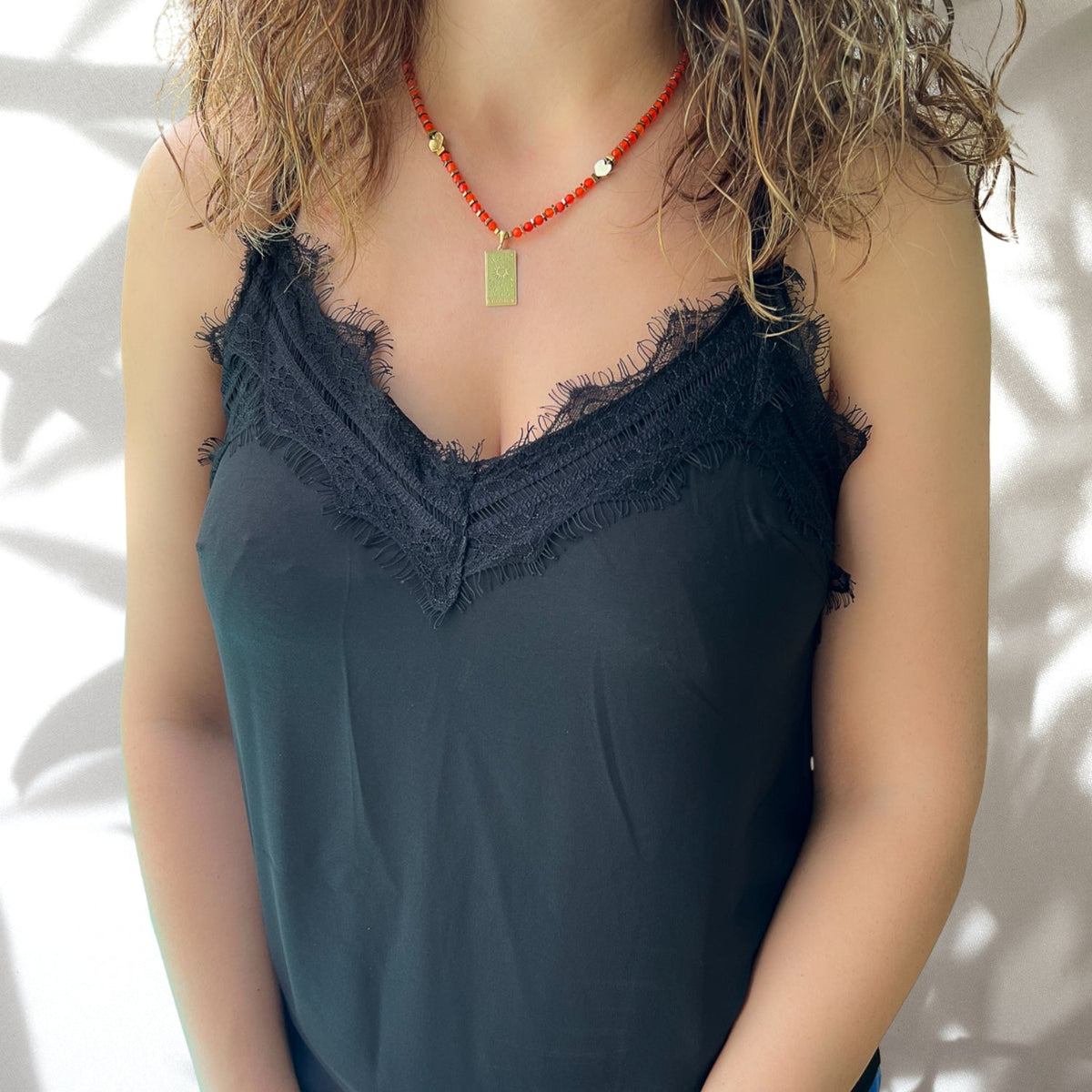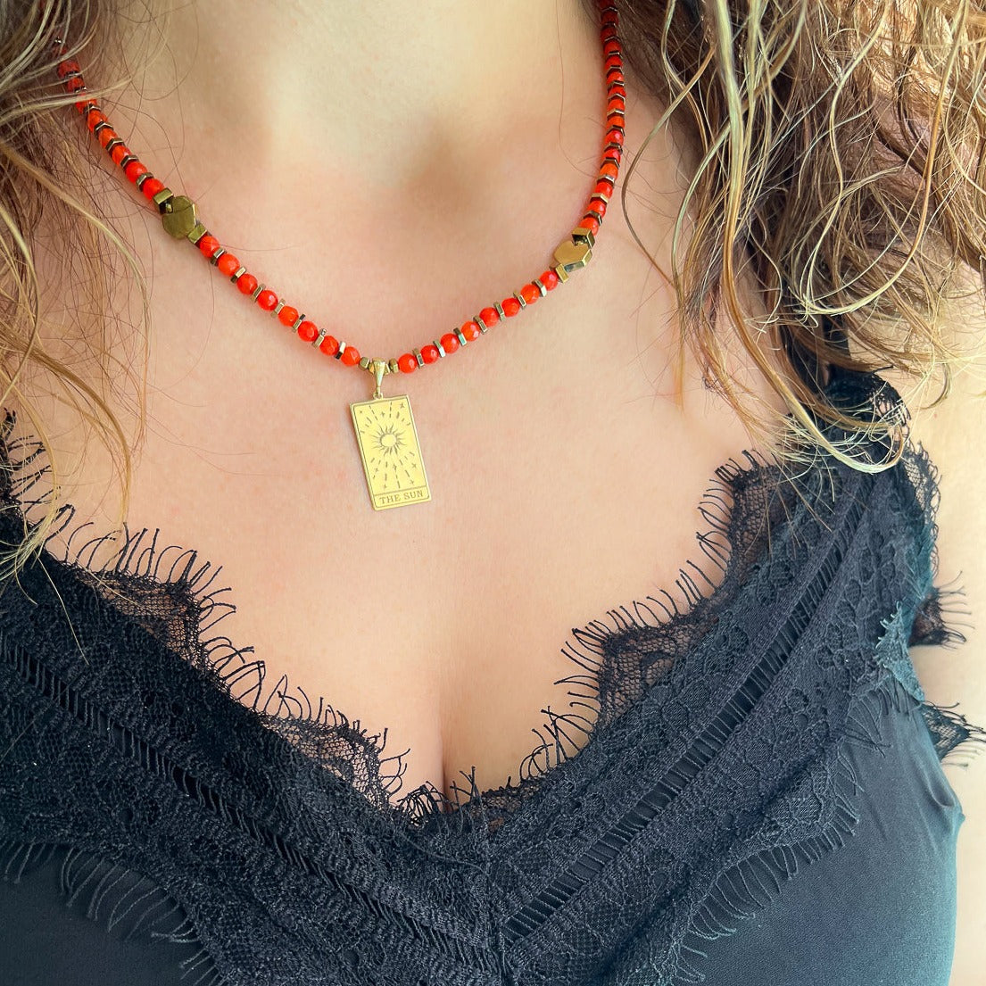 The Abundance Sun Tarot Card Red Cornelian Beaded Necklace by Ebru Jewelry is a radiant and meaningful accessory. This necklace features vibrant red carnelian gemstones, known for their energizing properties, and sparkling gold hematite spacers. The centerpiece is an 18-karat gold vermeil Sun Tarot card pendant, symbolizing enlightenment and abundance.