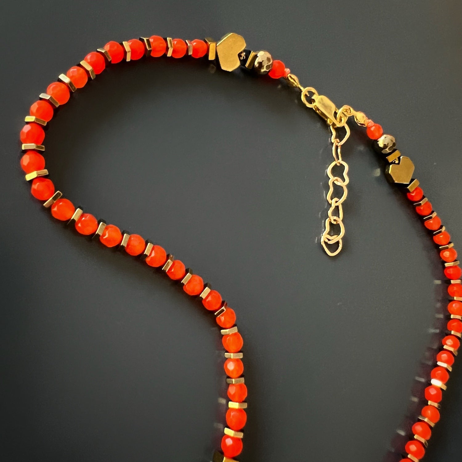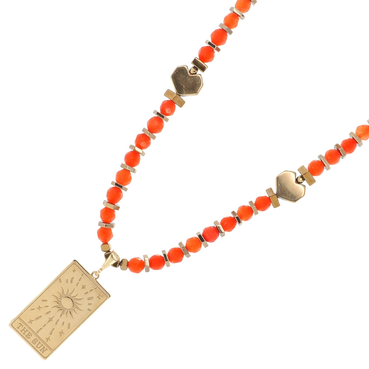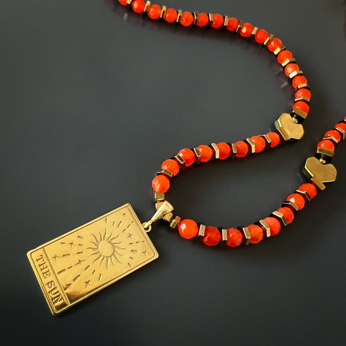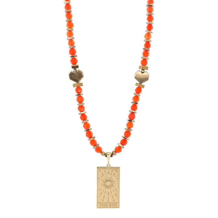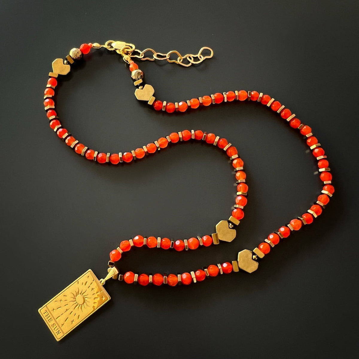 This beaded necklace is made with 6mm carnelian stone beads, gold-colored hematite stone heart beads, and hematite stone spacers. The pendant is an 18-karat gold vermeil on sterling silver Tarot Sun card. The necklace is 18 inches long with a 1.5-inch extender.