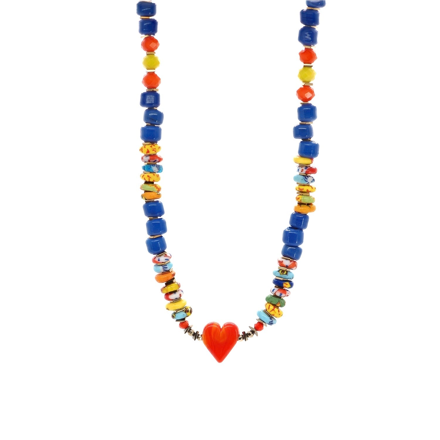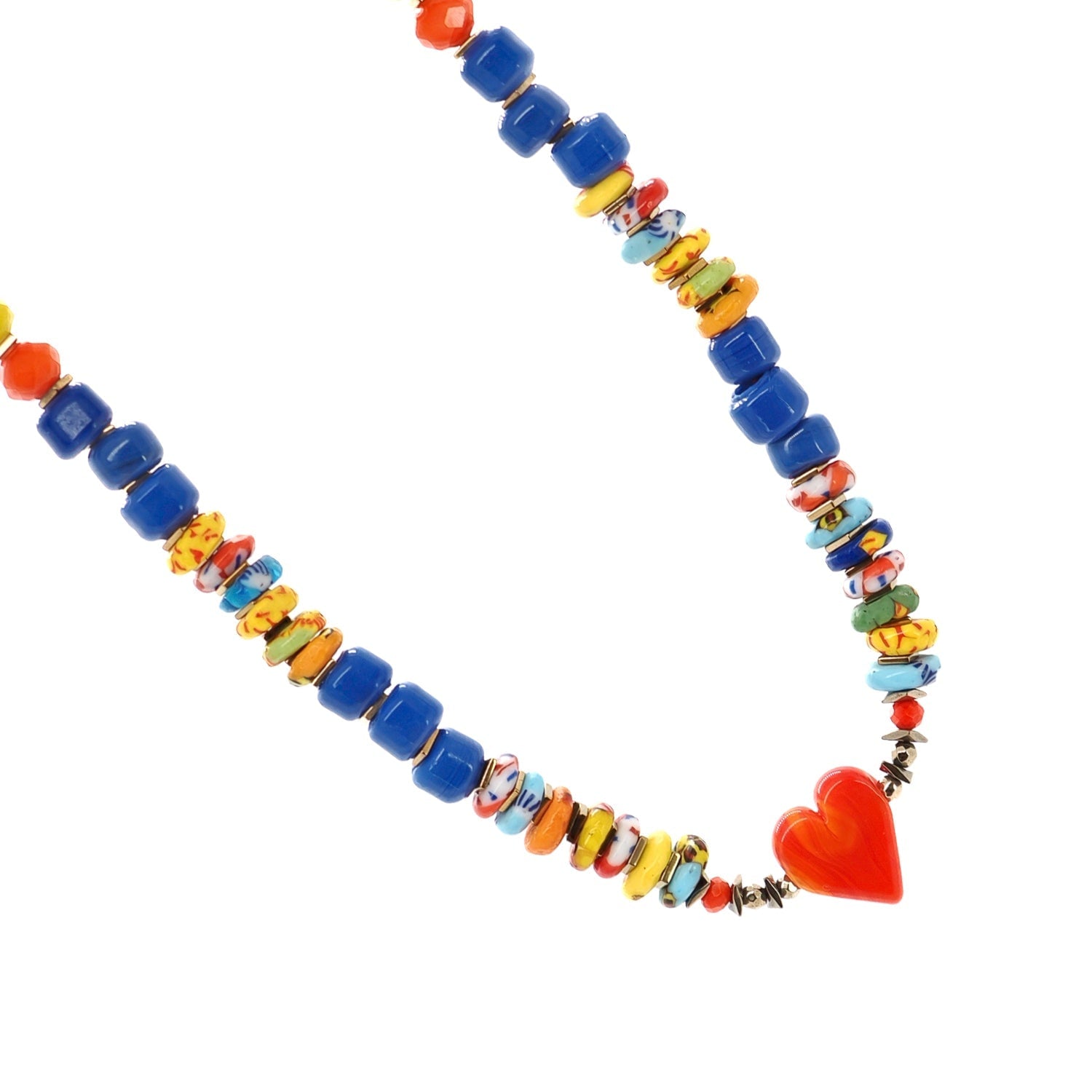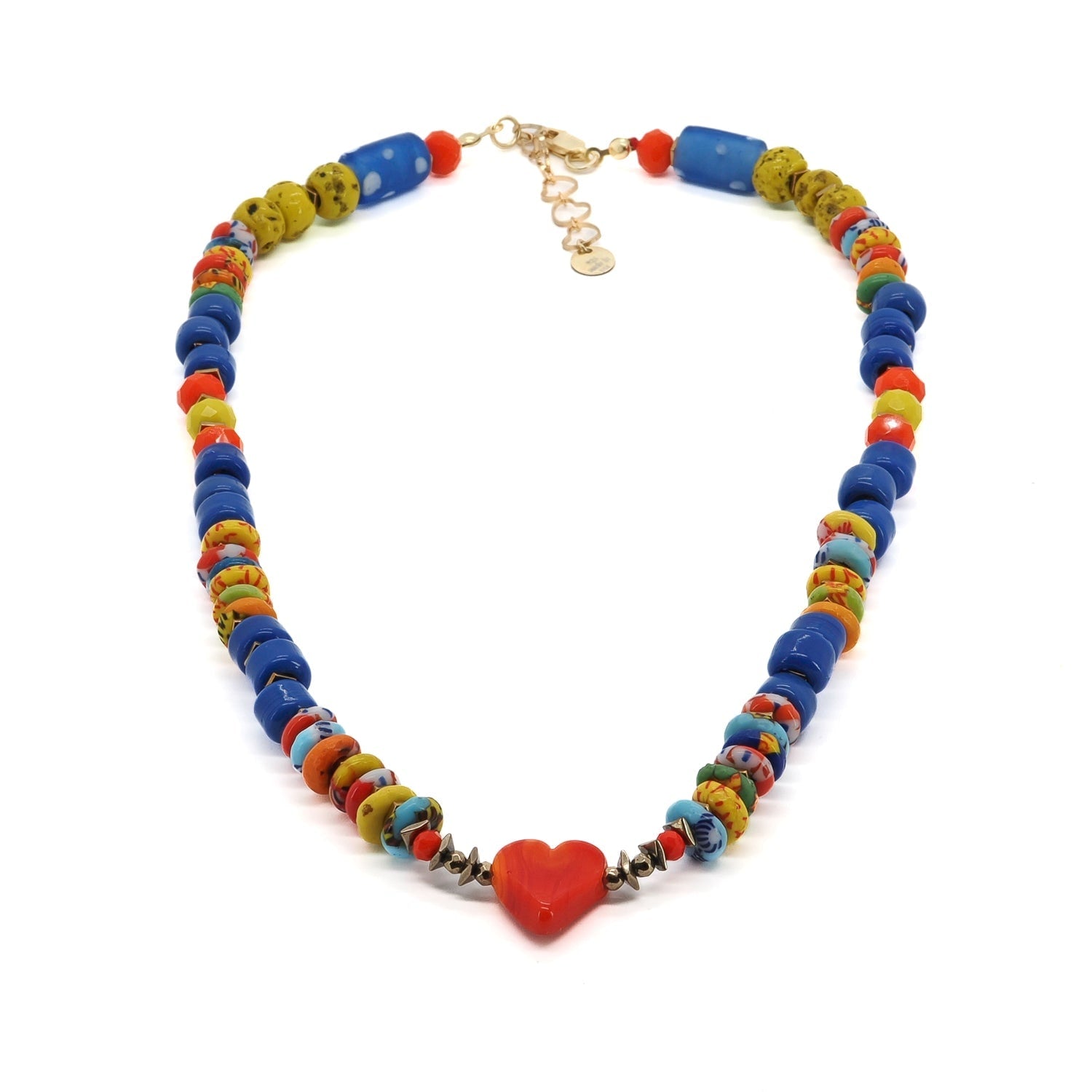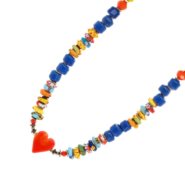This beaded necklace is made with multicolor Cape Coast glass beads, blue ceramic beads, yellow African beads, and a red ceramic heart. The necklace is 18 inches long with a 1.5-inch adjustable chain.