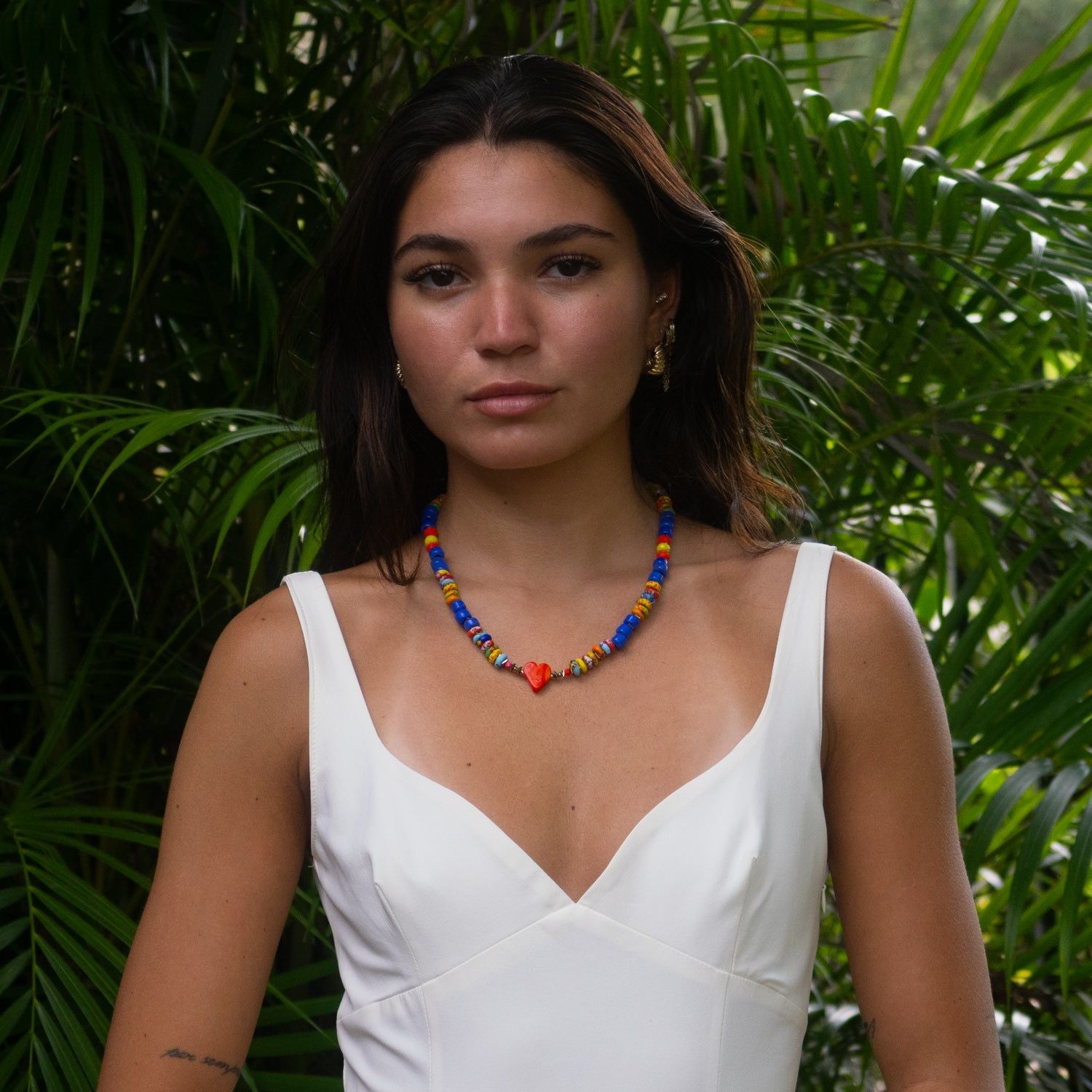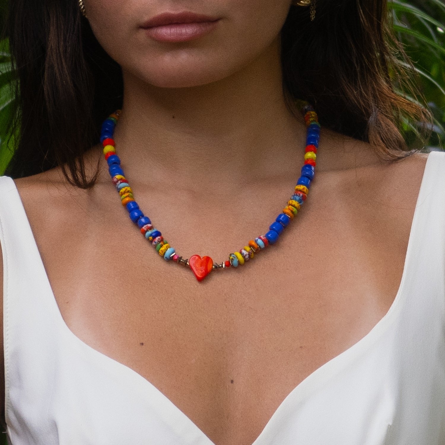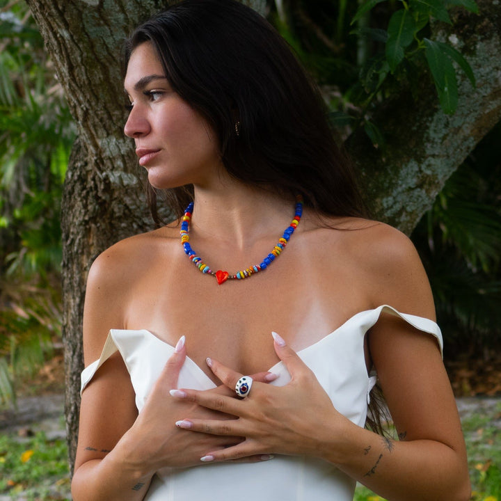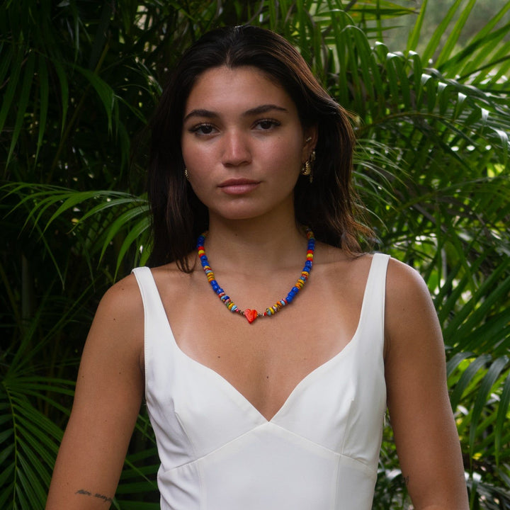 The Bohemian Style Red Heart Happy Summer Necklace by Ebru Jewelry is a vibrant, one-of-a-kind statement piece. This handcrafted necklace features a mix of colorful Bohemian glass beads, blue ceramic beads, and yellow African beads. The focal point is a radiant red ceramic heart centerpiece. The design is full of personality and playful energy, perfect for adding a pop of happiness to any look.