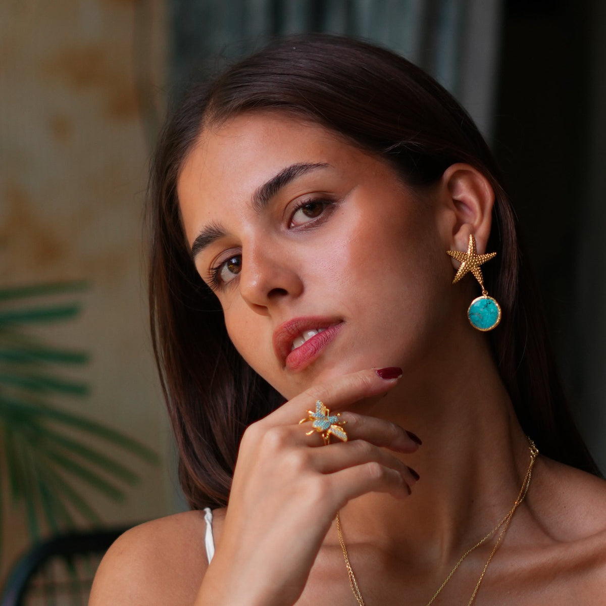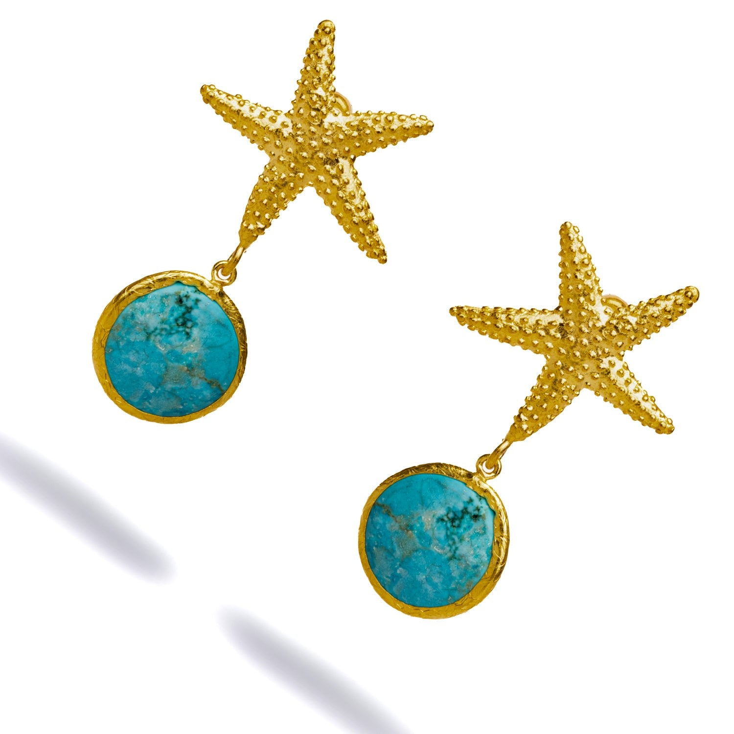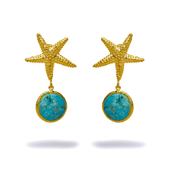These dangle earrings are made from a brass base. They have a 24-karat gold-plated starfish stud and a turquoise stone that drops from it. The length is 2 inches.