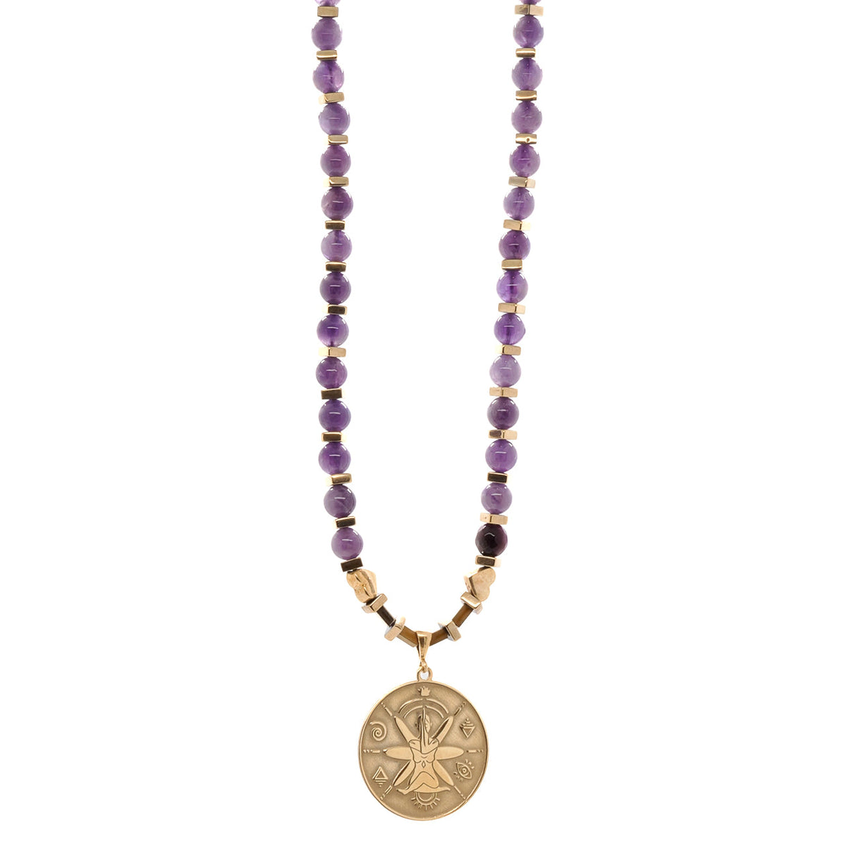 The See The Good Amethyst Beaded Choker Necklace by Ebru Jewelry is a meaningful and powerful piece. This choker necklace features 6mm amethyst stone beads, known for their protective qualities. It is adorned with a special spiritual pendant, an 18-karat gold vermeil elephant charm with an evil eye, symbolizing good luck and protection against negative energy.