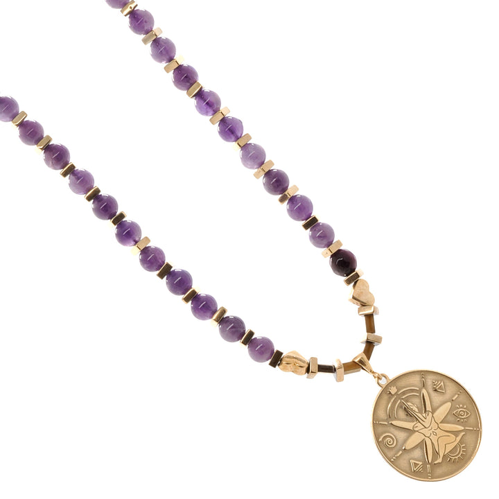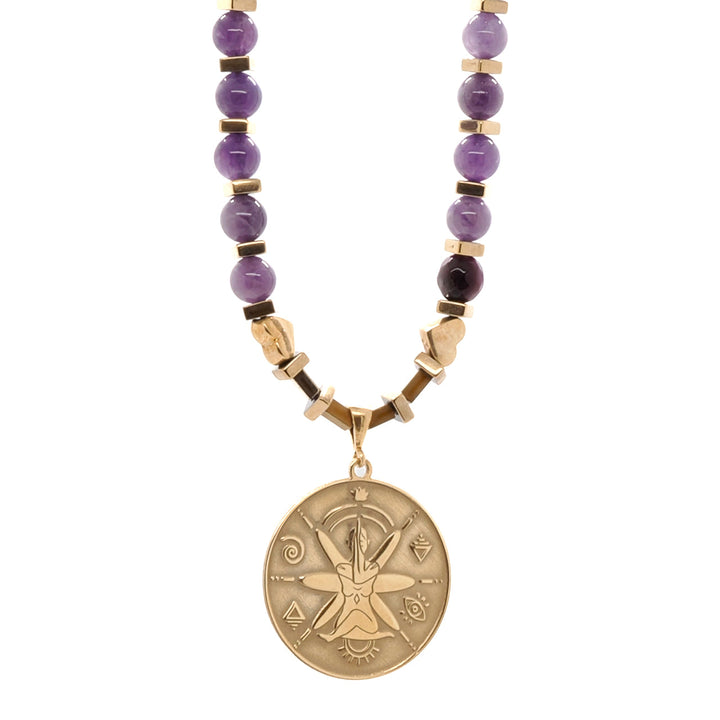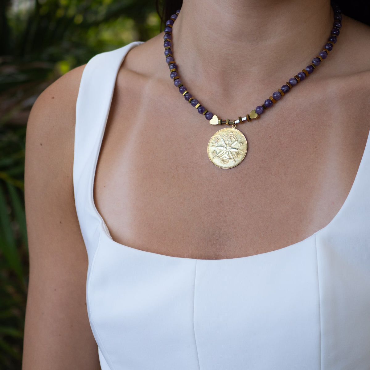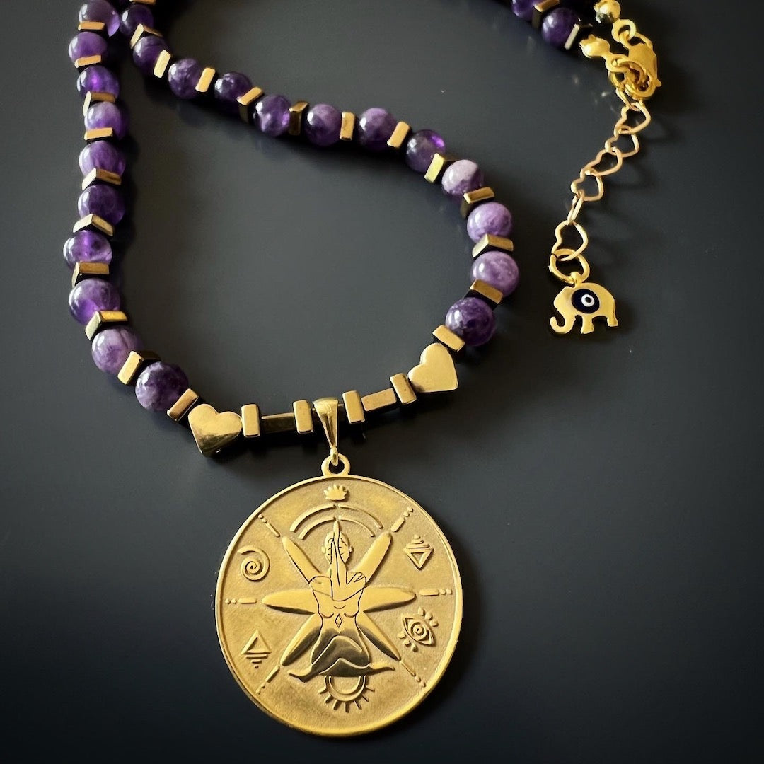 This choker necklace is made with 6mm amethyst stone beads, gold-colored hematite stone, and hematite stone spacers. The pendant is a solid 925 silver with an 18-karat gold vermeil. It also has an elephant charm with an evil eye. The clasp is a lobster clasp.