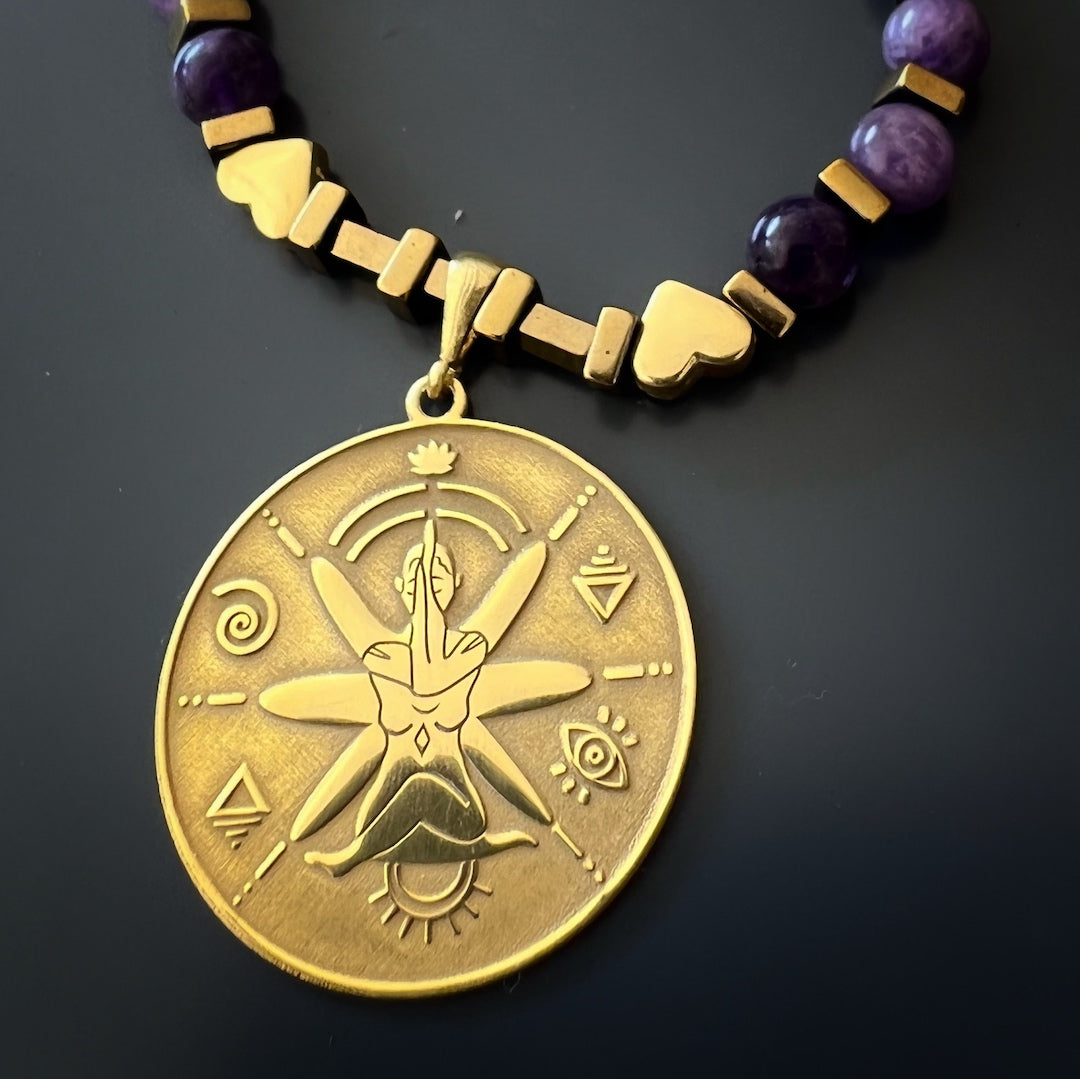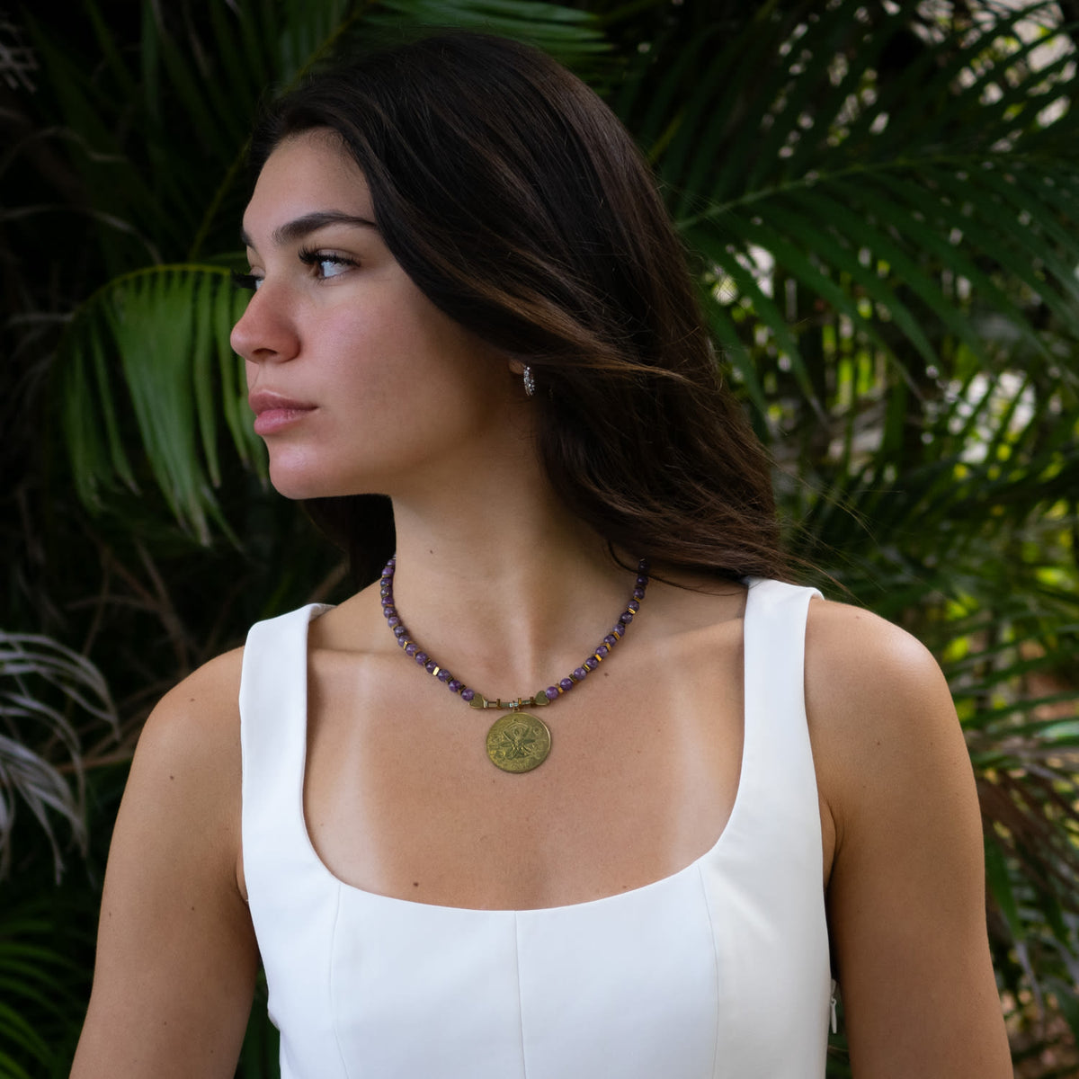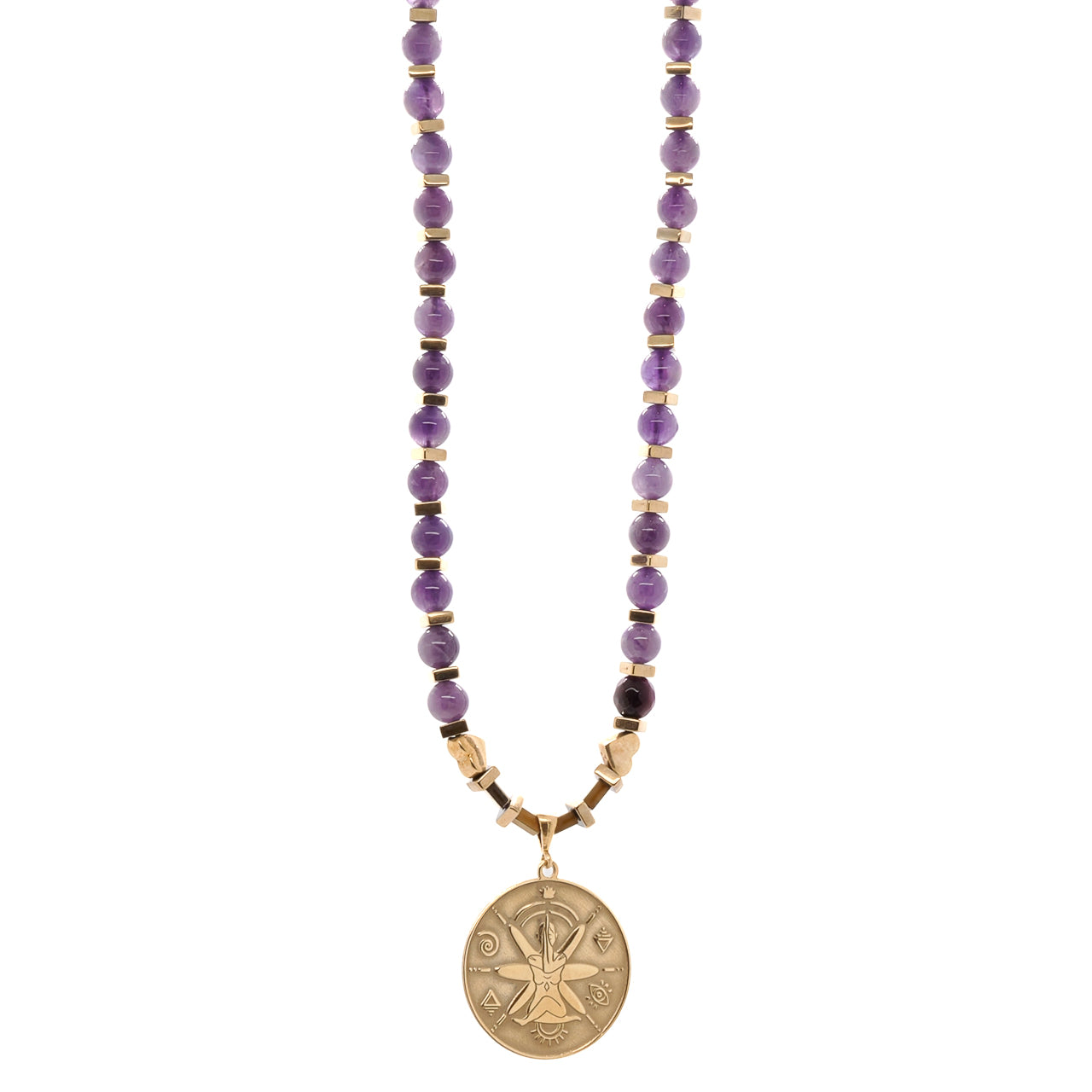 This choker necklace is made with 6mm amethyst stone beads, gold-colored hematite stone, and hematite stone spacers. The pendant is a solid 925 silver with an 18-karat gold vermeil. It also has an elephant charm with an evil eye. The clasp is a lobster clasp.