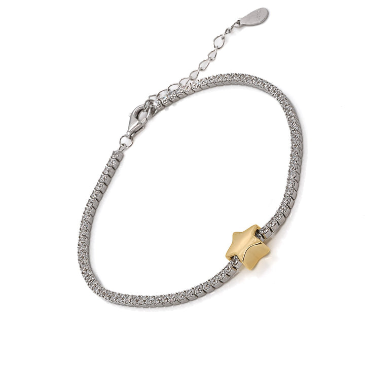This tennis bracelet is handmade from sterling silver. It features zircon stones and an 18-karat gold-plated star charm. The size is adjustable from 6 to 7.5 inches.