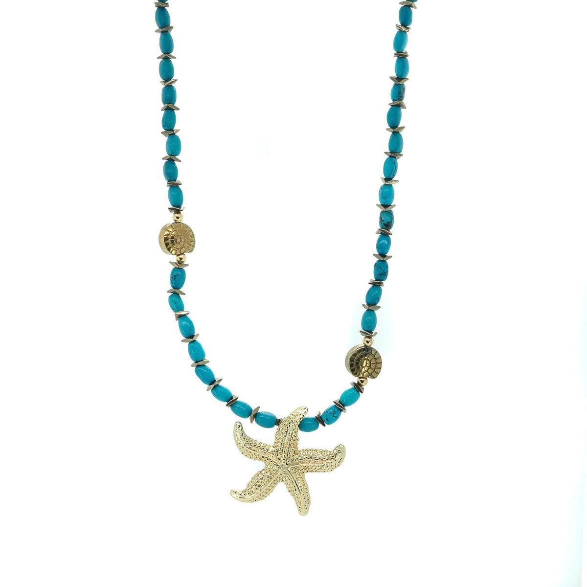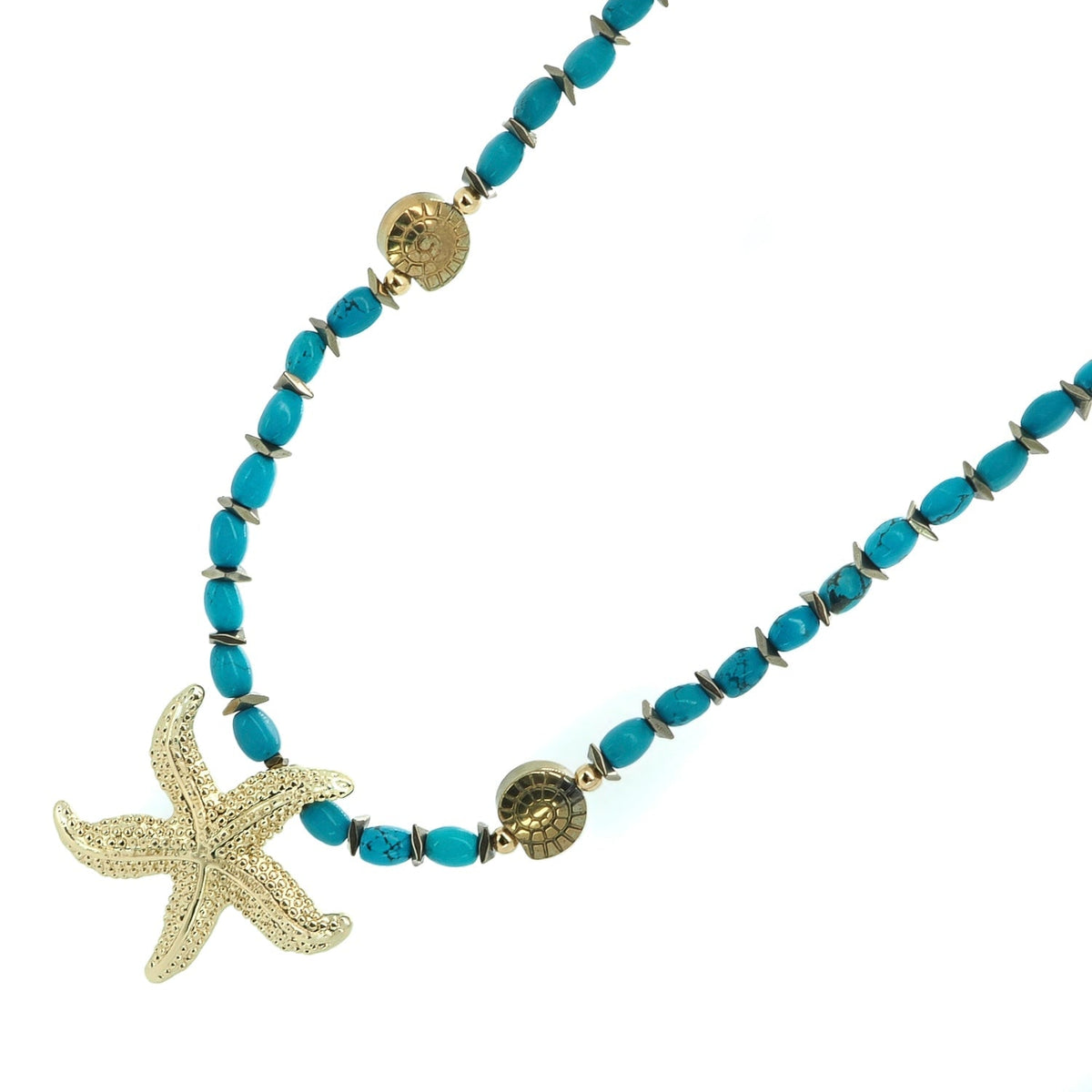 The Ocean Spirit Starfish & Turquoise Choker Necklace - Turquoise by Ebru Jewelry is a stunning handmade choker. It features vibrant turquoise stone beads paired with shimmering gold hematite spacers and seashell-shaped accent beads. A beautifully textured starfish pendant, symbolizing guidance and renewal, hangs at the center. The necklace has a unique yellow star-shaped clasp.