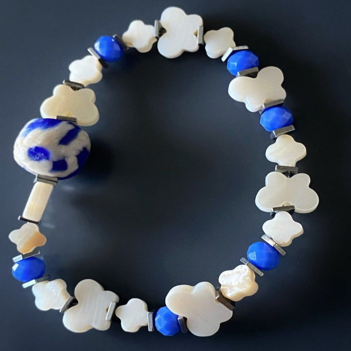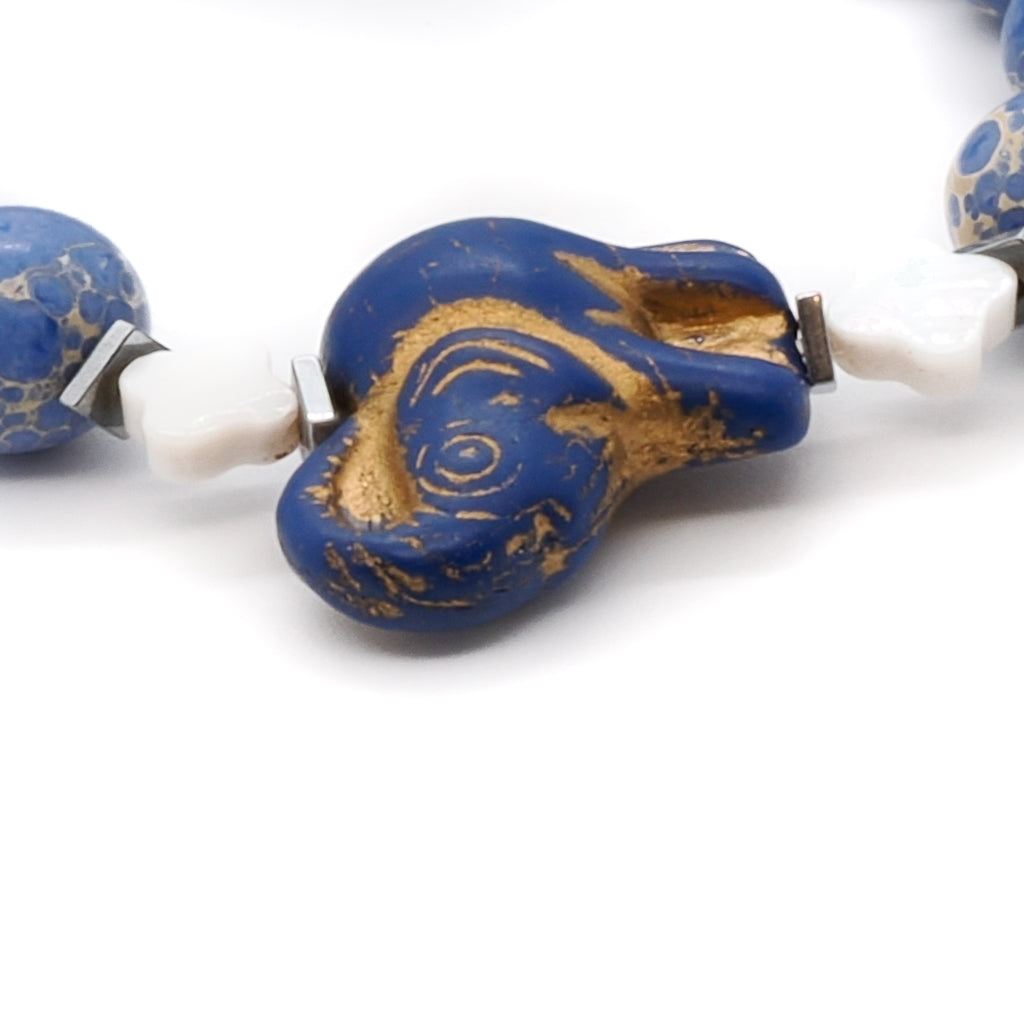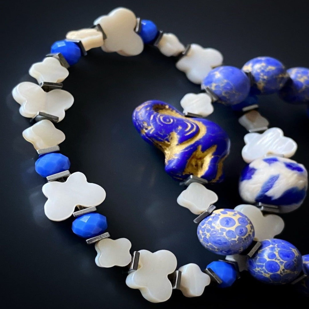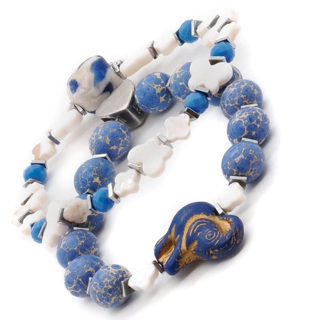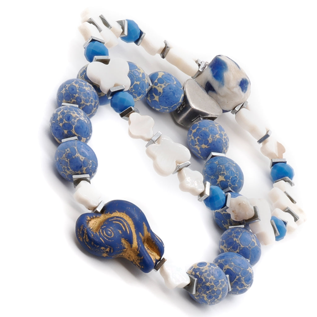 Ceramic Elephant Jasper And Pearl Beaded Bracelet Set - Blue