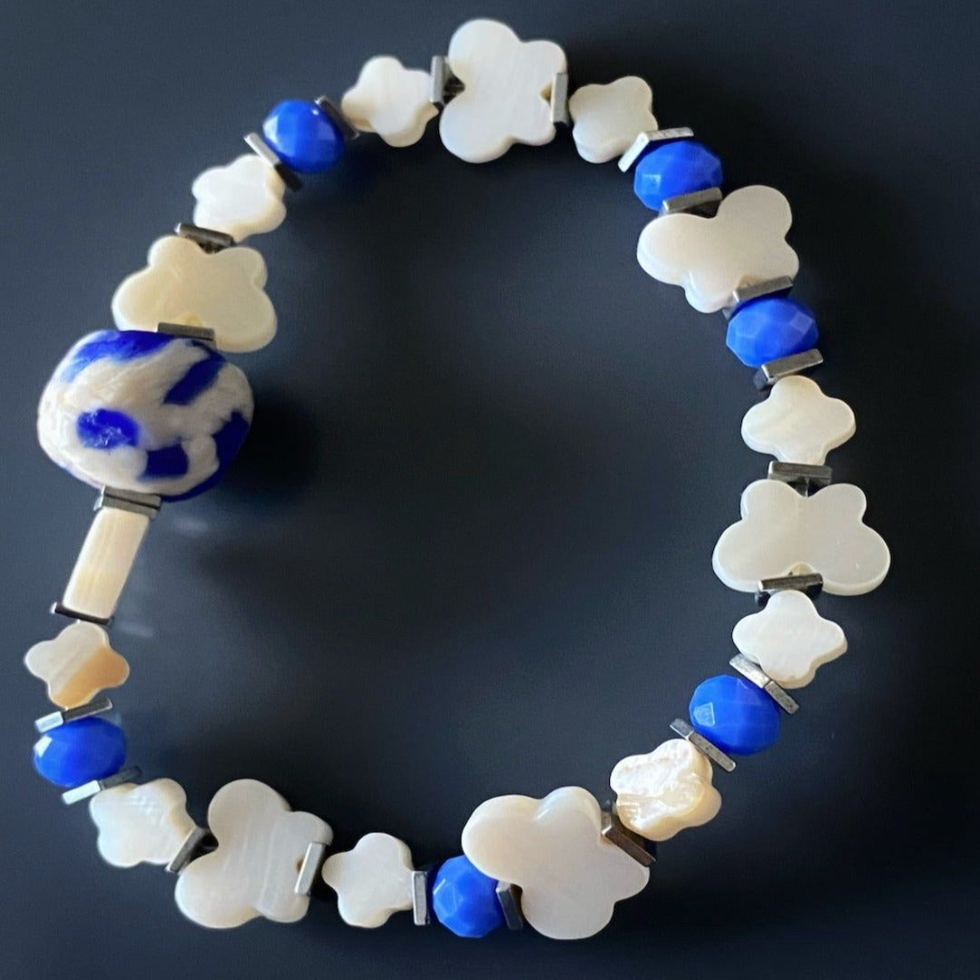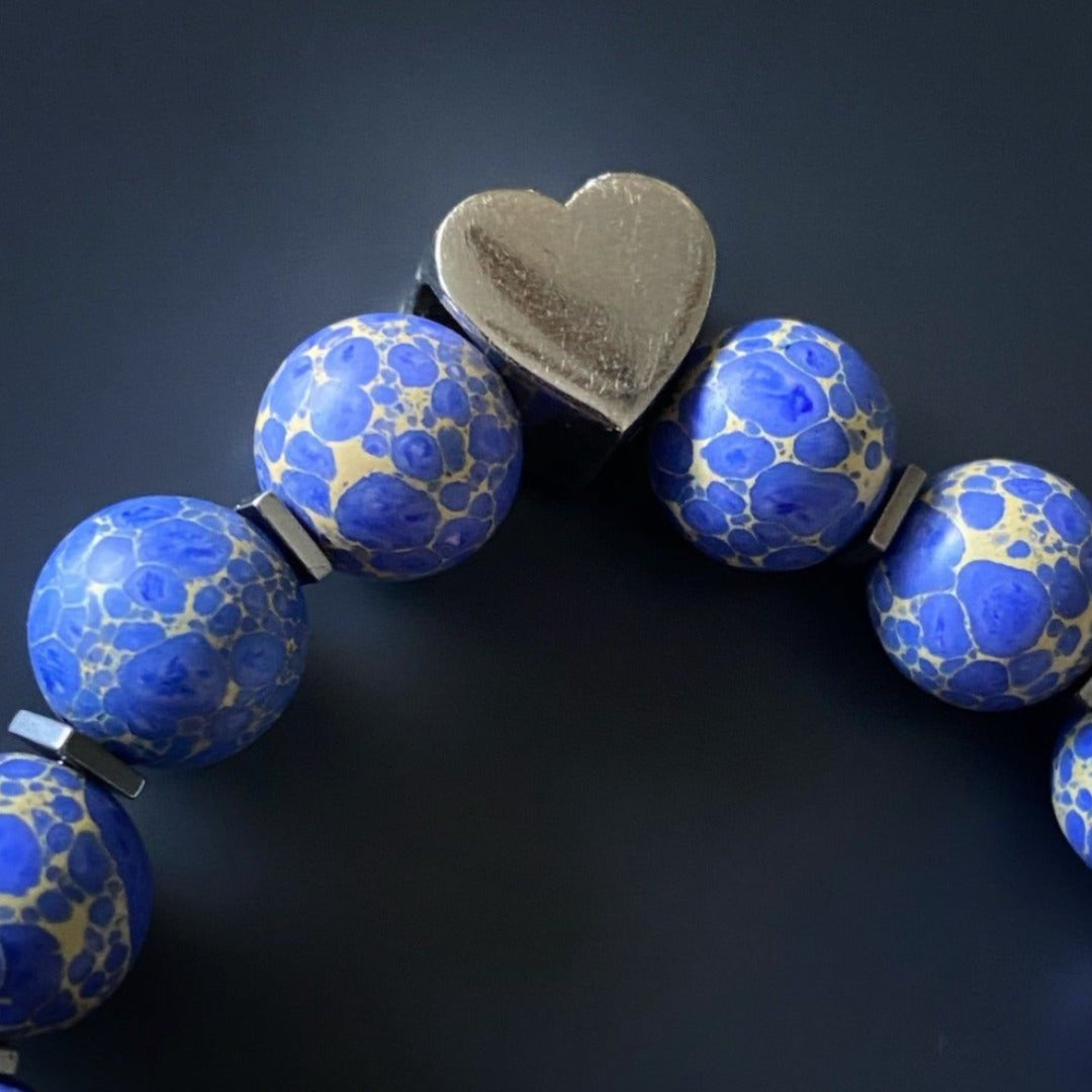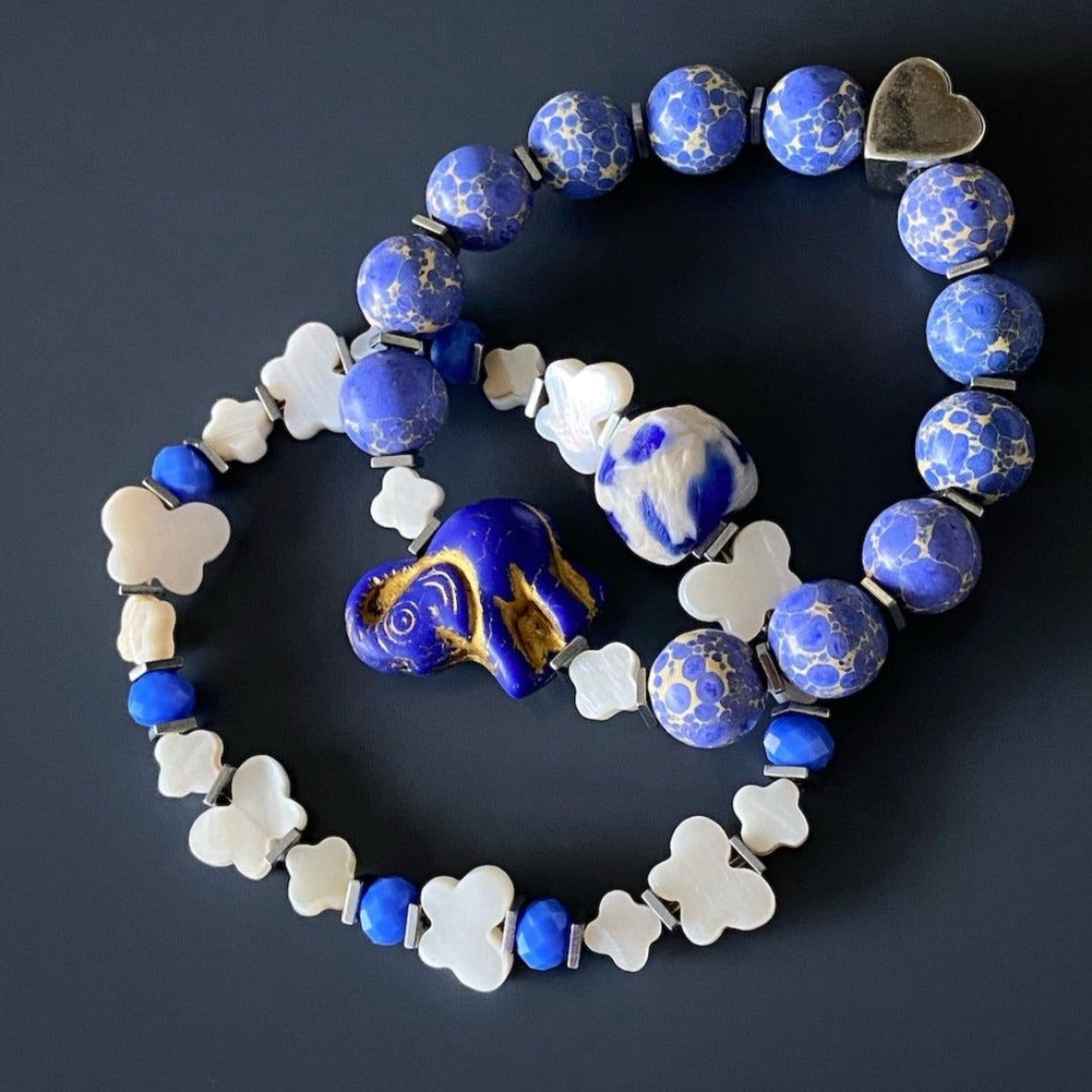 This beaded bracelet set is handmade with 8mm blue Jasper stone beads, silver hematite stone spacers, pearl butterfly and flower beads, a handmade African elephant bead, blue crystals, and a 925 sterling silver heart charm. The bracelet size is 6.5 inches.
