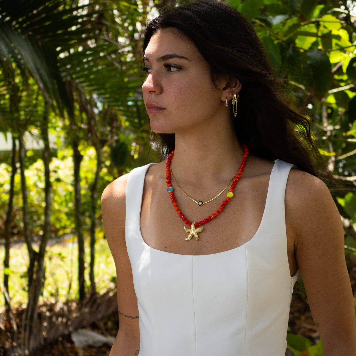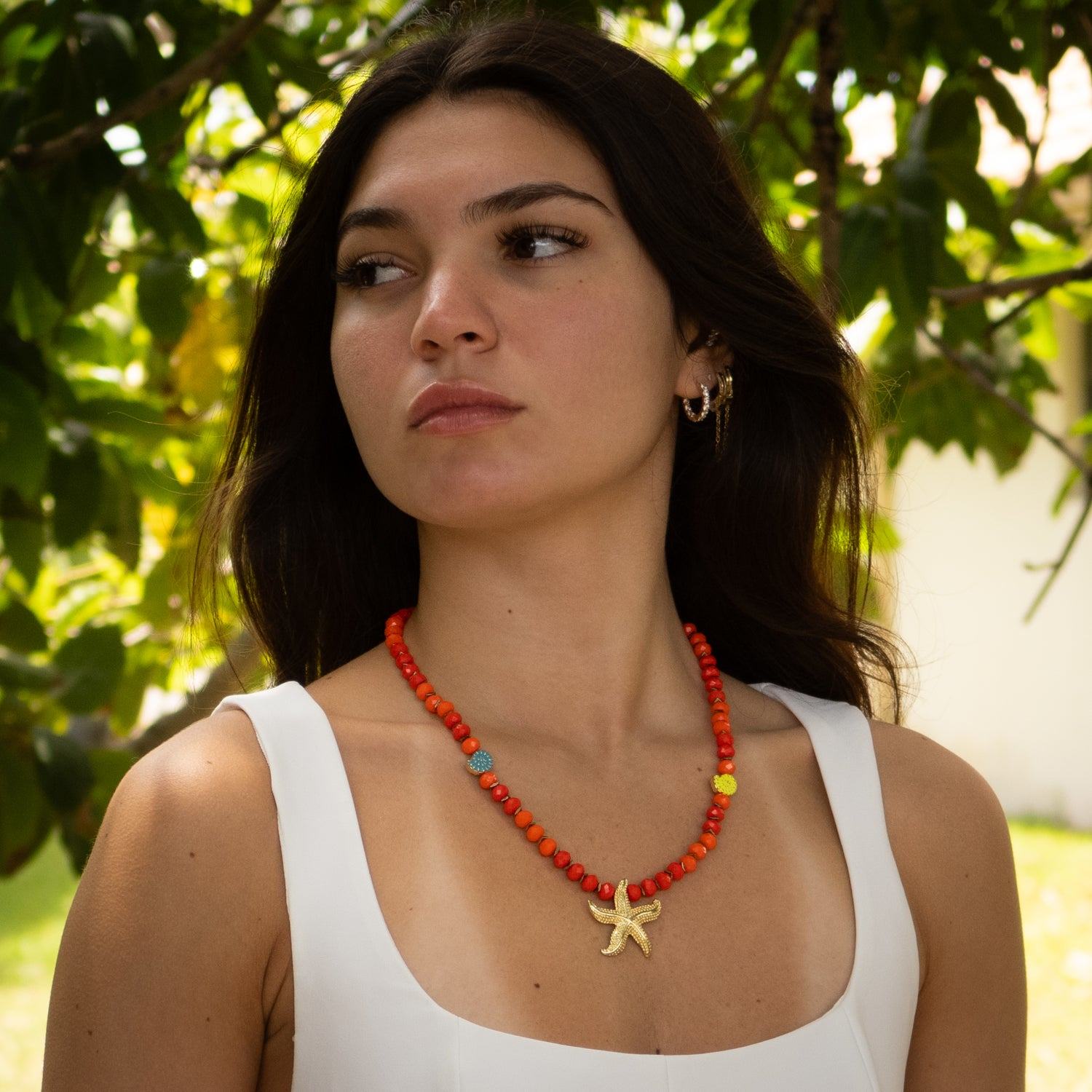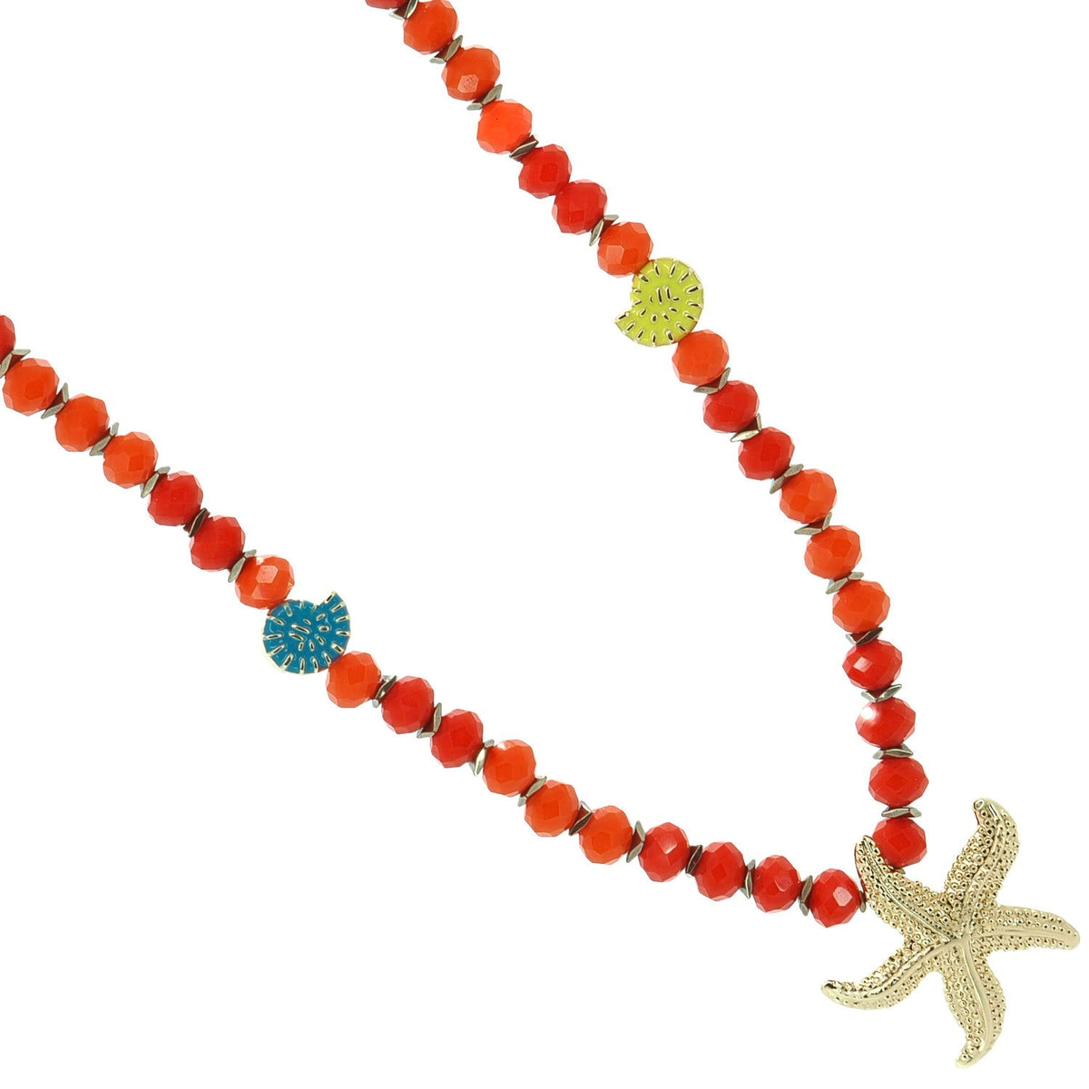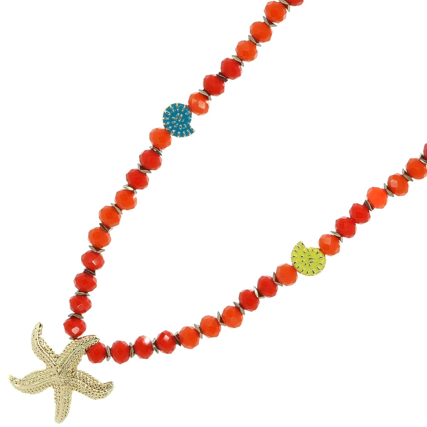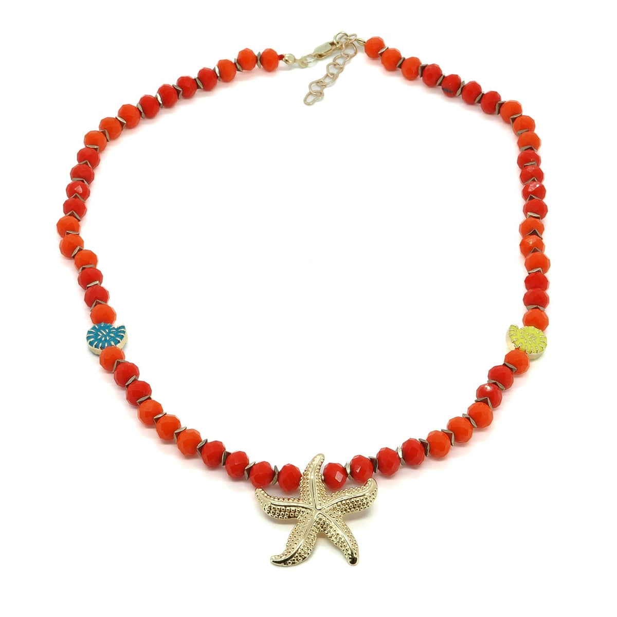 This beaded necklace is handcrafted with red and orange crystal beads. It has an 18-karat gold-plated starfish pendant and shell enamel charms. It also has a 1.5-inch heart-shaped extender. The necklace length is 20 inches, and the pendant is 1.5 inches high and wide.