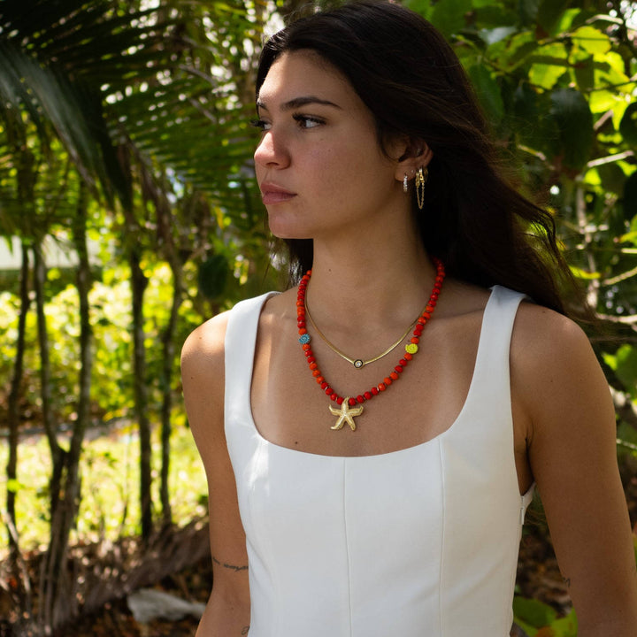 The Summer Joy Starfish & Shell Beaded Necklace - Red by Ebru Jewelry is a vibrant and playful necklace. Handcrafted with faceted red and orange crystal beads, this necklace features a dazzling 18-karat gold-plated starfish pendant and shell enamel charms. The necklace is adjustable with a heart-shaped extender, making it perfect for summer adventures.